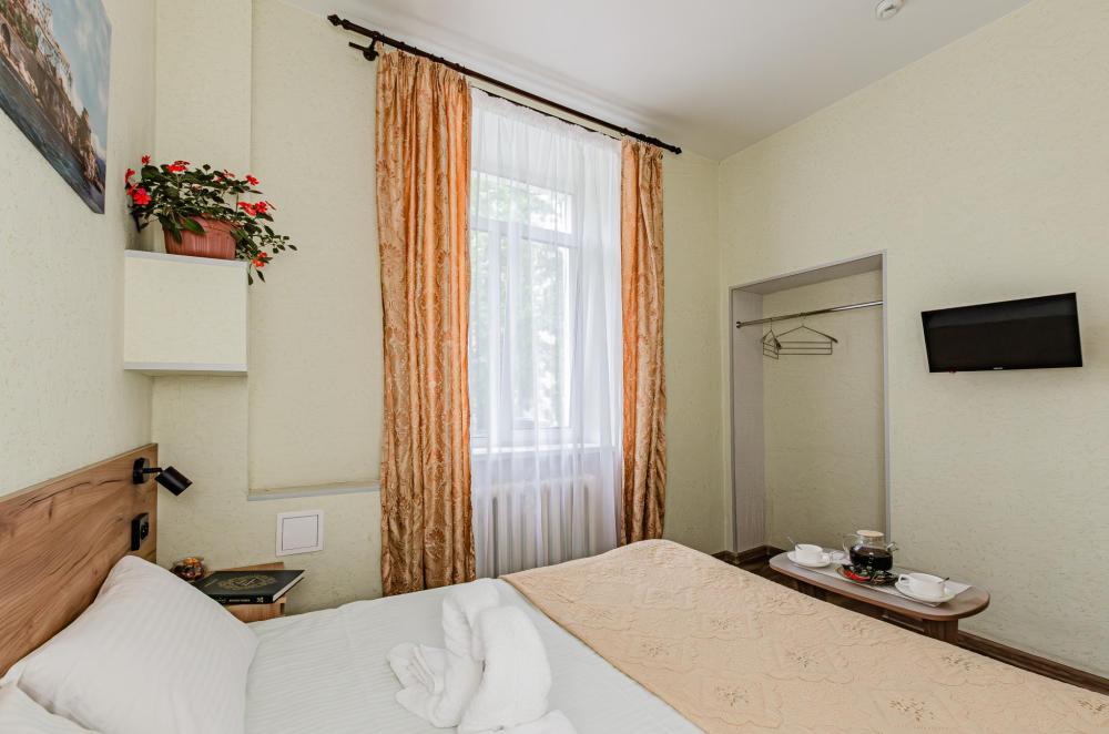 Номер с двумя раздельными кроватями, раковиной светильником, небольшим столиком, местом для хранения вещей. Удобства на этаже.