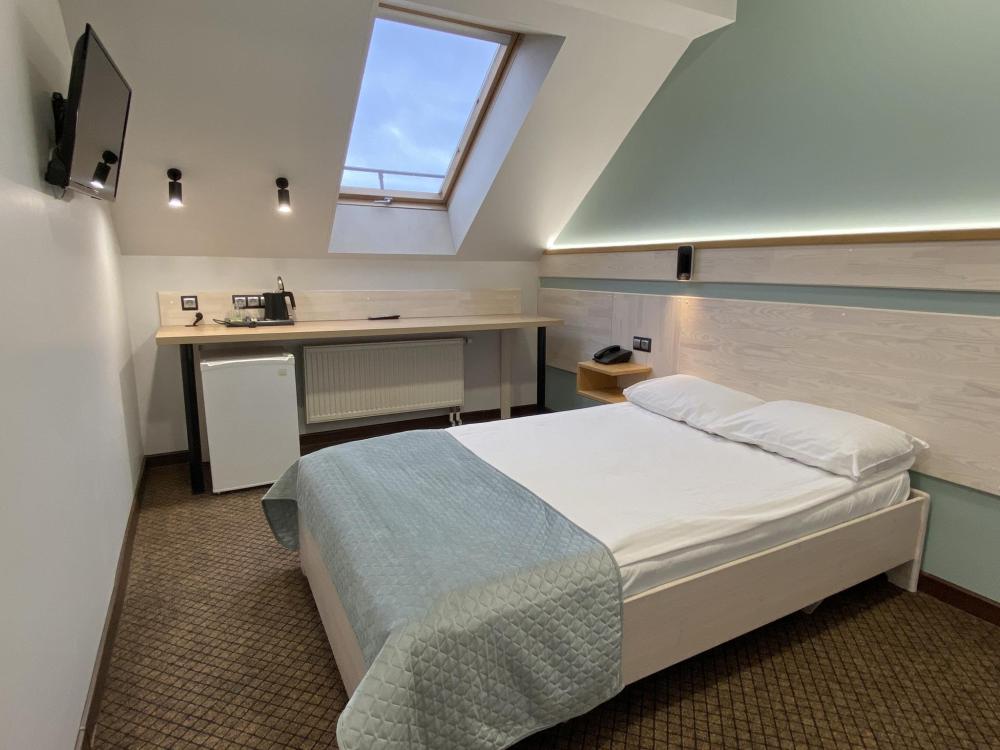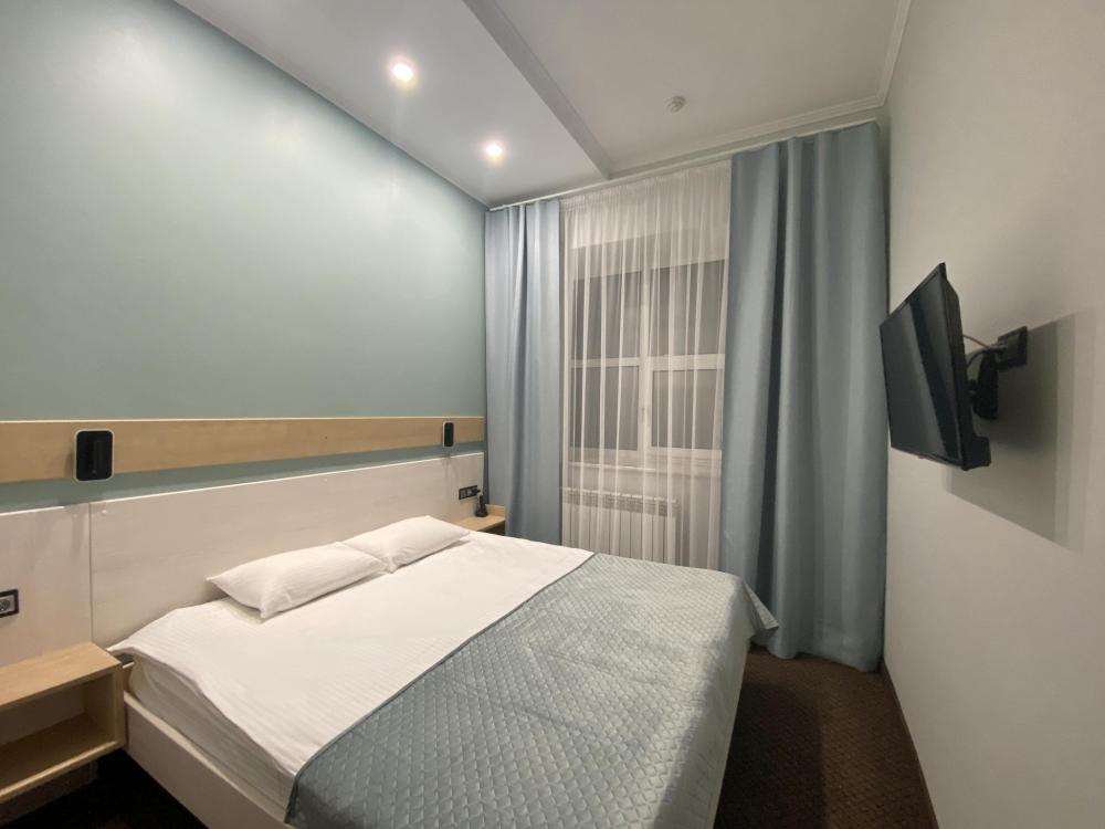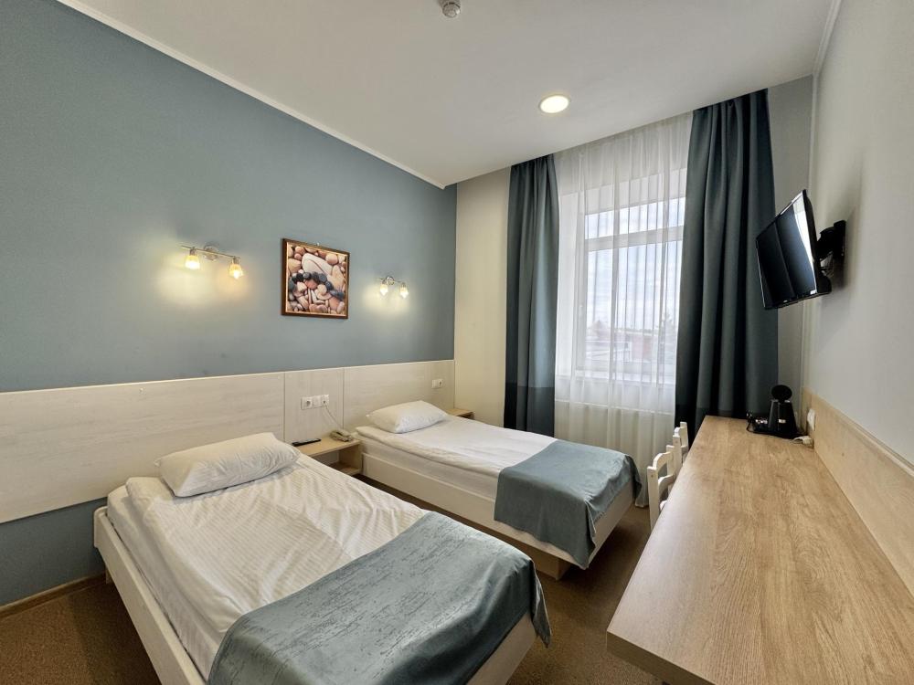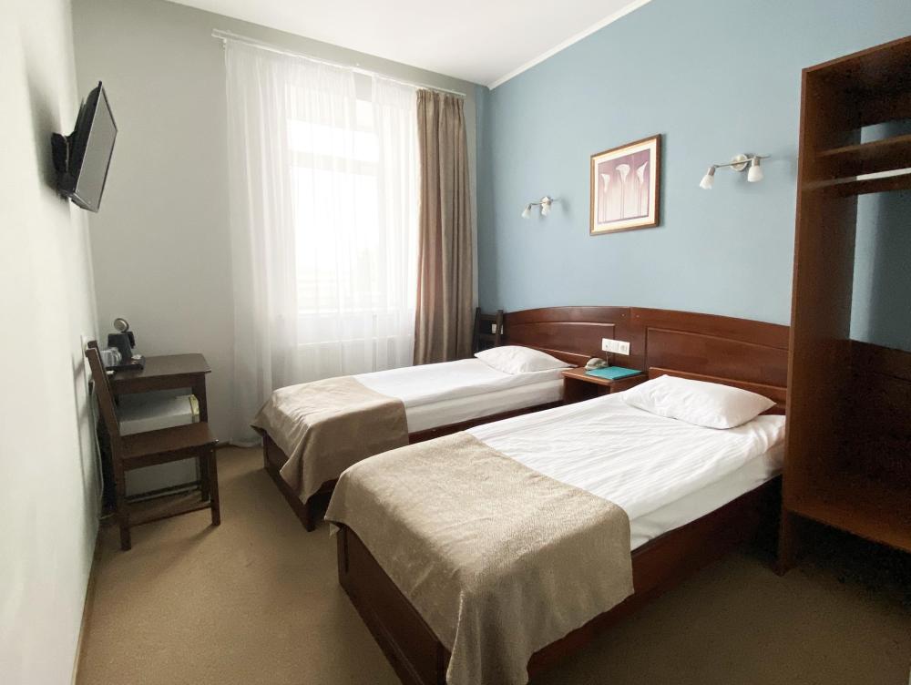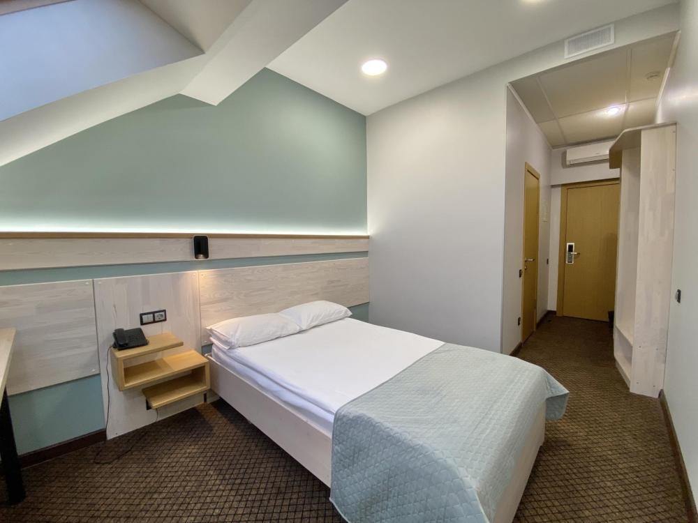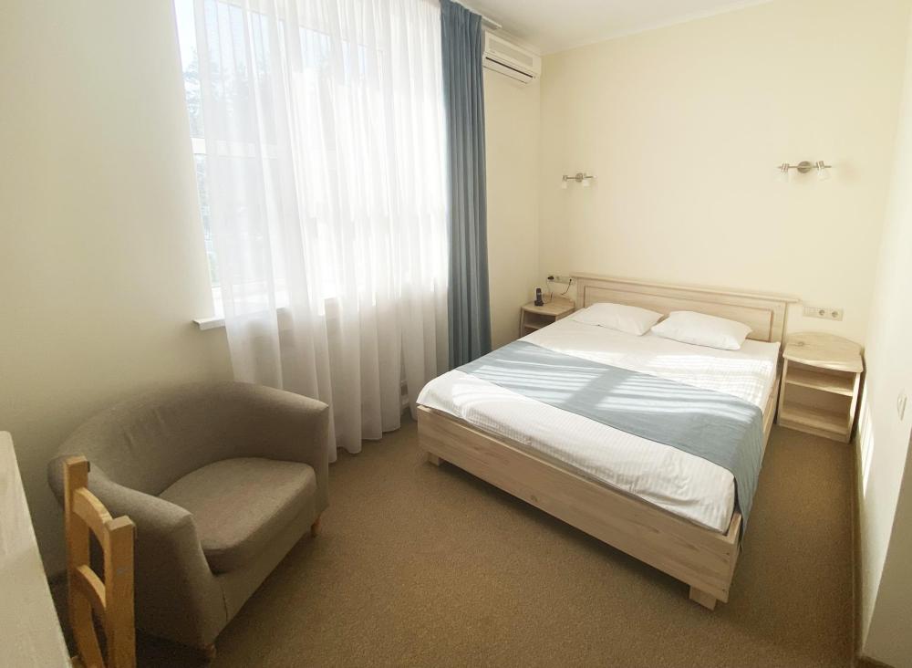 Стандартные уютные номера рассчитанные на проживание 1-го человека. Номера укомплектованы: просторной двуспальной кроватью, ЖК-телевизором, душевой, сан. узлом, выходом в Интернет. Общая площадь номера – 17 кв. м.