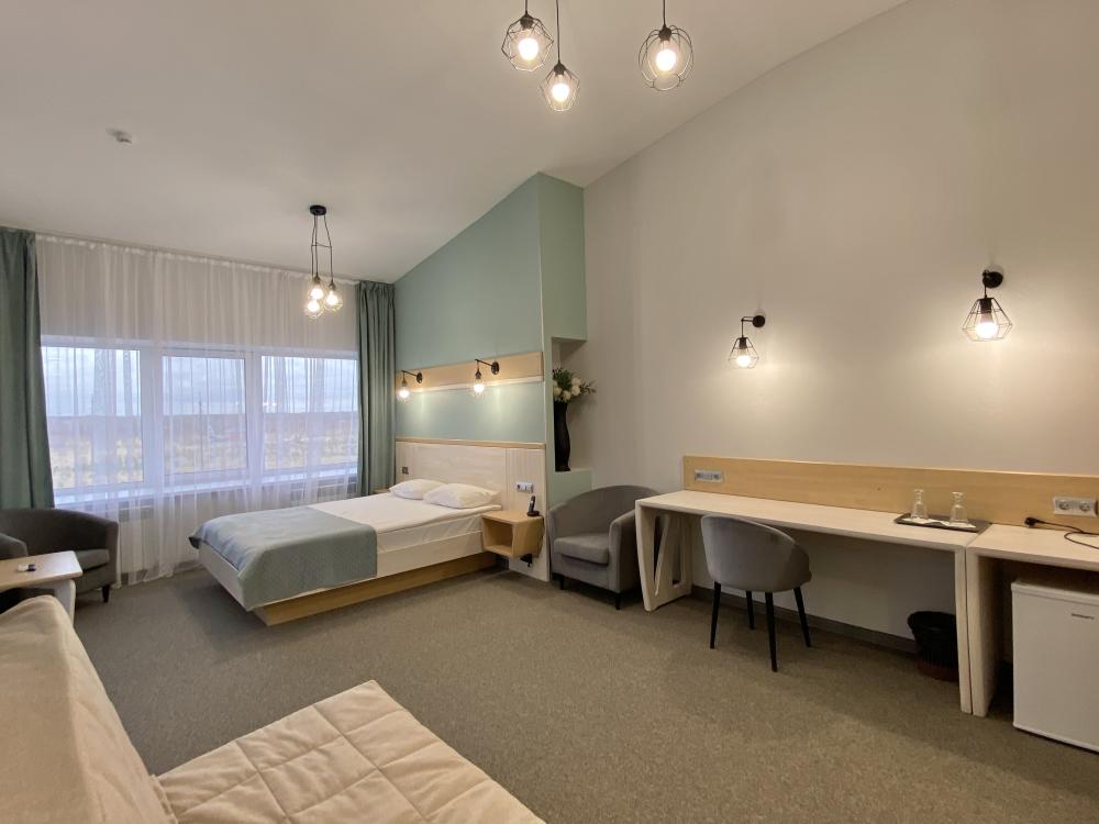 Комфортные двухкомнатные номера, состоящие из гостиной зоны и спальной комнаты. В каждом номере: просторная двуспальная кровать, раскладной диван, 2 ЖК-телевизора, сейф, фен, холодильник, душевая. Общая площадь номера – 40 кв.м.
