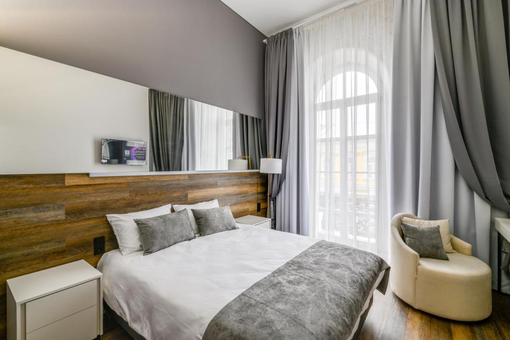 Номер «Комфорт» идеально подойдет для тех, кто ценит комфорт и уют. Интерьер выполнен в стиле минимализма с акцентными деталями, который проявляется в четких, простых линиях и отсутствии лишних деталей.