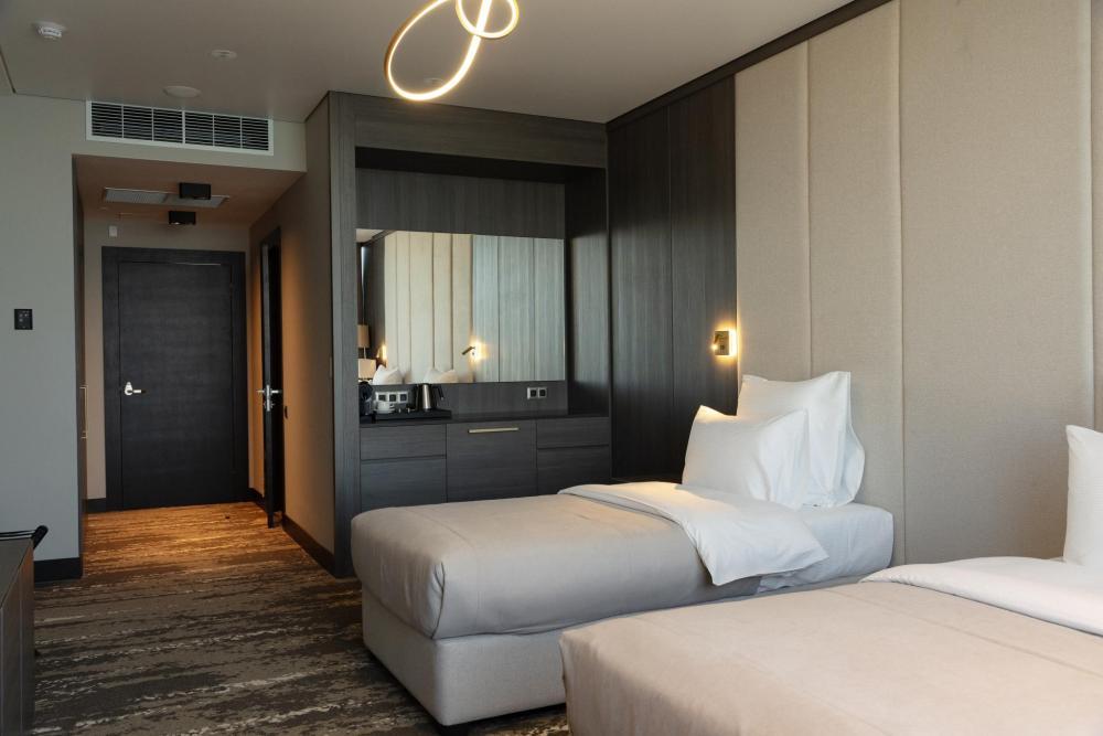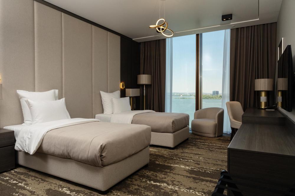 Просторный однокомнатный номер 35 м2 - идеальное решение для деловых путешественников, пар или друзей, желающих разделить незабываемые моменты в атмосфере комфорта и стиля. Две односпальные кровати размером 100×200 см обеспечат вам безупречный отдых. Каждая кровать оборудована премиальным ортопедическим матрасом для максимального комфорта. Панорамные окна открывают захватывающие виды на современную архитектуру Казани или живописную акваторию с величественным Кремлём на противоположном берегу. Полное оснащение для удобства гостей: высокоскоростной Wi-Fi для успешной работы, современная система климат-контроля, удобная рабочая зона, сейф для ценных вещей, современная ванная комната с премиальными косметическими принадлежностями, чайный уголок с набором напитков.