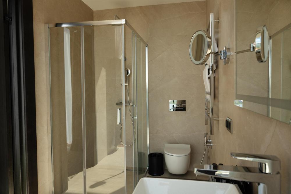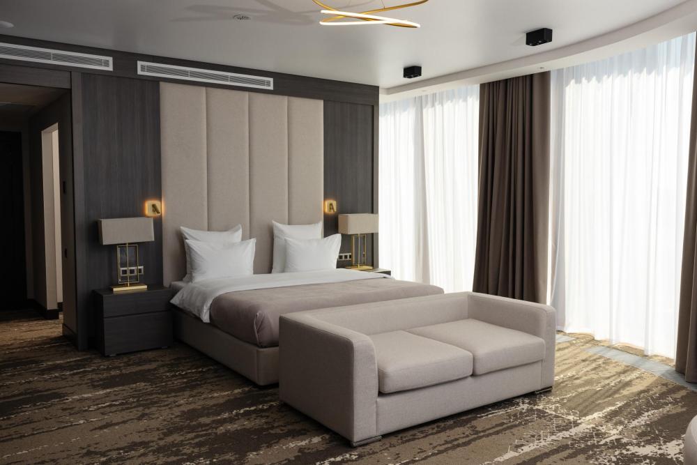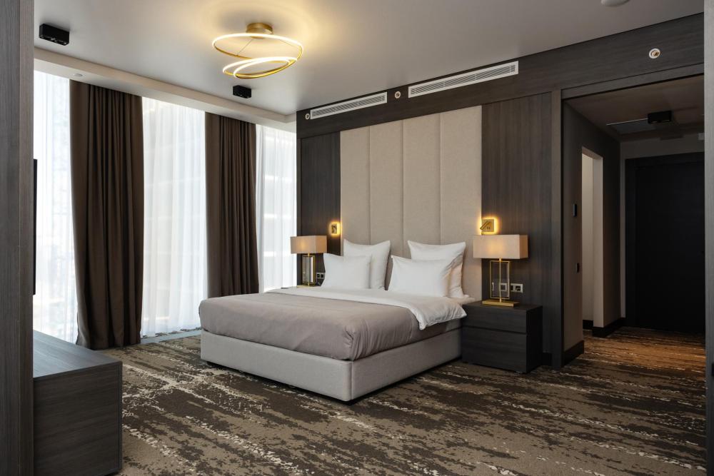 Джуниор Сюит - элегантный номер с панорамным видом на современную архитектуру Казани. Джуниор Сюит представляет собой однокомнатный номер 56 м2, где современный дизайн гармонично сочетается с комфортом премиум-класса. Просторное помещение наполнено естественным светом благодаря панорамным окнам в пол. В центре номера располагается кровать king-size с ортопедическим матрасом. Душевая зона с панорамными окнами создает особую атмосферу при принятии душа. Современная сантехника, продуманное освещение и превосходный дизайн создают ощущение спа-салона. Полное оснащение для удобства гостей: высокоскоростной Wi-Fi для успешной работы, современная система климат-контроля, удобная рабочая зона, сейф для ценных вещей, современная ванная комната с премиальными косметическими принадлежностями, чайный уголок.