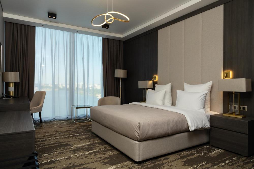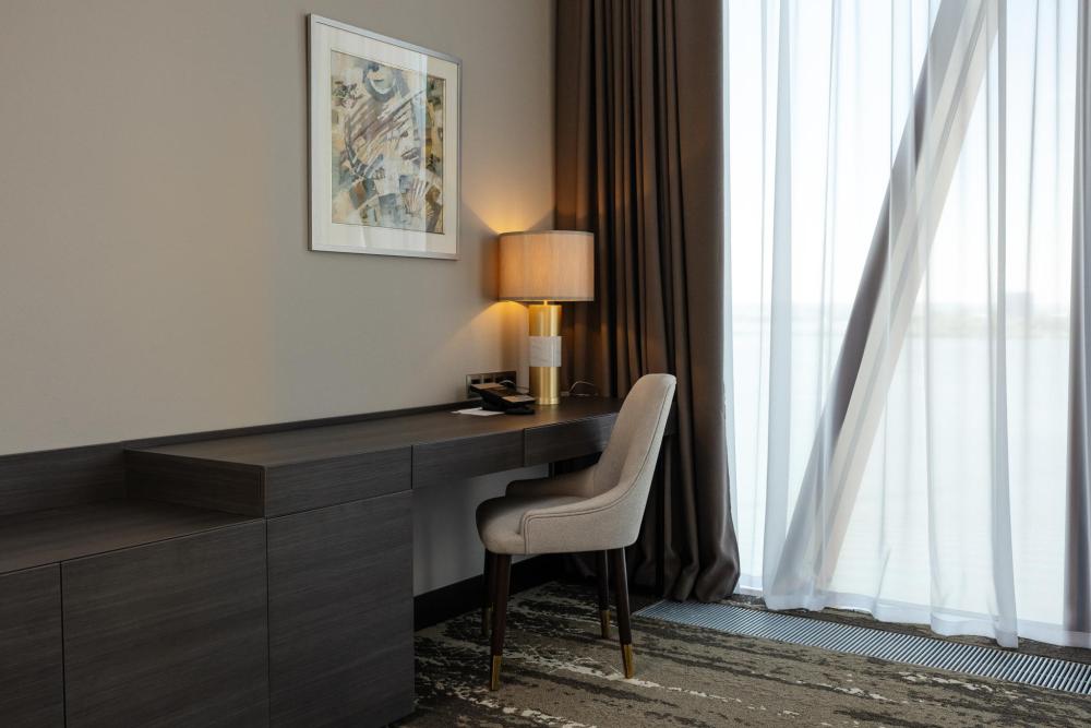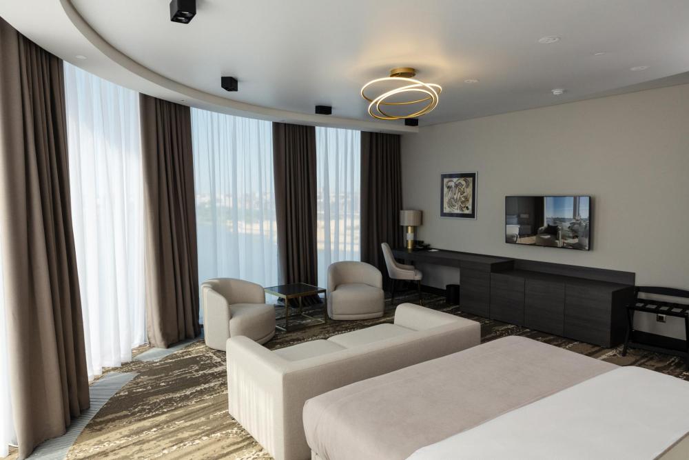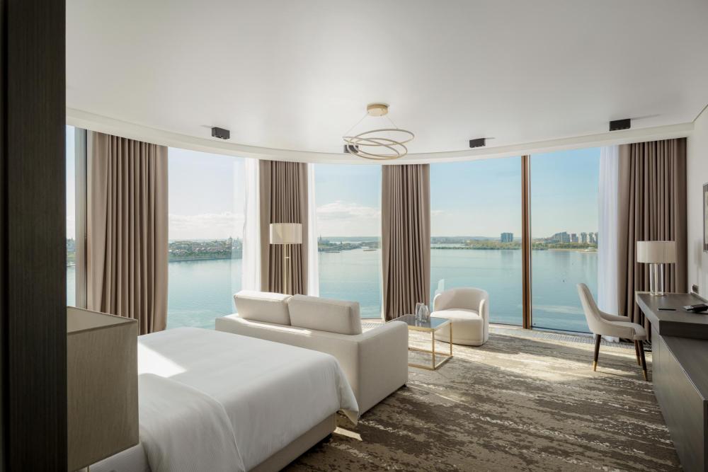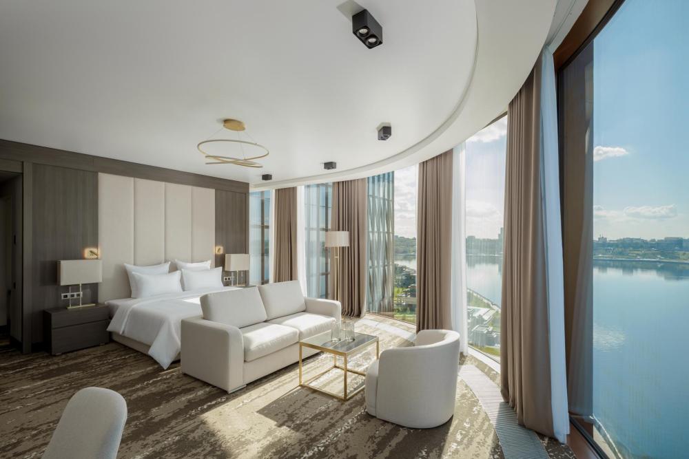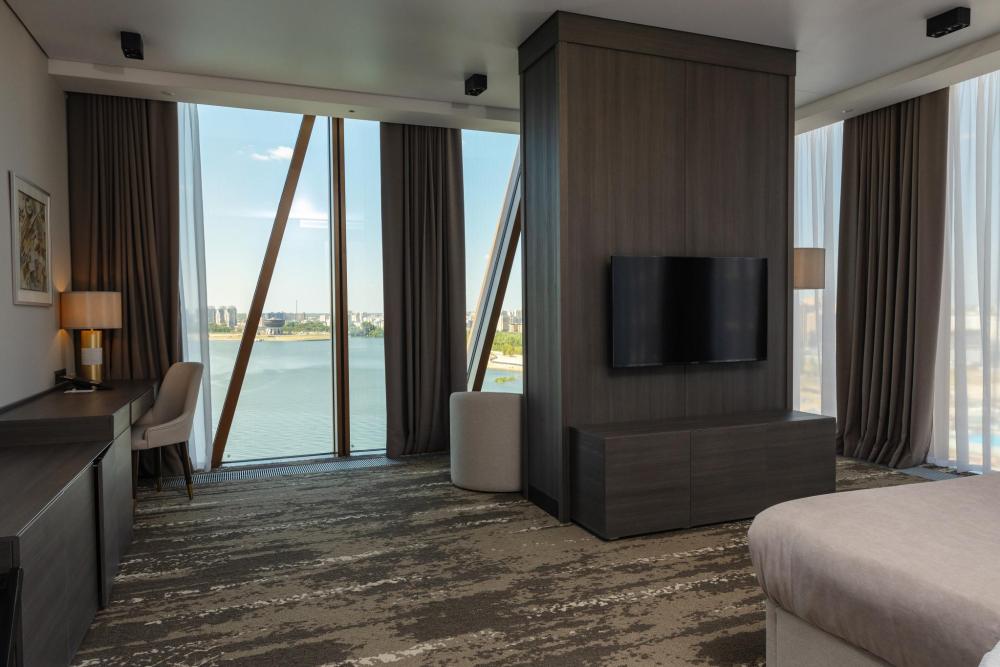 Светлый и просторный номер Джуниор Сюит Премьер 56 м2 создан для тех, кто живёт в ритме мегаполиса, но ценит комфорт и внимание к деталям. Кровать King Size с мягким изголовьем оборудована ортопедическим матрасом. В номере удобно поработать с ноутбуком, подготовиться к важной презентации или почитать книгу. Гардеробная зона скроет объем вещей, чтобы не отвлекать гостя от спокойного интерьера. Душевая зона с панорамными окнами создает особую атмосферу при принятии душа. Панорамные окна открывают захватывающие виды на живописную акваторию с величественным Кремлём на противоположном берегу. Полное оснащение для удобства гостей: высокоскоростной Wi-Fi для успешной работы, современная система климат-контроля, удобная рабочая зона, сейф для ценных вещей, современная ванная комната с премиальными косметическими принадлежностями, чайный уголок.