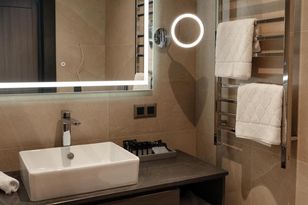 Бизнес-номер с king-size кроватью - просторные 35 квадратных метров наполнены светом и элегантностью, где каждая деталь создана для безупречного отдыха. В центре номера располагается кровать king-size с ортопедическим матрасом. Панорамные окна открывают захватывающие виды на современную архитектуру Казани или живописную акваторию с величественным Кремлём на противоположном берегу. Полное оснащение для удобства гостей: высокоскоростной Wi-Fi для успешной работы, современная система климат-контроля, удобная рабочая зона, сейф для ценных вещей, современная ванная комната с премиальными косметическими принадлежностями, чайный уголок.