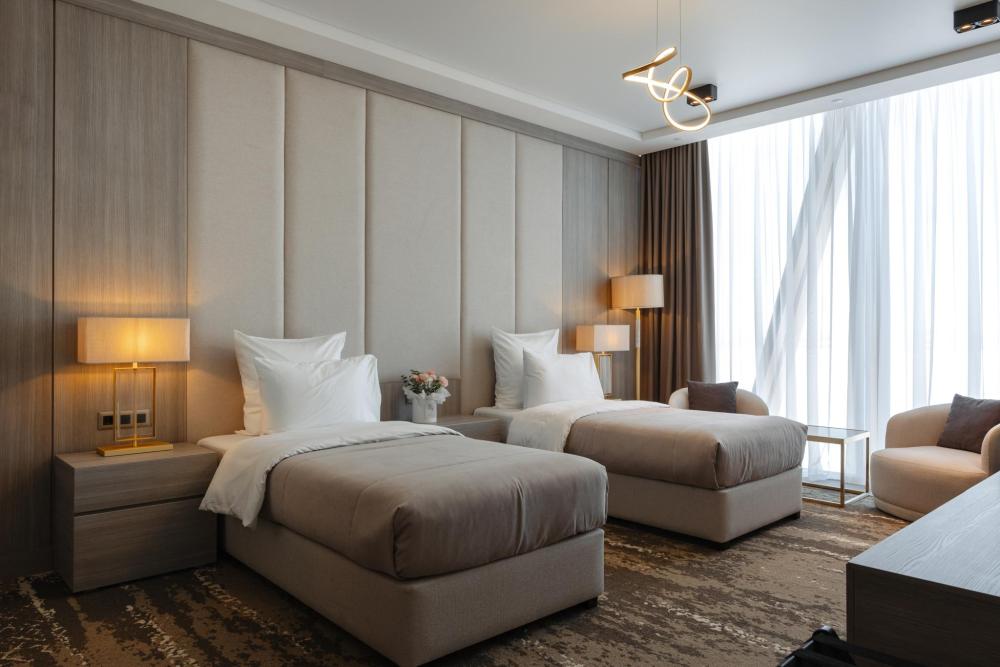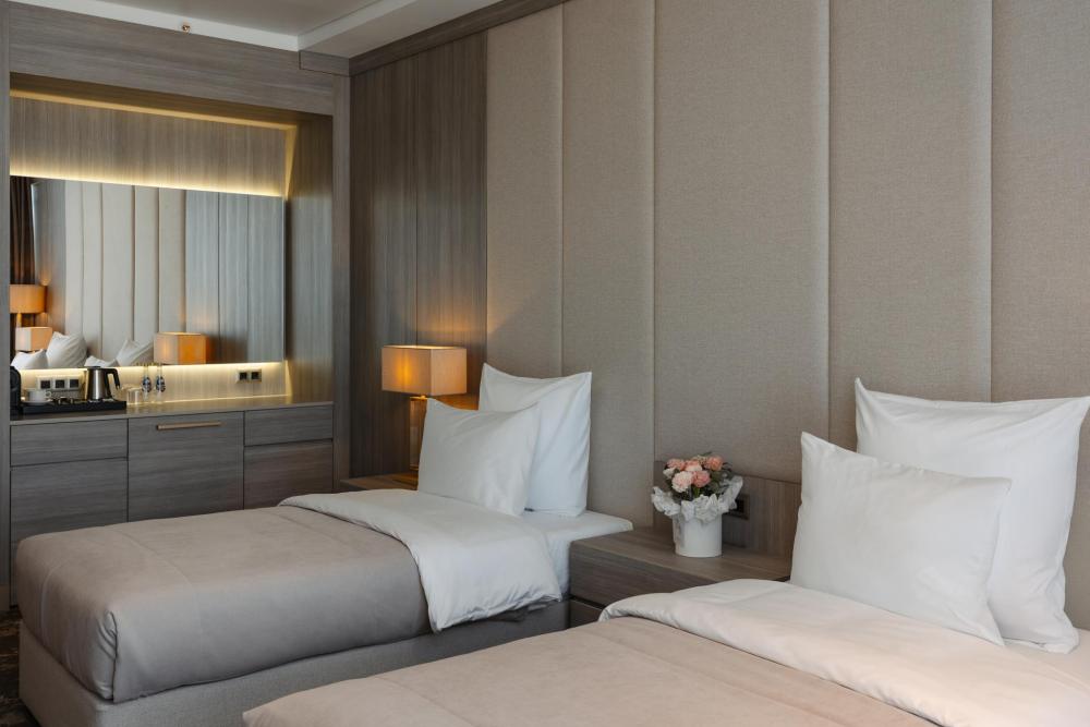 Просторный номер площадью 35 м² с большой двумя односпальными кроватями и видом на историческую часть города и Казанку или мост «Миллениум». Идеальное пространство для тех, кто ценит лаконичную элегантность и комфорт. Здесь каждый элемент создан для продуктивного и одновременно расслабленного отдыха. Утро можно начать с чашки свежесваренного кофе из капсульной кофемашины, наслаждаясь панорамным видом. В номере идеально организовано рабочее пространство: для работы с ноутбуком или для деловой беседы на комфортабельных креслах, а стабильный Wi-Fi и система кондиционирования прекрасно его дополнят. После насыщенного рабочего дня тёплый душ восстановит силы, а панорамный вид на вечернюю Казань создаст приятную атмосферу для спокойного отдыха.