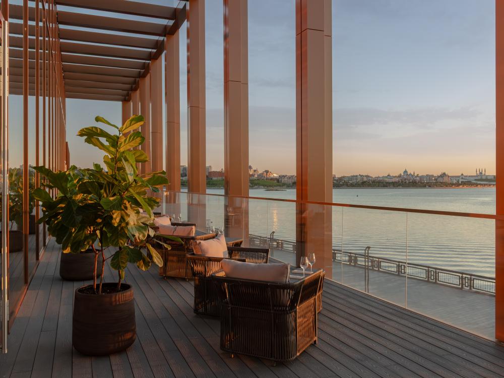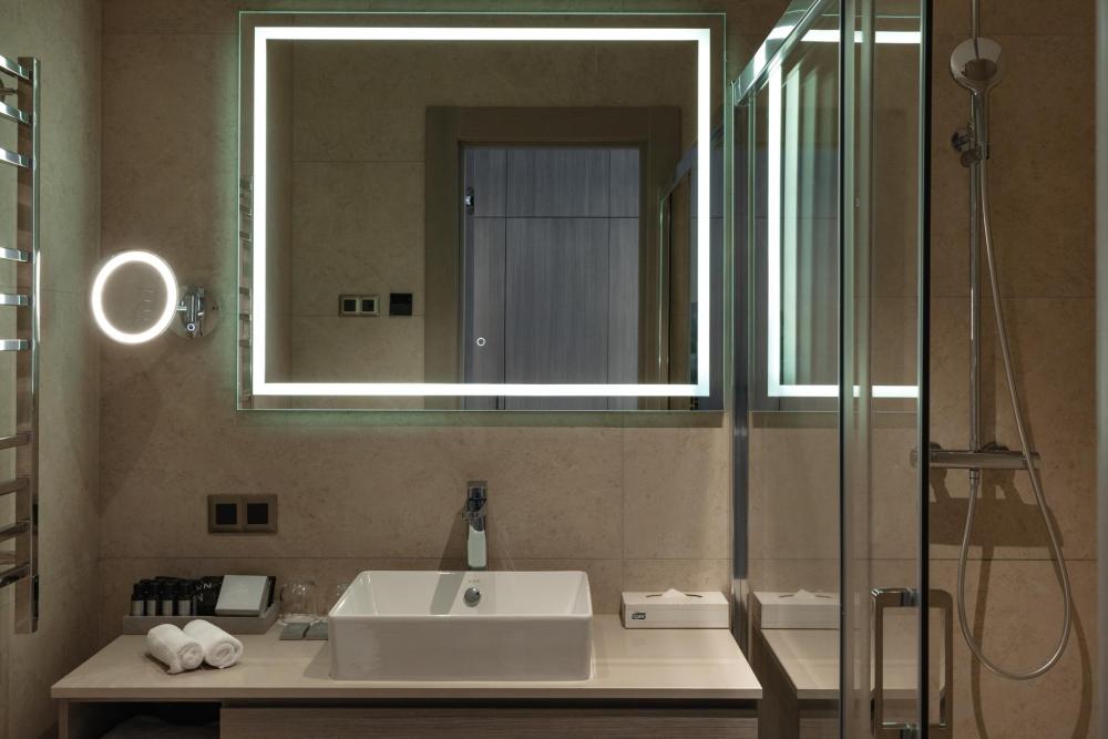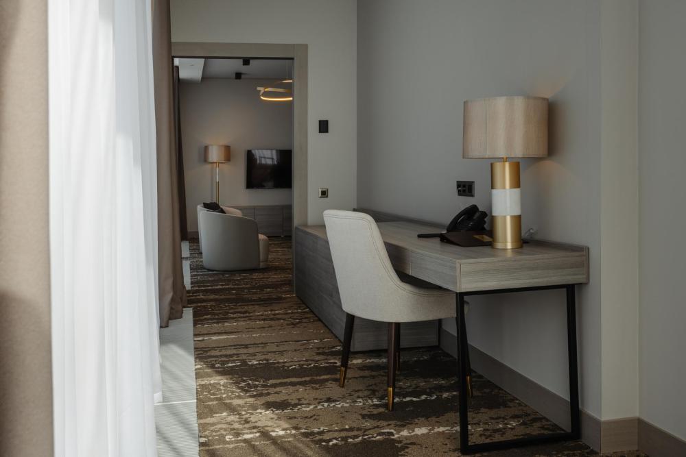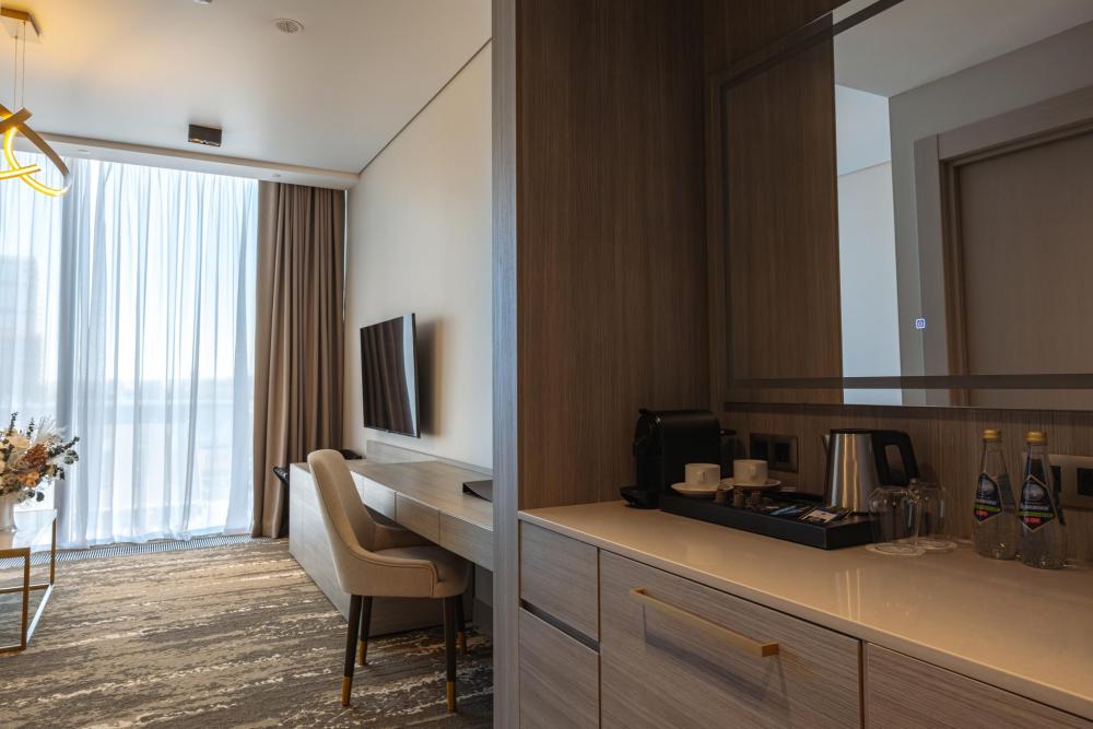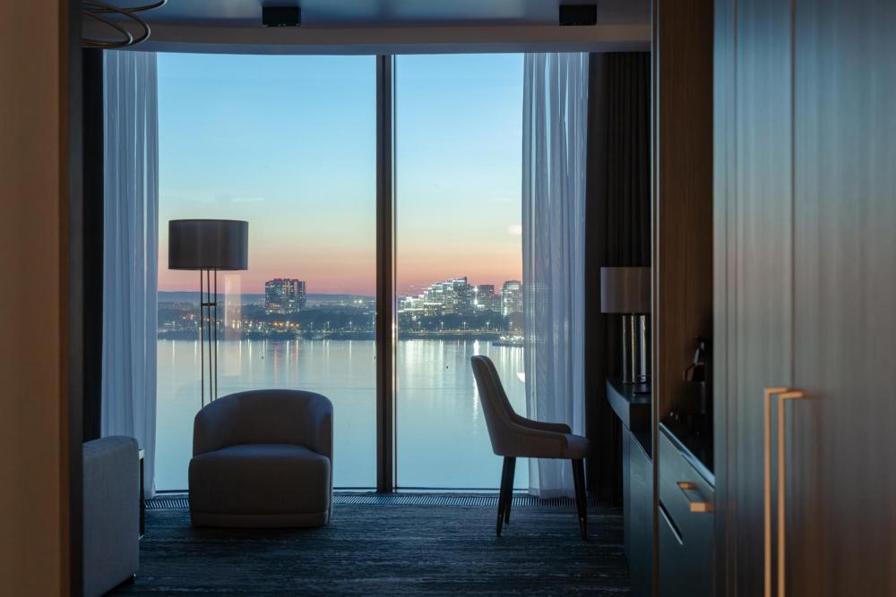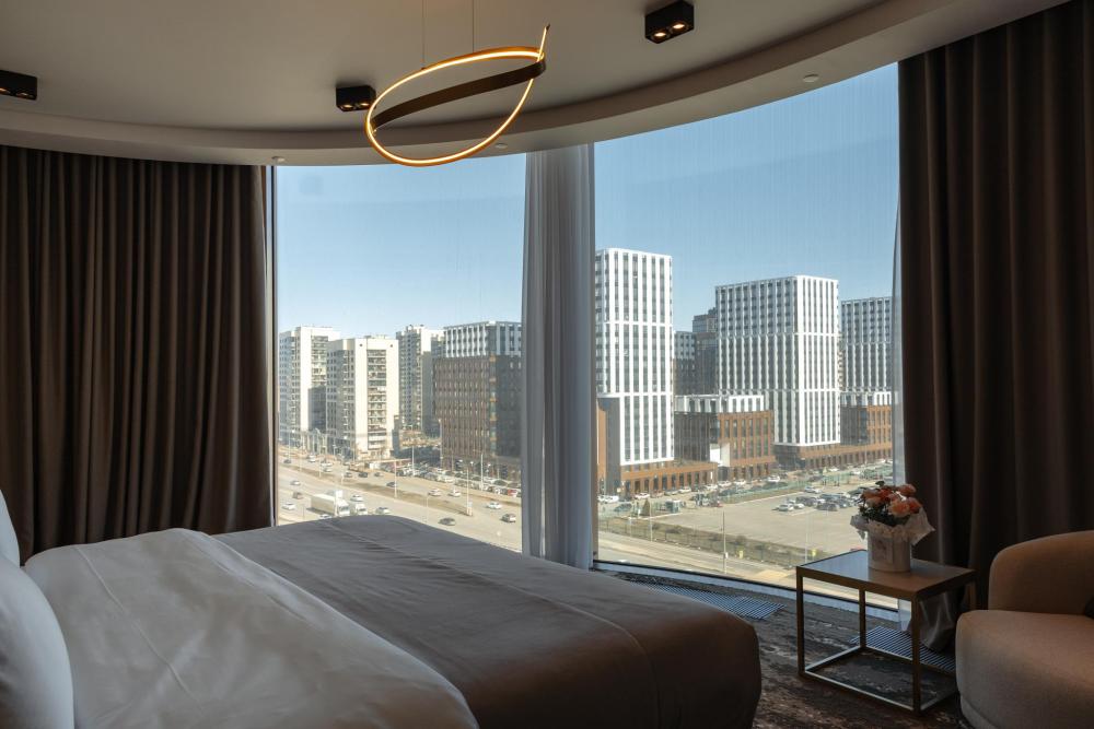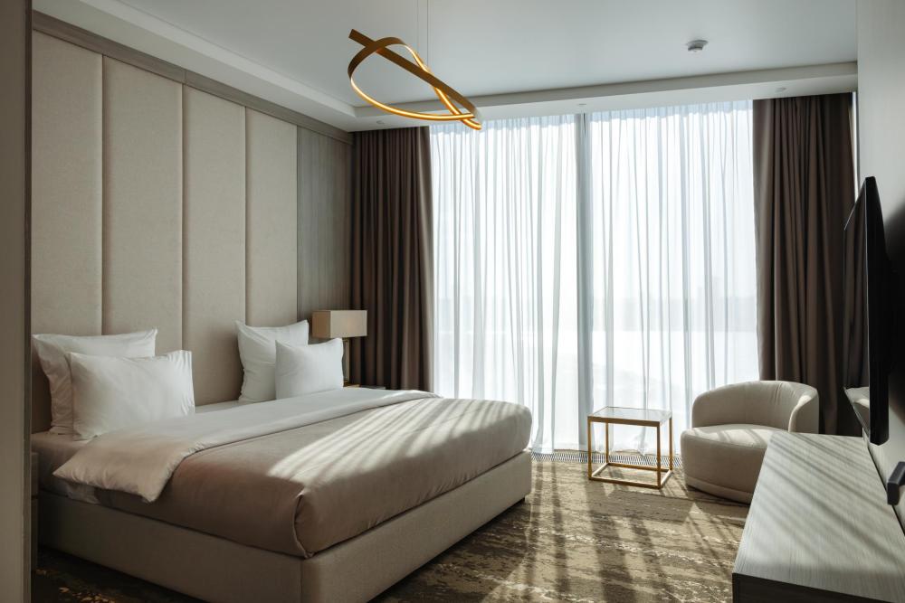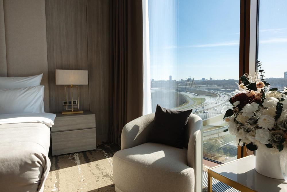 Просторный номер площадью 35 м² с большой двуспальной кроватью и видом на историческую часть города и Казанку или мост «Миллениум». Идеальное пространство для тех, кто ценит лаконичную элегантность и комфорт. Здесь каждый элемент создан для продуктивного и одновременно расслабленного отдыха. Утро можно начать с чашки свежесваренного кофе из капсульной кофемашины, наслаждаясь панорамным видом. В номере идеально организовано рабочее пространство: для работы с ноутбуком или для деловой беседы на комфортабельных креслах, а стабильный Wi-Fi и система кондиционирования прекрасно его дополнят. После насыщенного рабочего дня тёплый душ восстановит силы, а панорамный вид на вечернюю Казань создаст приятную атмосферу для спокойного отдыха.
