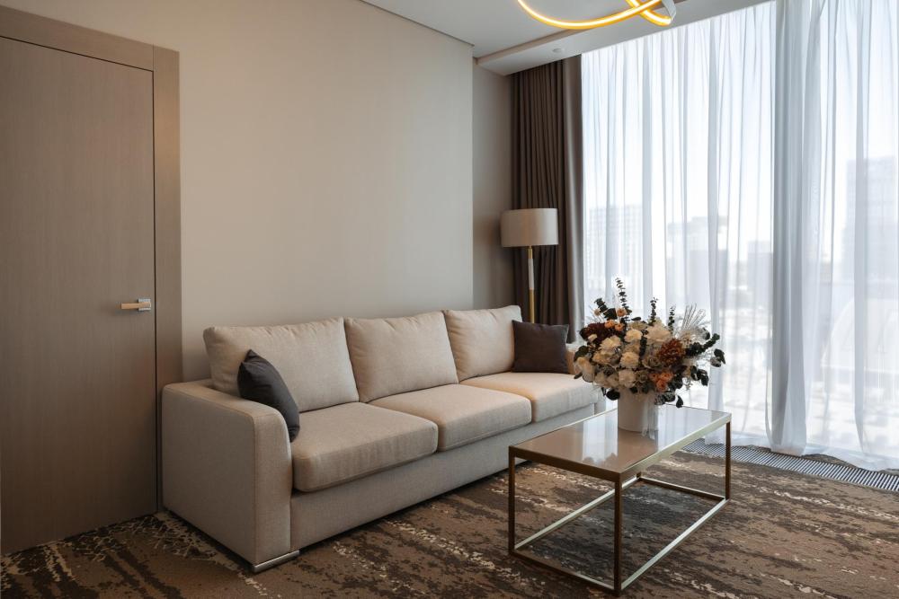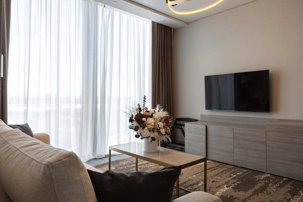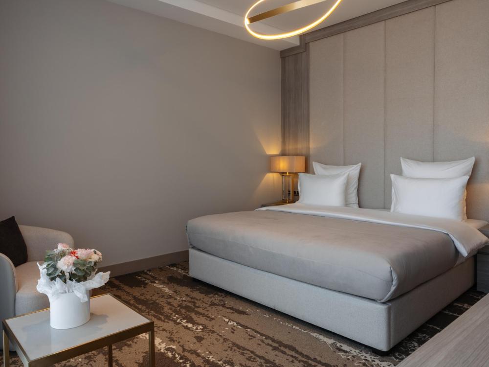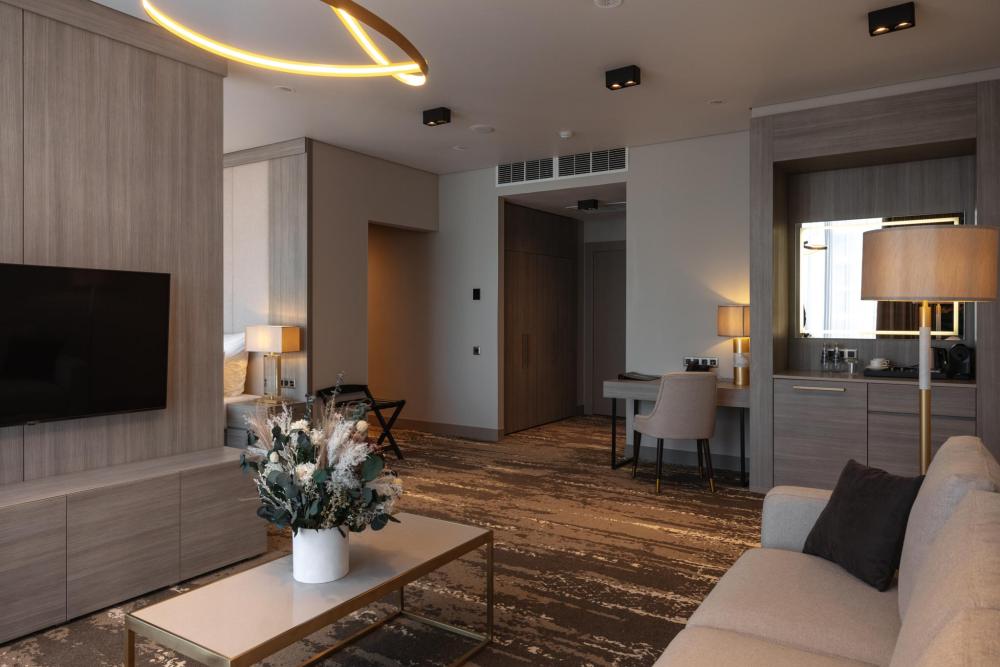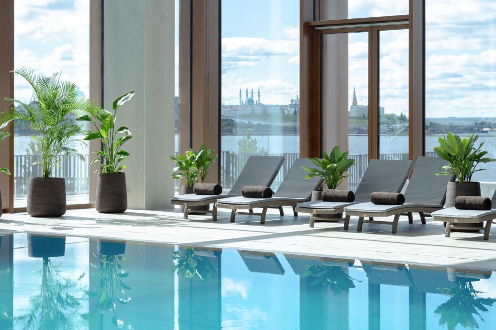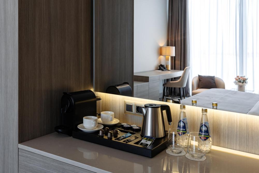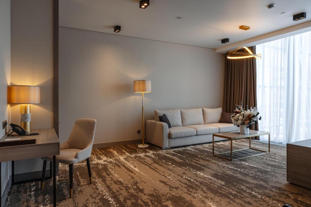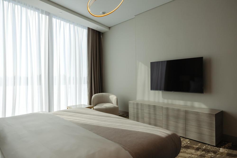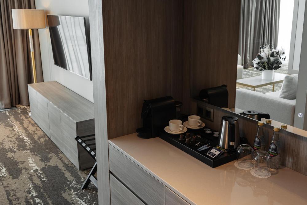 Просторный номер площадью 35 м² с большой двуспальной кроватью и видом на историческую часть города и Казанку или мост «Миллениум». Идеальное пространство для тех, кто ценит лаконичную элегантность и комфорт. Здесь каждый элемент создан для продуктивного и одновременно расслабленного отдыха. Утро можно начать с чашки свежесваренного кофе из капсульной кофемашины, наслаждаясь панорамным видом. В номере идеально организовано рабочее пространство: для работы с ноутбуком или для деловой беседы на комфортабельных креслах, а стабильный Wi-Fi и система кондиционирования прекрасно его дополнят. После насыщенного рабочего дня тёплый душ восстановит силы, а панорамный вид на вечернюю Казань создаст приятную атмосферу для спокойного отдыха.
