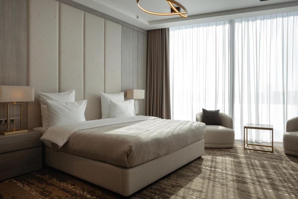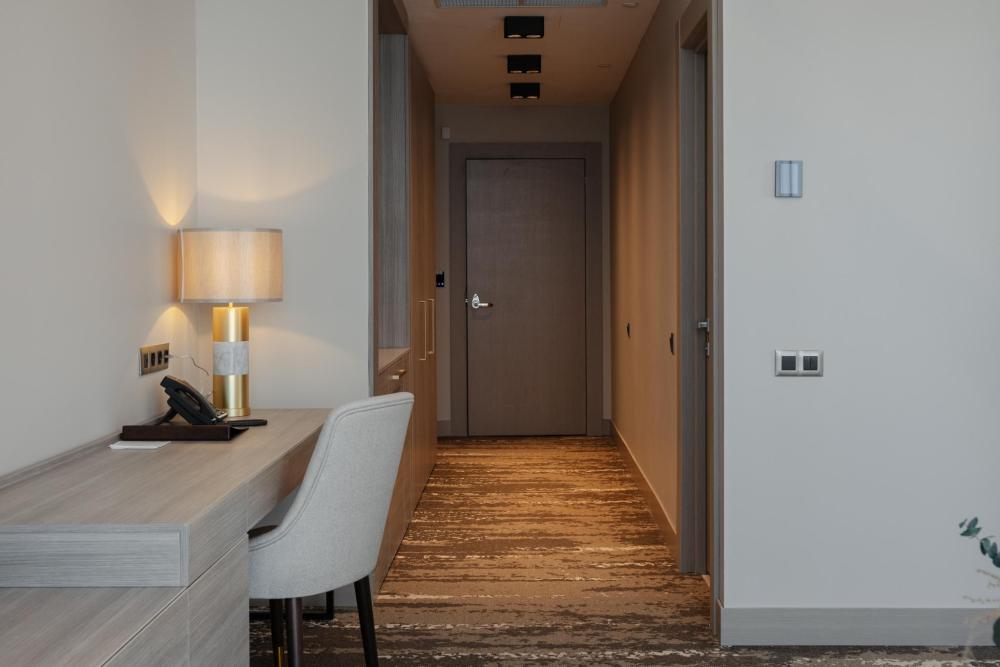 Гранд Делюкс с двуспальной кроватью — это сочетание комфорта, стиля и практичности. Здесь каждая деталь продумана для удобства и максимального расслабления. Этот просторный номер с грамотно спланированным пространством подарит ощущение свободы и уединения. Функционально разделённые зоны создают уютную атмосферу, в которой вы сможете полноценно отдохнуть после насыщенного дня. Двуспальная кровать с высококачественным постельным бельём обеспечит вам крепкий сон и полноценный отдых. Продуманная эргономика номера создаёт идеальные условия для расслабления. Два современных телевизора с обширным выбором каналов. Современная ванная комната с душевой кабиной. Также в номере для удобства гостей имеется: высокоскоростной Wi-Fi, кондиционер для поддержания комфортной температуры, сейф для ценных вещей, набор туалетных принадлежностей премиум-класса, халат и тапочки, фен и электрочайник, утюг и гладильная доска.