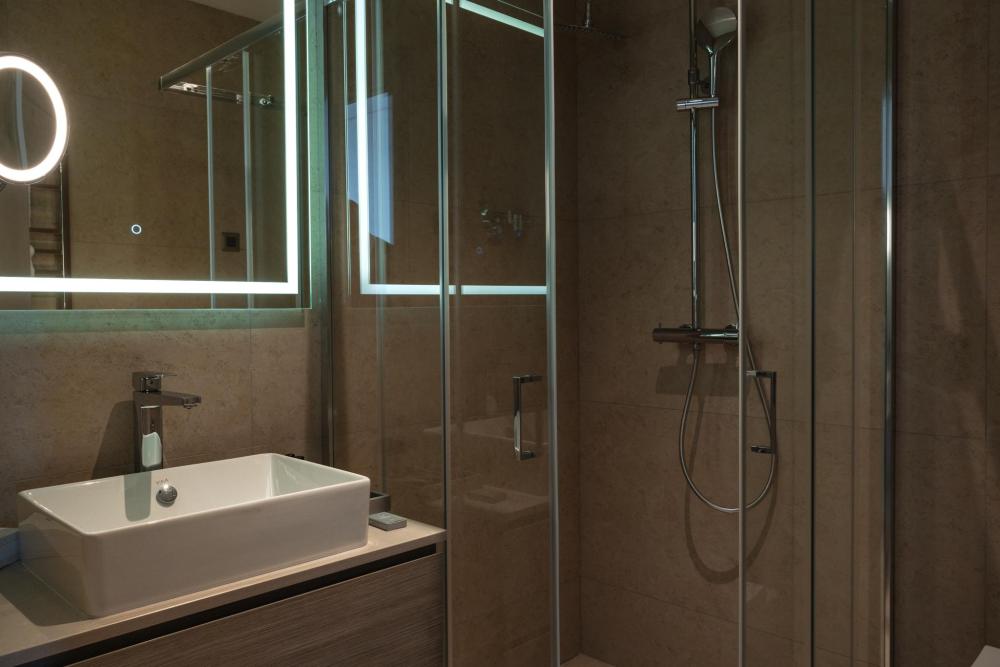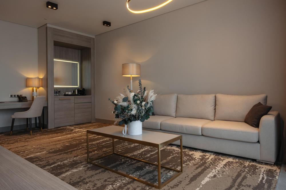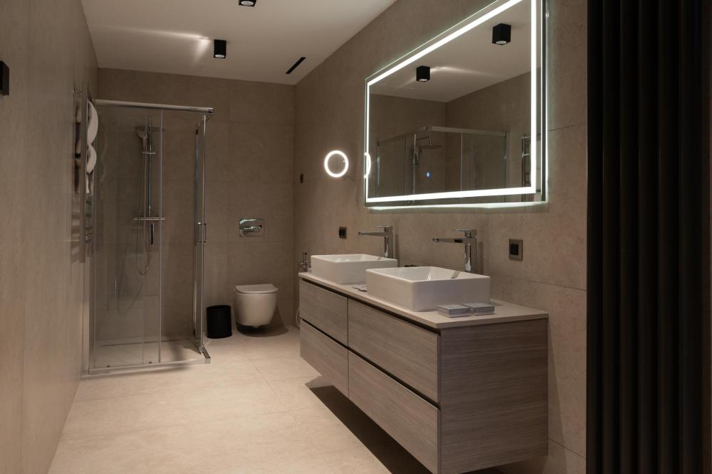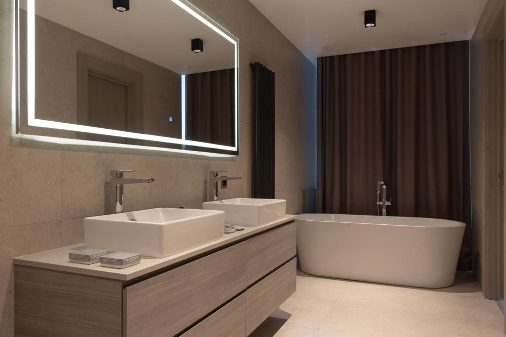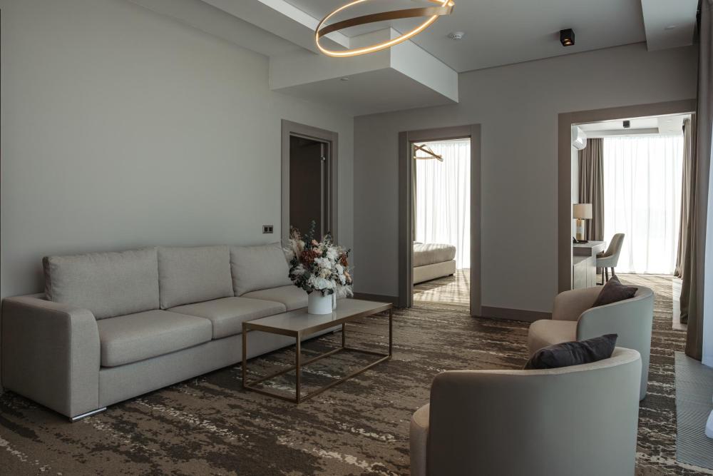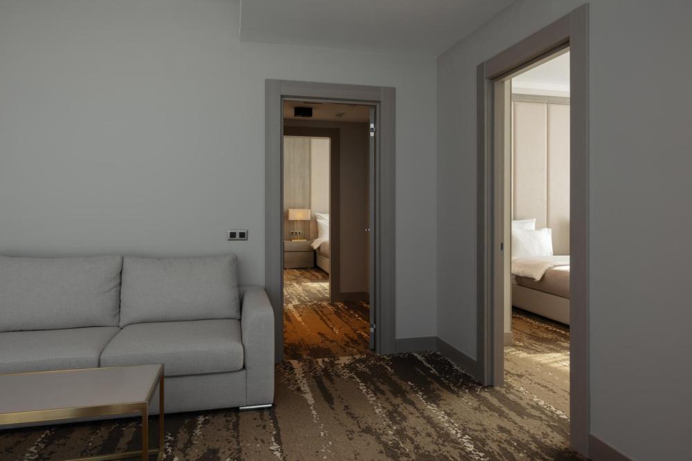 Люкс двухкомнатный с двуспальной кроватью - это пространство, где каждая деталь создана для абсолютного релакса и удовольствия. Двухкомнатный номер с продуманной до мелочей планировкой. В просторной спальне гостей ждёт большая двуспальная кровать с премиальным постельным бельем и ортопедическим матрасом. Гостиная зона с комфортабельным раскладным диваном позволяет разместить еще двоих гостей на дополнительном месте с максимальным удобством. Две ванные комнаты для полного релакса. Первая ванная комната — настоящая жемчужина номера: панорамное окно и полноценная ванна. Вторая ванная комната с современной душевой кабиной. Также в номере для удобства гостей имеется: высокоскоростной Wi-Fi, кондиционер для поддержания комфортной температуры, сейф для ценных вещей, набор туалетных принадлежностей премиум-класса, халат и тапочки, фен и электрочайник, утюг и гладильная доска.