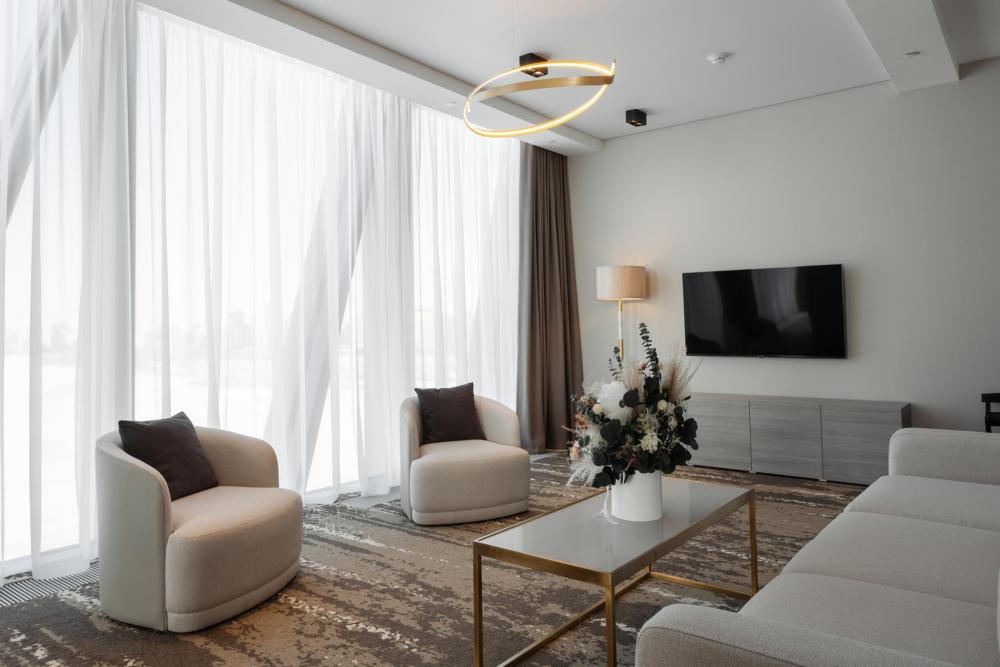 Гранд Люкс трёхкомнатный с двумя двуспальными кроватями - это пространство, где каждая деталь продумана для вашего абсолютного релакса и удовольствия. Трёхкомнатный номер с изысканной планировкой. Гармоничное разделение зон создаёт атмосферу уединения и уюта. Две спальни с большими двуспальными кроватями обеспечат непревзойдённый отдых. Премиальное постельное бельё и продуманная эргономика подарят крепкий и здоровый сон. Особого внимания заслуживает мастер-спальня с собственным санузлом — настоящий оазис уединения и спокойствия, где вы сможете отдохнуть от суеты и насладиться тишиной. Просторная гостиная с элегантным диваном. Отдельное рабочее пространство с современным освещением и эргономичной мебелью. Три современных телевизора, установленные в каждой комнате, позволят каждому гостю наслаждаться любимыми программами независимо от других. Также в номере для удобства гостей имеется: высокоскоростной Wi-Fi, кондиционер для поддержания комфортной температуры, сейф для ценных вещей, набор туалетных принадлежностей премиум-класса, халат и тапочки, фен и электрочайник, утюг и гладильная доска.