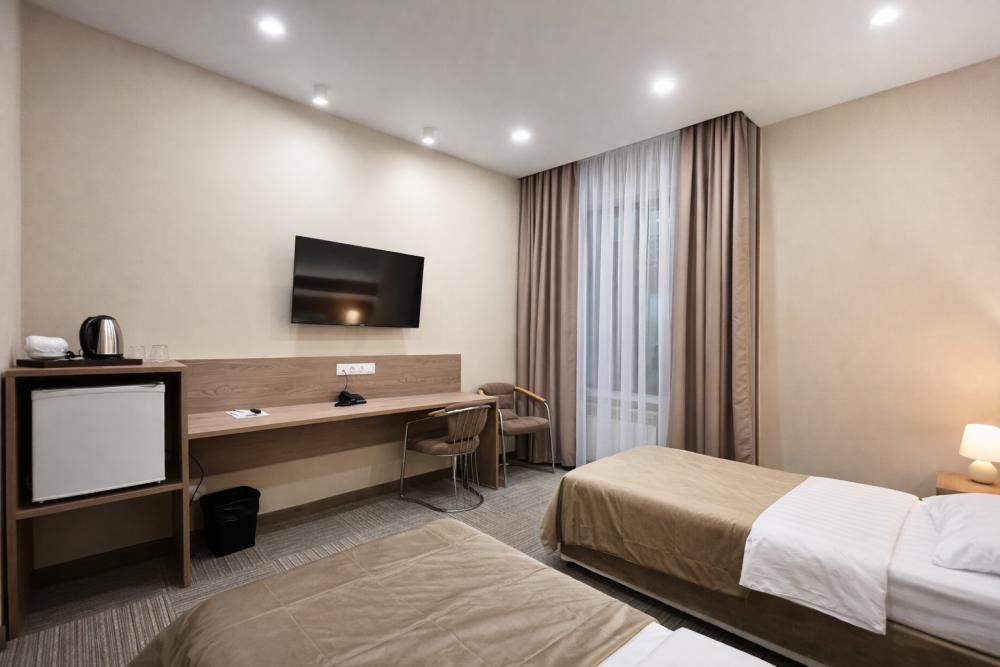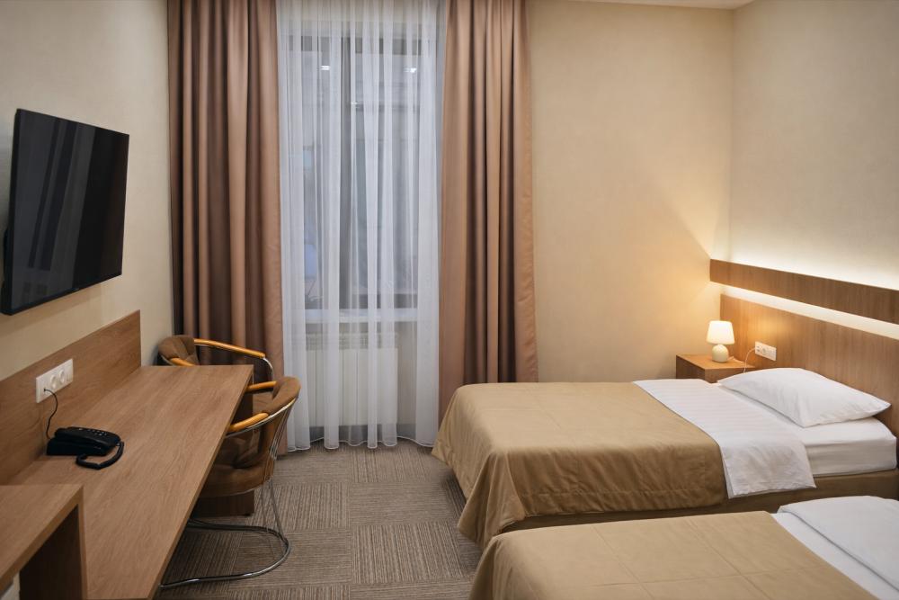 Уютный номер для размещения до 2 гостей. Номер оснащен всем необходимым для комфортного проживания: шкаф для одежды, телевизор, мини-холодильник, телефон, чайная станция и банные принадлежности. В каждом номере ванная комната с душем, косметическим набором и феном.