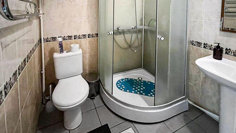 Номер с тремя односпальными кроватями и санузлом с душевой кабиной. К услугам гостей шкаф, стол и прикроватные тумбы.