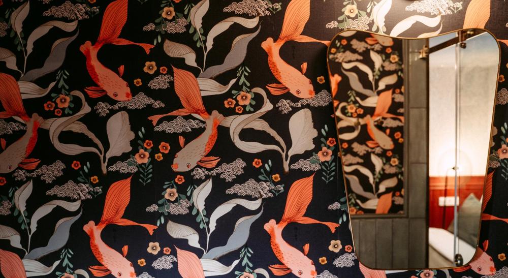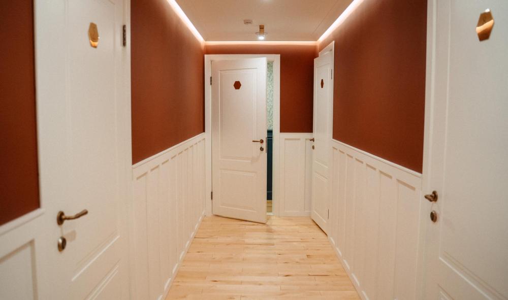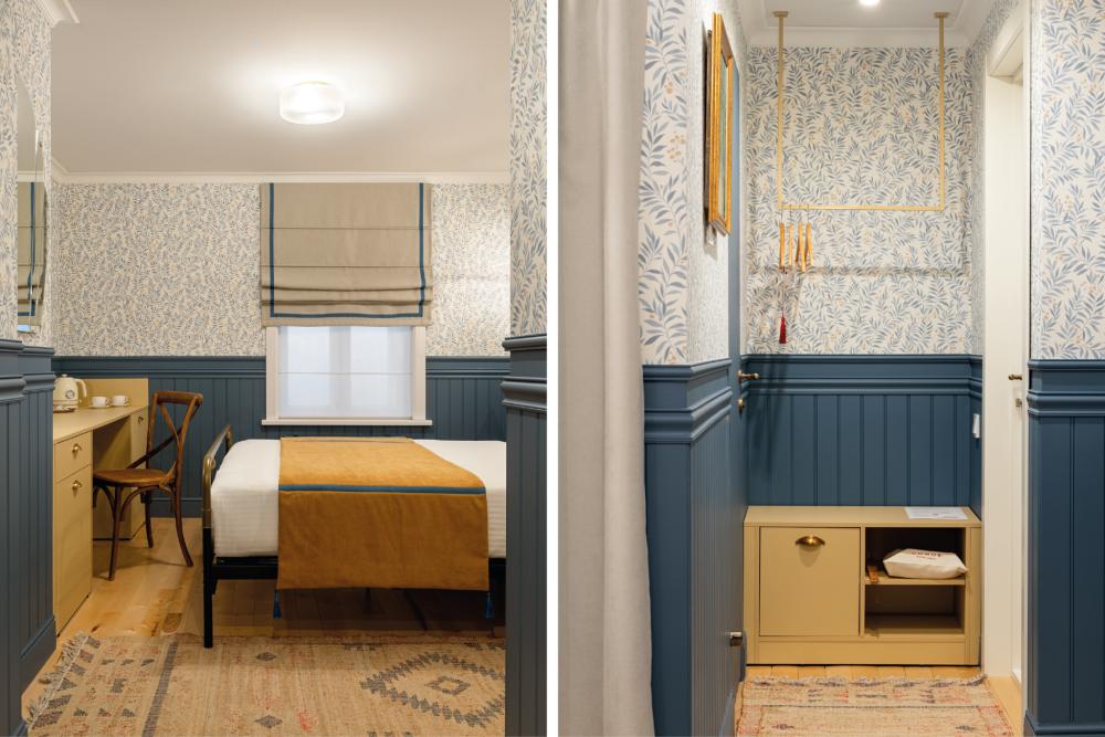Делюкс на 2-ом этаже отеля оформлен в сине-голубых тонах. Окна в номере выходят на стену соседнего дома, при этом в нем достаточно светло и есть несколько источников света, которые делают обстановку ламповой и уютной. В номере есть двуспальная кровать с ортопедическим матрасом, рабочее место, открытый гардероб. Ванная комната с душевой кабиной и стеклянной перегородкой.