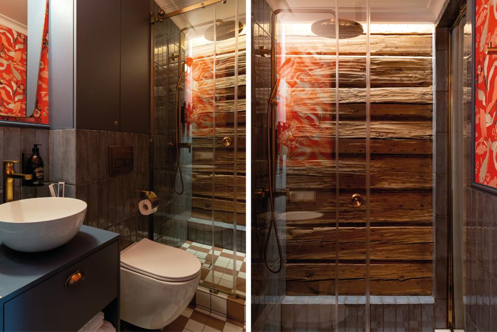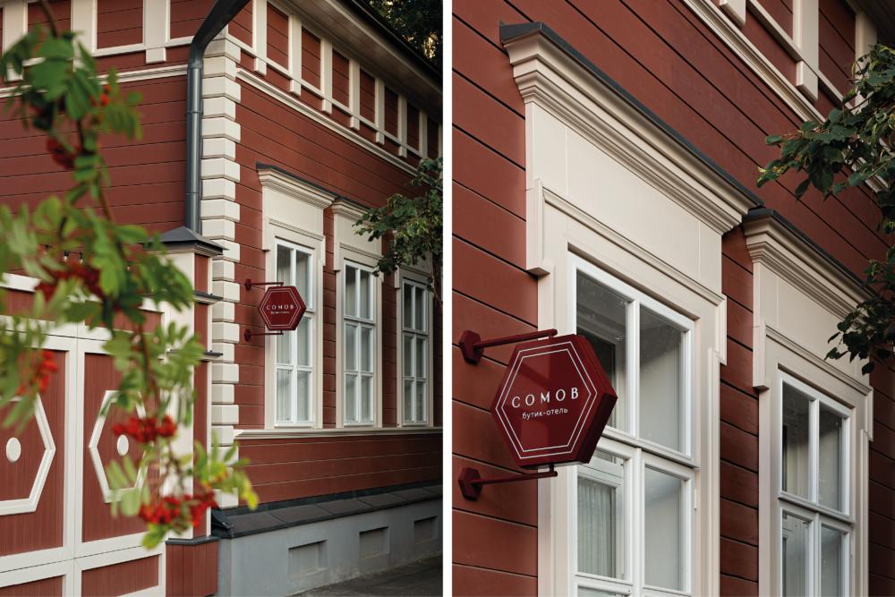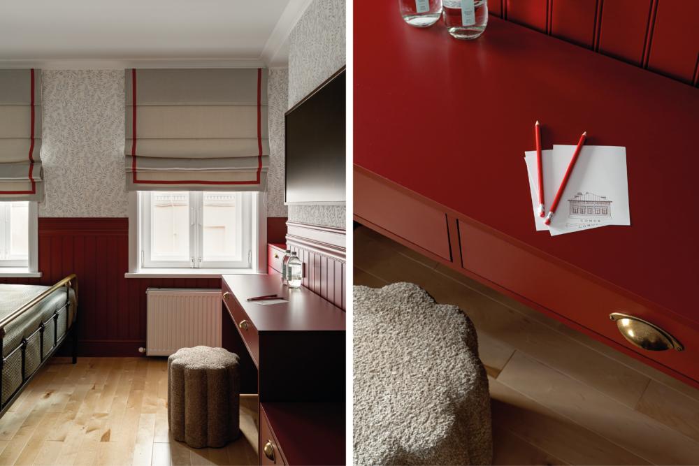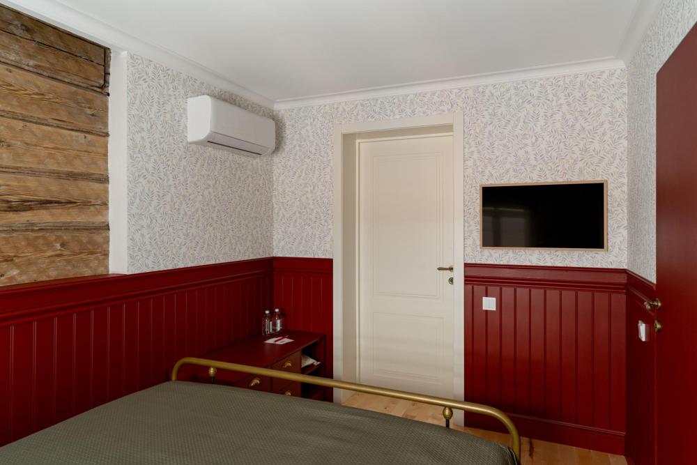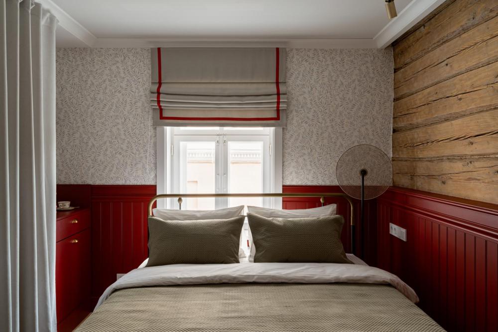 Делюкс на 2-ом этаже отеля с видом во двор и красными акцентами в интерьере. В номере есть двуспальная кровать с ортопедическим матрасом, интерьерный телевизор и открытый гардероб. Ванная комната с душевой кабиной, стеклянной перегородкой и историческим срубом в качестве декоративного элемента.