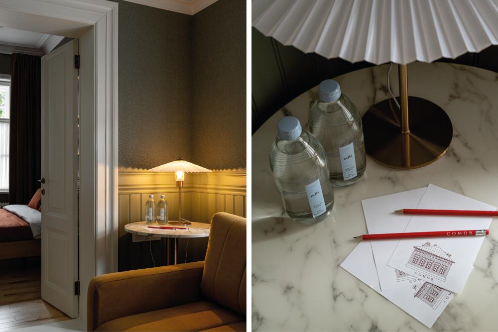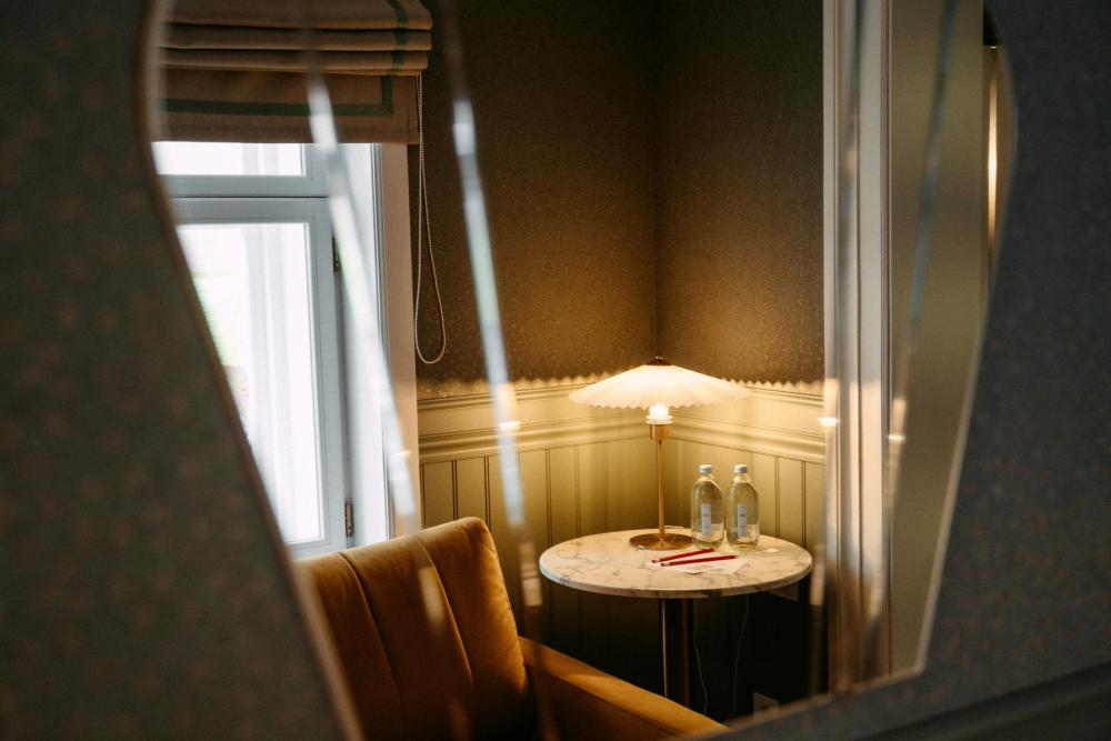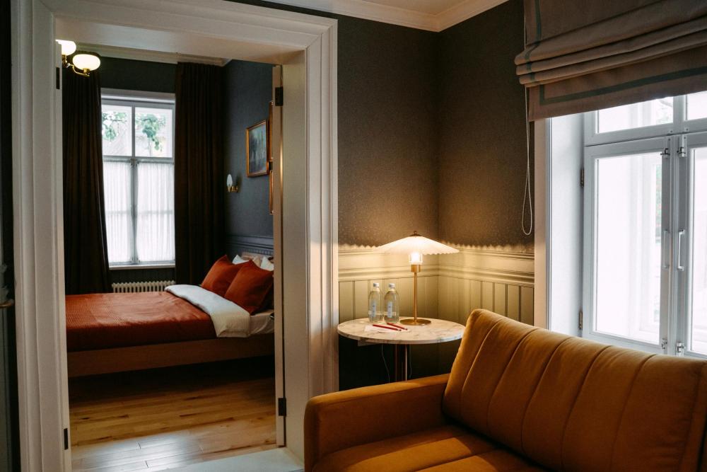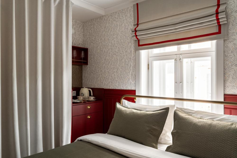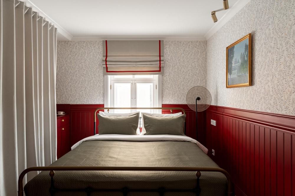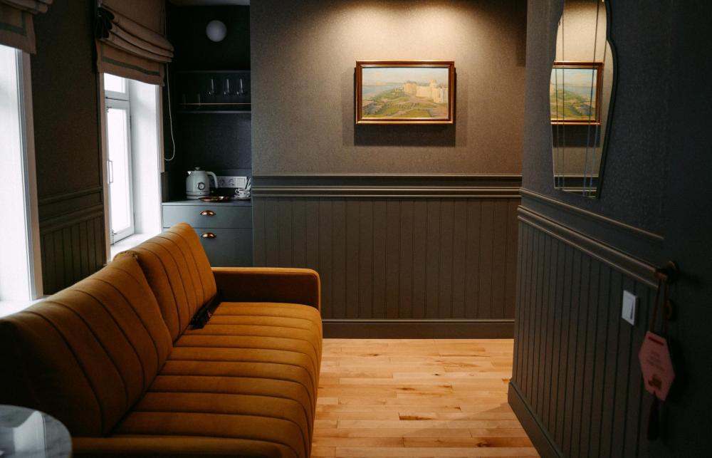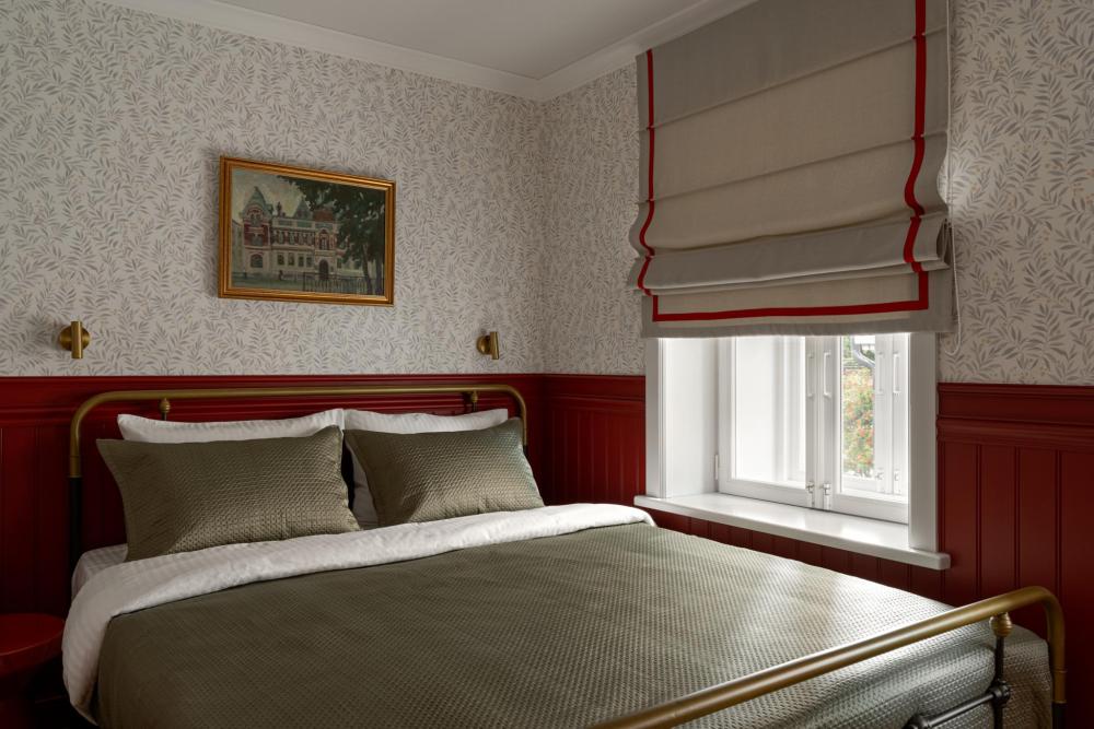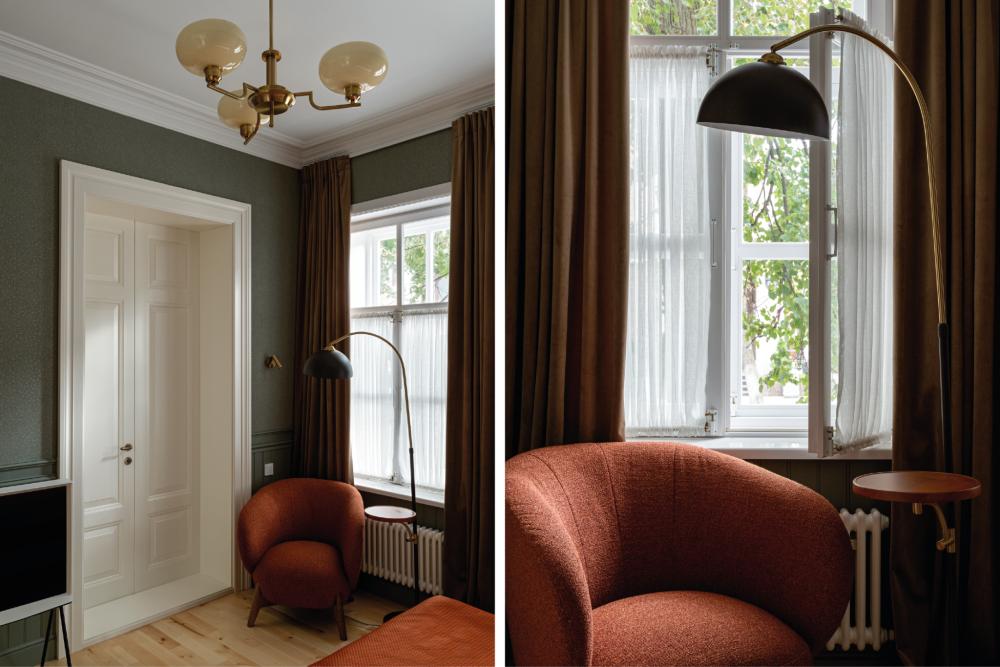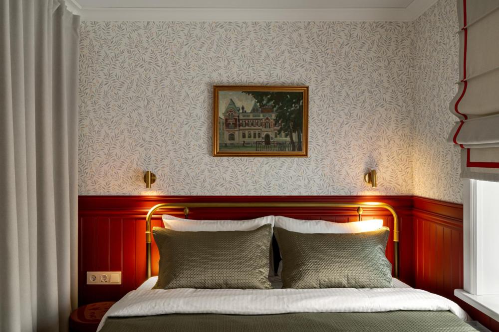 Двухкомнатный Делюкс на первом этаже с видом на улицу Маяковского и во двор. Интерьер в зелено-оливковых тонах вдохновлен историческими эскизами внутреннего убранства особняка. В номере есть кровать «king size» с ортопедическим матрасом и зона отдыха с кушеткой. Ванная комната с душевой кабиной.
