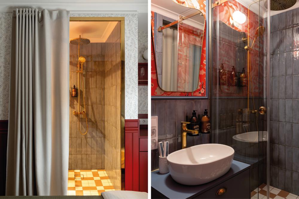 Делюкс с видом во двор и красными акцентами в интерьере. В номере есть двуспальная кровать с ортопедическим матрасом, интерьерный телевизор, открытый гардероб. Ванная комната с душевой кабиной и стеклянной перегородкой.