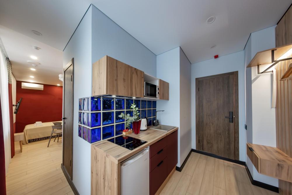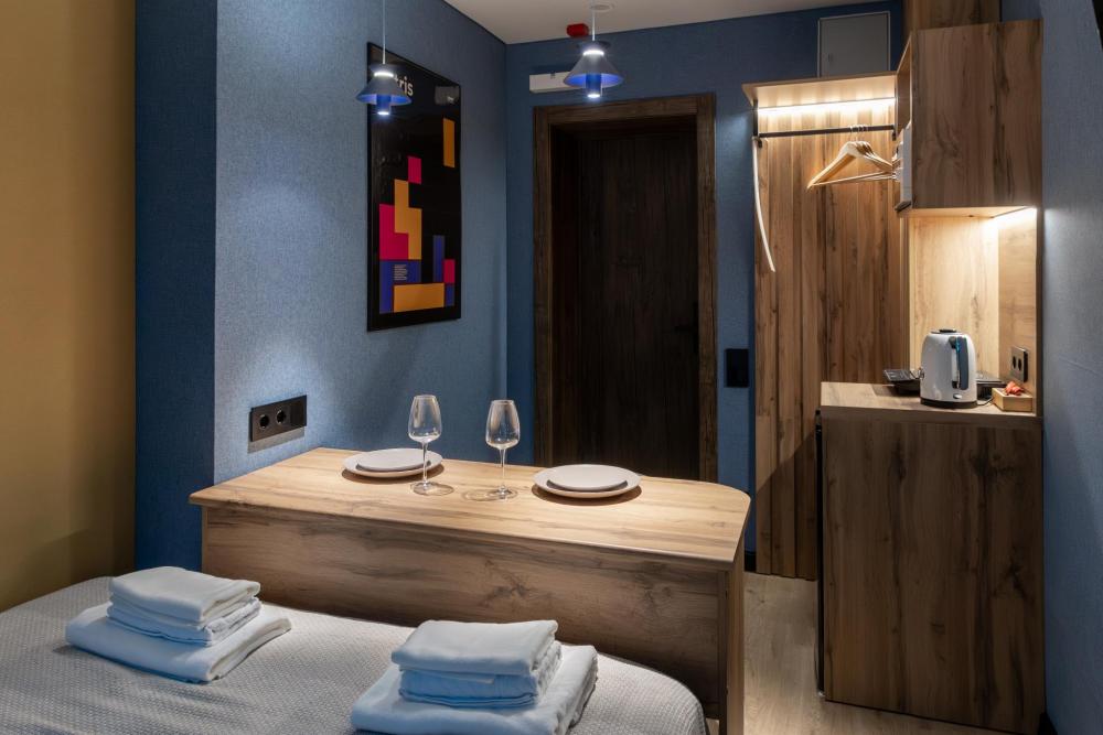Студия Эконом для 2-х человек с большой двуспальной кроватью. Номер без окон, есть мини-кухня со всем необходимым для приготовления еды. Совмещенный санузел с душевой кабиной в номере.