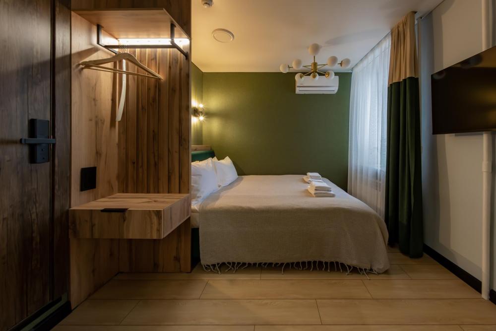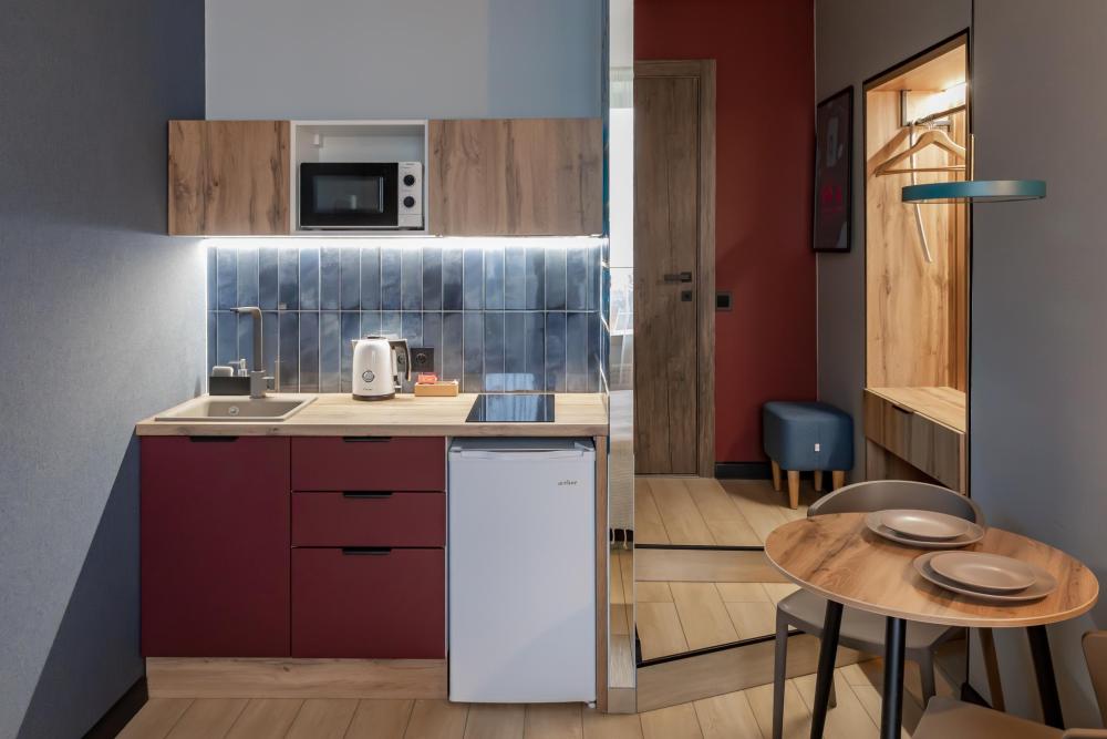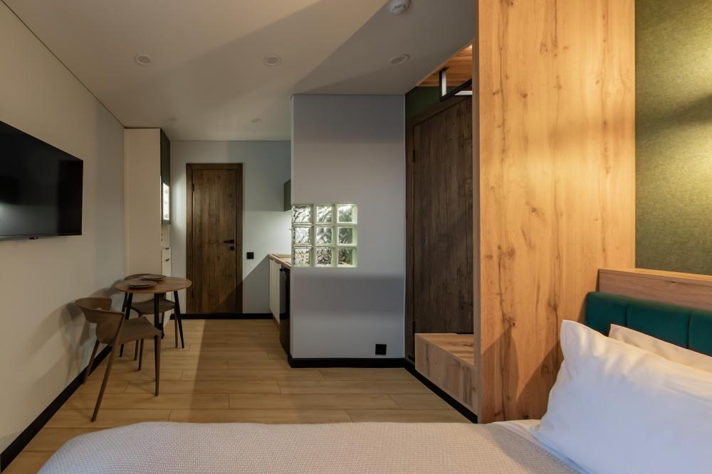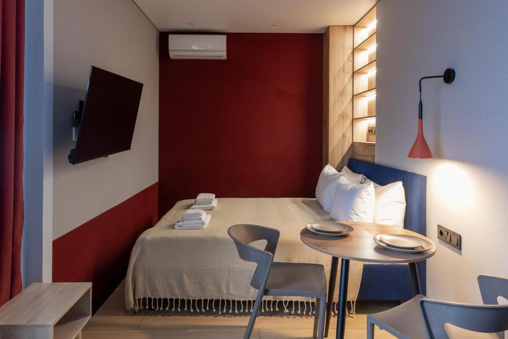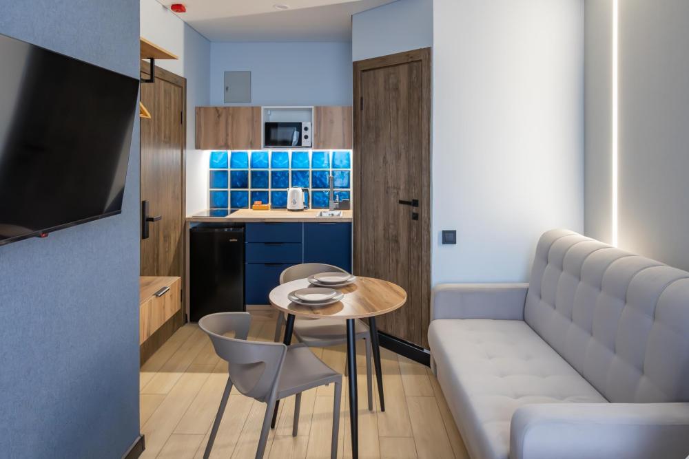 Апартаменты Стандарт подойдут для размещения до 3-х человек. В номере есть двуспальная кровать с ортопедическим матрасом и раскладное кресло 80х185 см. Мини-кухня со всем необходимым для приготовления еды, совмещенный санузел в номере. Окна выходят во двор.