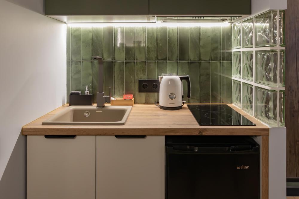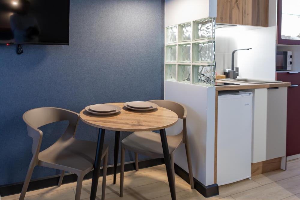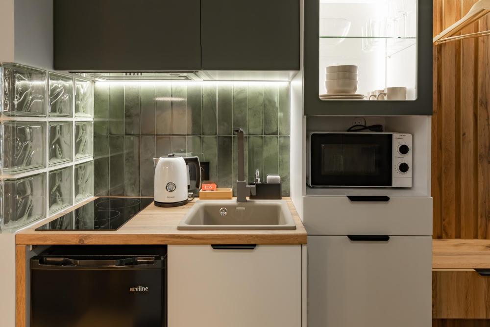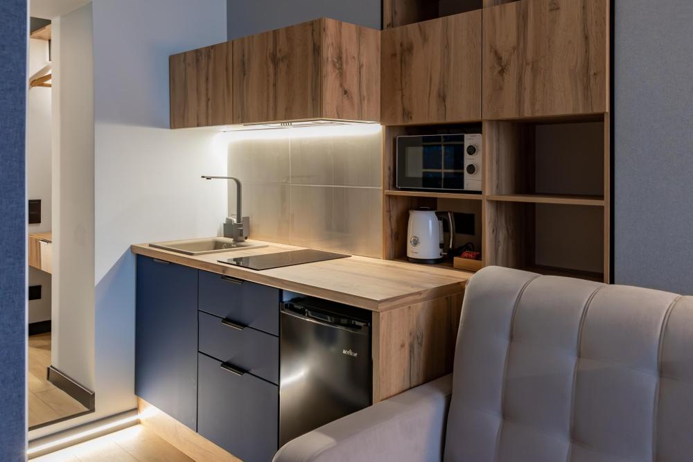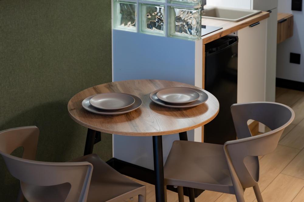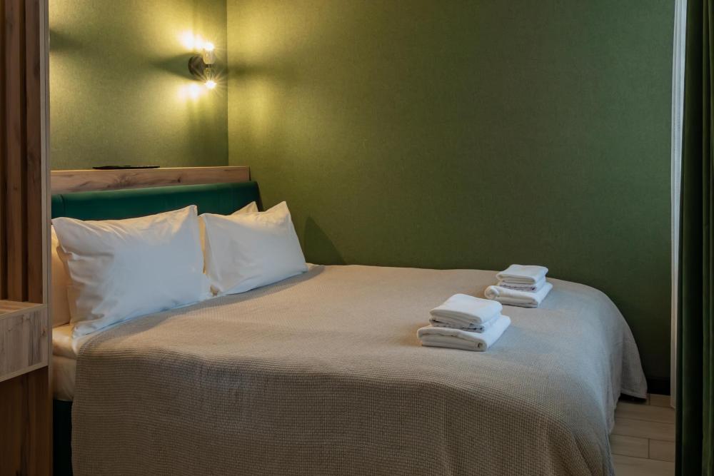 Апартаменты Стандарт подойдут для размещения до 3-х человек. В номере есть двуспальная кровать с ортопедическим матрасом и раскладное кресло 80х185 см. Мини-кухня со всем необходимым для приготовления еды, совмещенный санузел в номере. Окна выходят во двор.