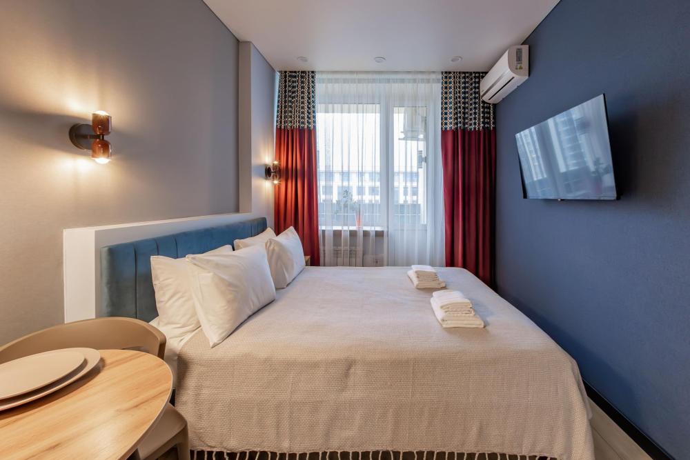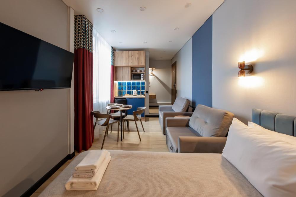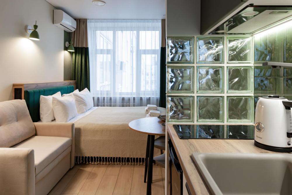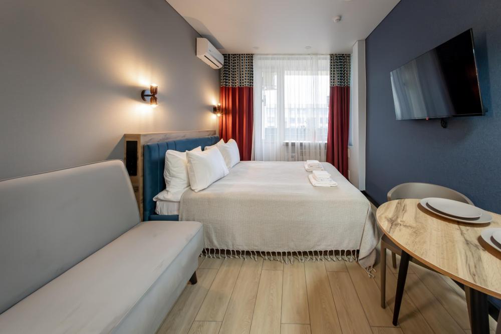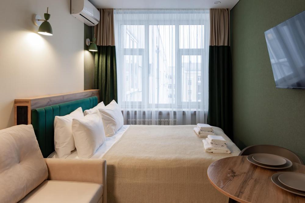 Апартаменты Комфорт, в которых смогут разместиться до 4 человек. В номере есть двуспальная кровать с ортопедическим матрасом, раскладной диван или раскладные кресла (в зависимости от номера). Совмещенный или раздельный санузел в номере, мини-кухня со всем необходимым для приготовления еды. Окна выходят во двор, на канал Булак или на озеро Кабан.