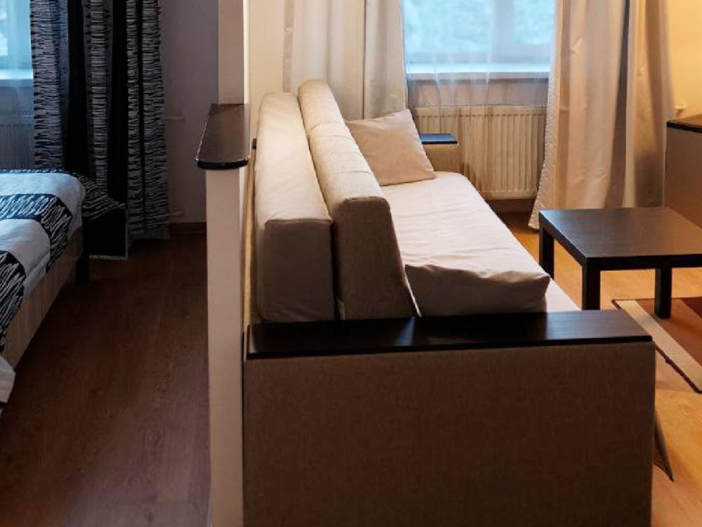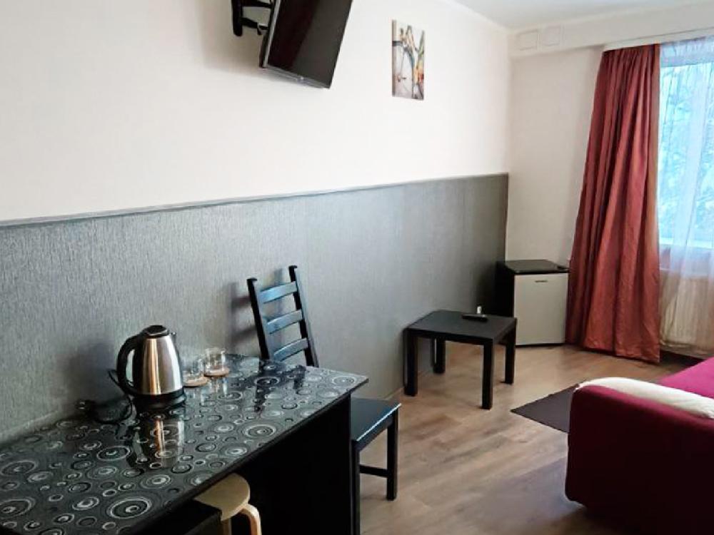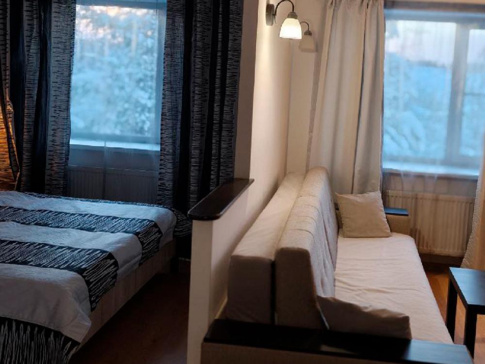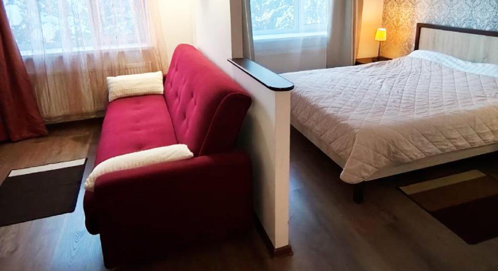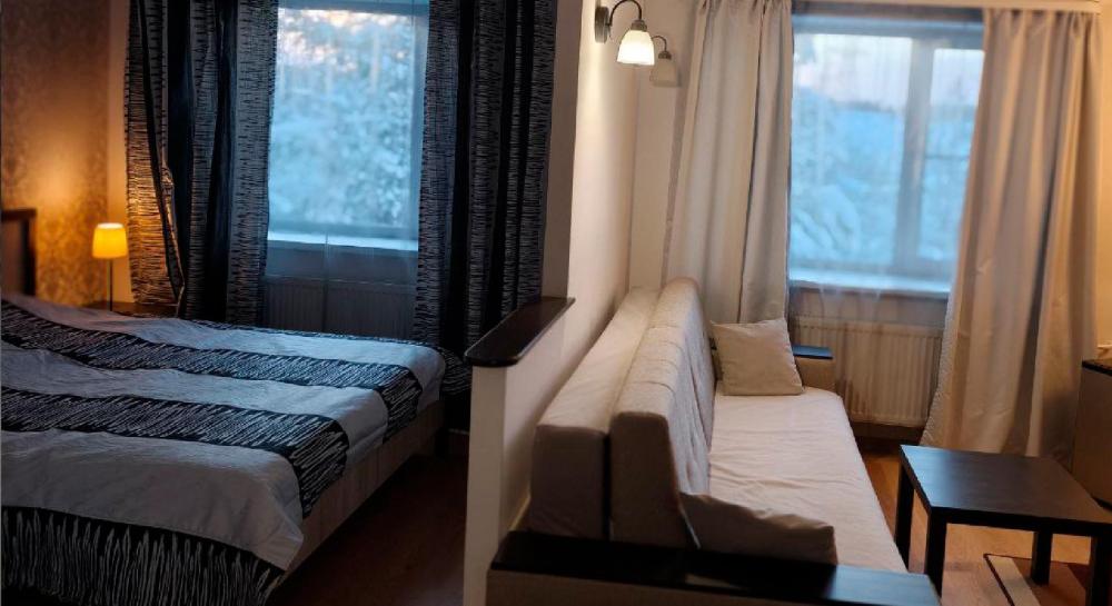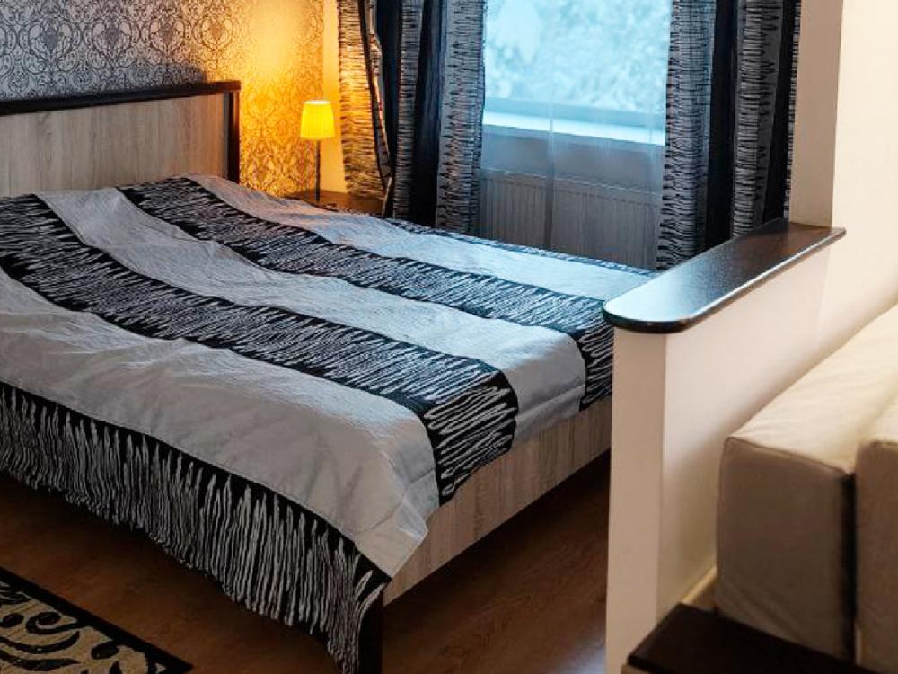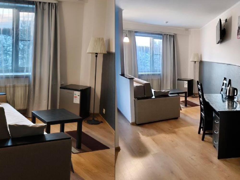 Номер люкс- однокомнатный, но просторный с номер с перегородкой , оснащенный современной удобной мебелью и сантехникой, площадью 37 кв.м. В номере этой категории – одна широкая двуспальная кровать, а также комфортабельный раскладывающийся диван, который можно использовать в качество дополнительного спального места телевизор, холодильник, стол, стулья, полки, тумбы, шкаф для одежды и багажа, душевая, санузел, а также полотенца, банные и косметические принадлежности. Из окна номера открывается чудесный вид на могущественные карельские ели-великаны. Номера расположены на 2- м этаже отеля. Подходит для размещения командировочных, семейных пар, компаний друзей, а также семей с детьми.