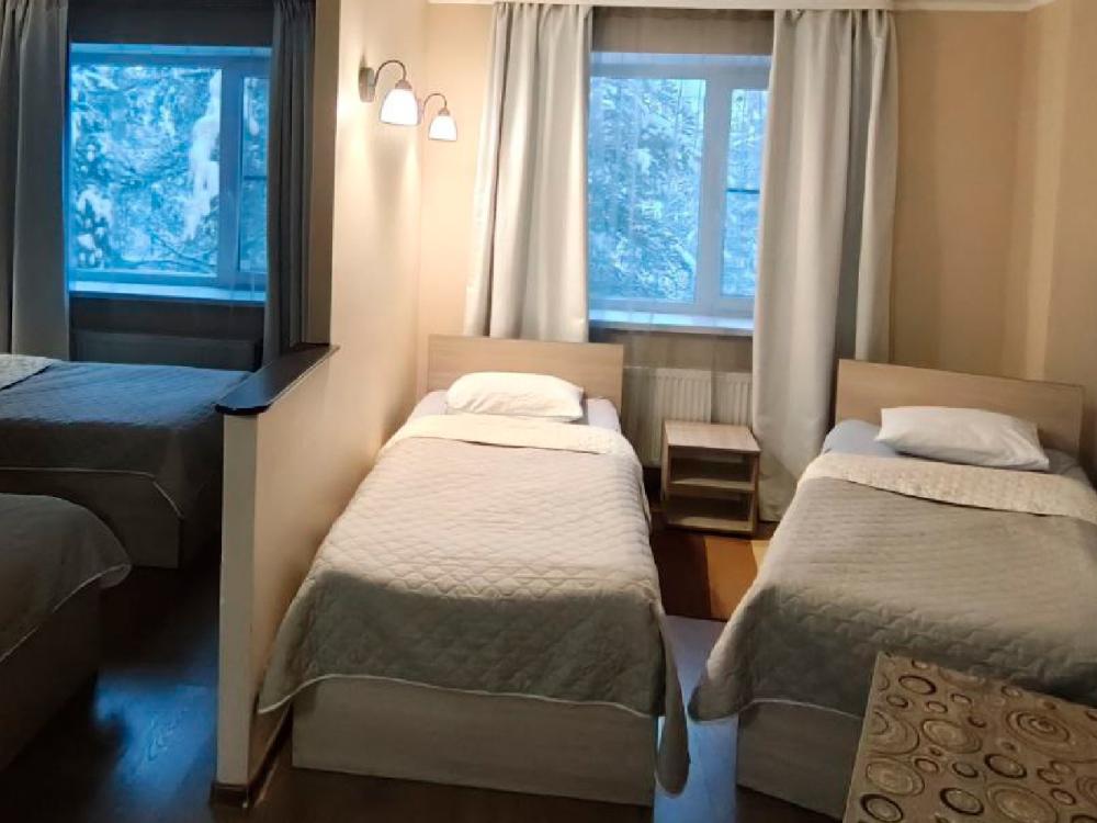 Номер стандарт с 4 односпальными кроватями - однокомнатный, но просторный номер с перегородкой, оснащенный современной удобной мебелью и сантехникой. В номере этой категории – четыре односпальных кровати, телевизор, стол, стулья, полки, тумбы, отделения для одежды и багажа, душевая, санузел, а также полотенца, банные и косметические принадлежности. Из окна номера открывается чудесный вид на могущественные карельские ели-великаны. Номера расположены на 1- м этаже отеля. Подходит для размещения командировочных, семейных пар, а также семей с детьми.
