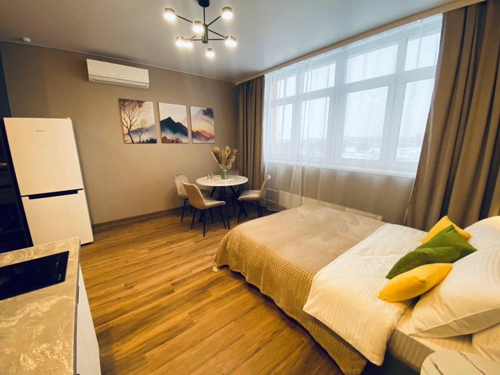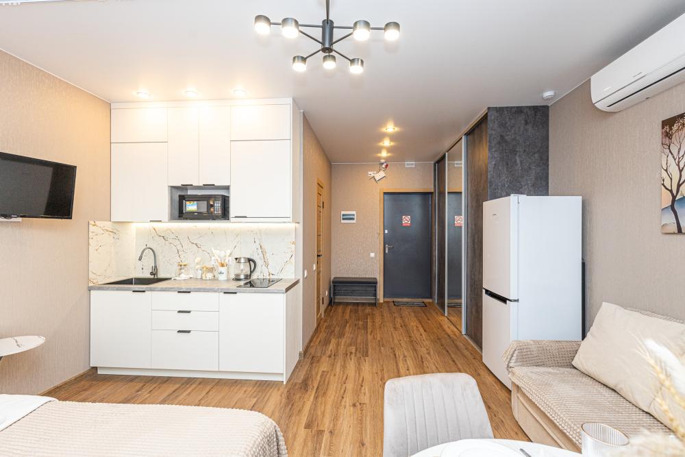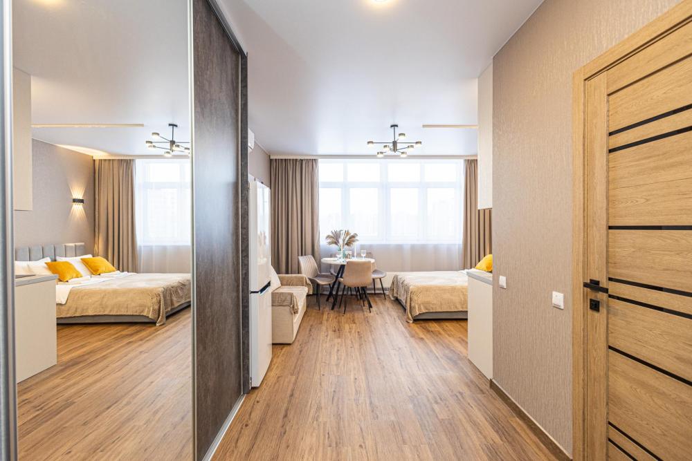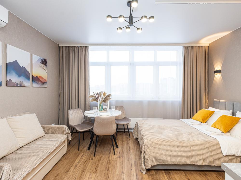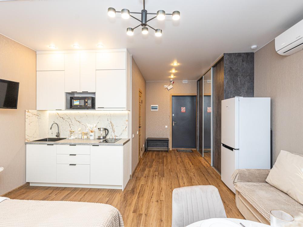 Новая просторная студия в Кемерово около ГЦС Кузбасс ! - Отлично для семейного отдыха и рабочих поездок. - Документы отчетности, чек с QR-кодом. - Круглосуточное бесконтактное заселение. - Администратор всегда на связи. АДРЕС: г. Кемерово, пр. Ленинградский 46, 10 этаж (есть лифт). УДОБНО заезжать тем, кто прилетел на самолёте или приехал на машине из Новосибирска, Томска, Красноярска, Барнаула и других городов. А ЕЩЁ: продуктовые магазины («Ярче», «Пятёрочка», «Бристоль»), аптека, кафе и рестораны, булочная-кондитерская с кофе и завтраками! КВАРТИРА: 1 комната, двуспальная кровать. Будет комфортно разместиться 1-2 гостям. Для вас готово свежее постельное бельё (100%-й хлопок) и полотенца. В квартире есть ванна. ТЕХНИКА: холодильник, чайник, плита, микроволновка, стиральная машина, утюг, фен. Есть всё для приготовления еды, а также сушилка и гладильная доска. ИНТЕРНЕТ: высокоскоростной Wi-Fi от GoodLine. Есть телевизор с кабельным ТВ и функцией «Смарт-ТВ»! В ПОДАРОК: разовые средства гигиены (шампунь, гель для душа, жидкое мыло, зубной набор). ДОПОЛНИТЕЛЬНО: большая открытая парковка со шлагбаумом во дворе, детские игровые площадки.