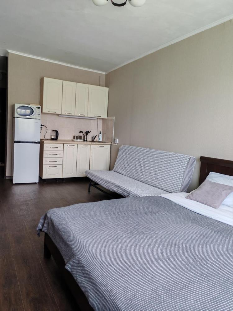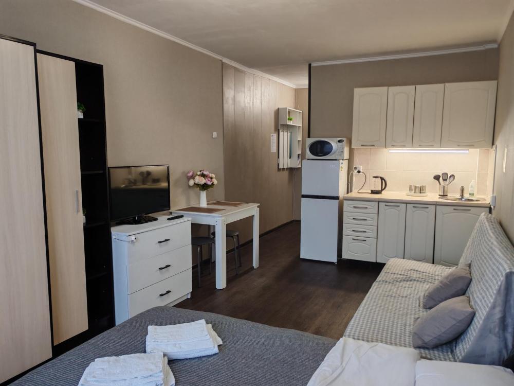 Сдается уютная студия КГТ Вас ждет: -большая двуспальная кровать (160 см, матрас Аскона средней жесткости), чтобы вы cмогли полноценно отдохнуть после насыщенного дня. - раскладной диван (Ikea, 120 см) с ортопедическим основанием и удобным матрасом. Для вашего комфорта только белое постельное белье и полотенца, а также все средства личной гигиены (гель для душа, шампунь, зубные щетки, паста, тапочки).