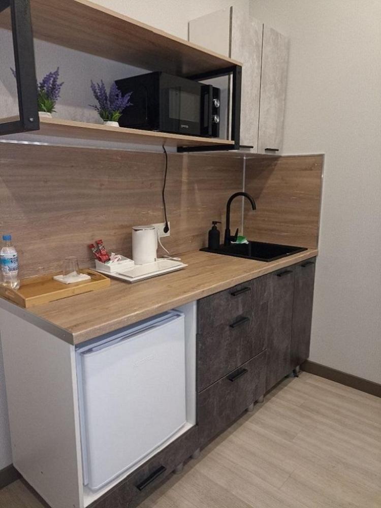 Большой номер со своей кухонной зоной, чайником, микроволной печью, посудой, вмещающий в себя до 3-х человек, оборудованный двумя односпальными кроватями, которые можно объединить в одну king-size, диваном, душевой кабиной, феном, Smart ТВ, бесплатным Wi-Fi, кондиционером, мини-холодильником.