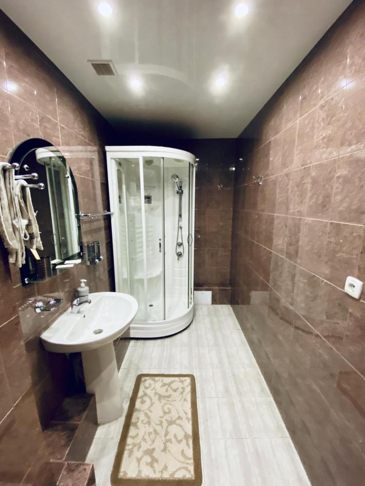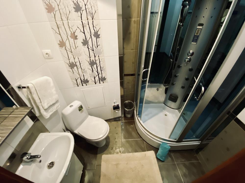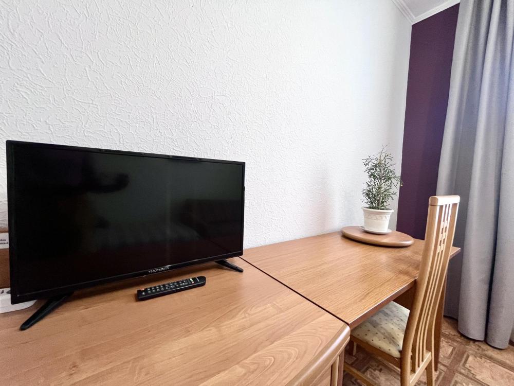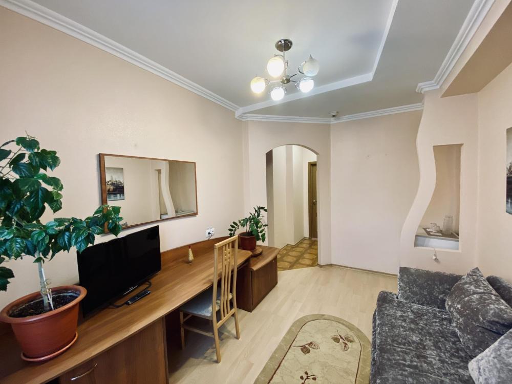В номере: односпальная кровать, прикроватная тумбочка, раскладной диван, комод, телевизор, посудный шкаф, телевизор, журнальный столик, светильник настольный,письменный стол,стул,шкаф-купе с зеркалом в полный рост. Душ, туалет внутри номера.