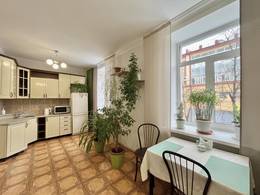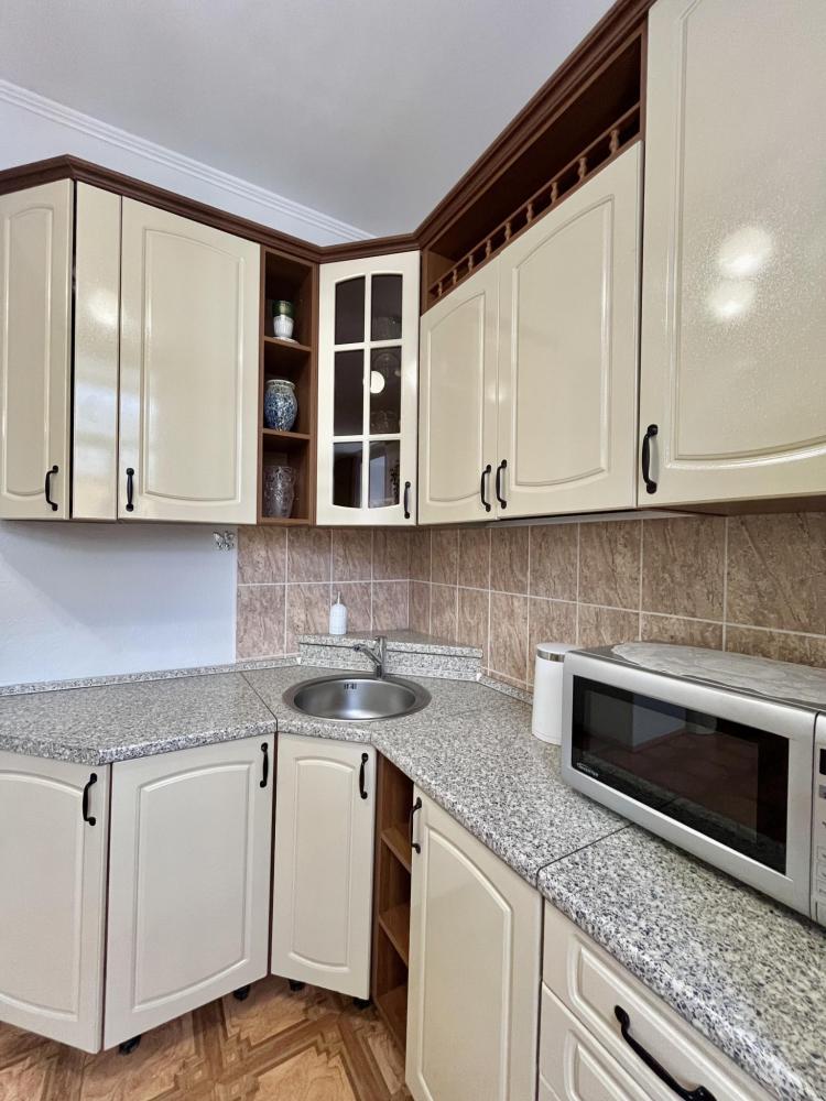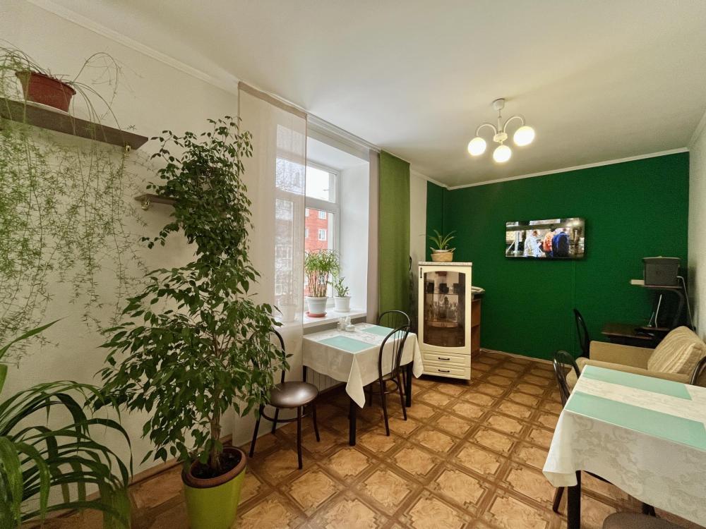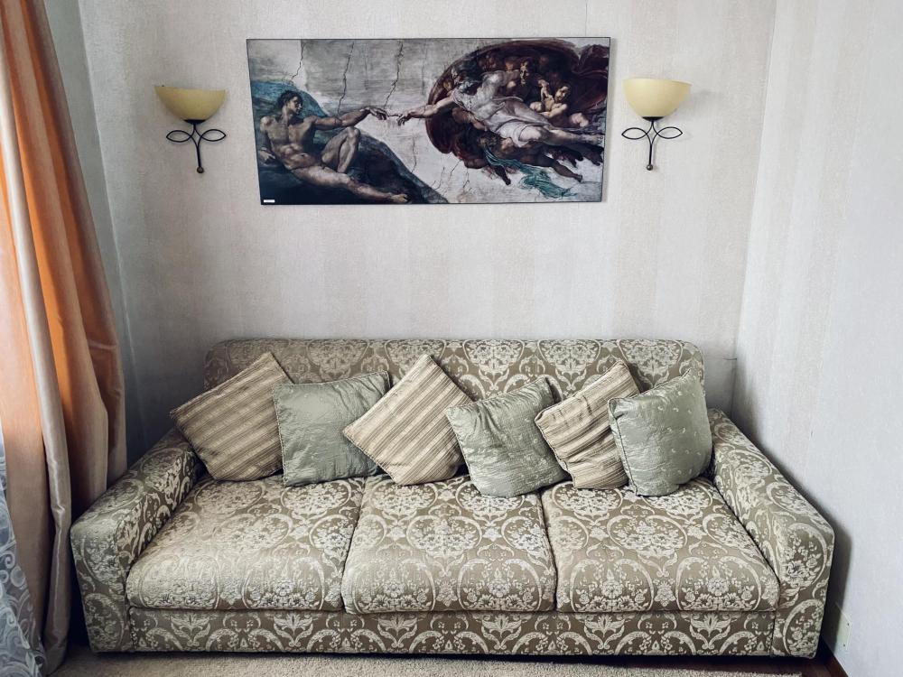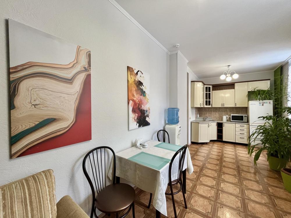 В номере: односпальная кровать, прикроватная тумбочка, раскладной диван, комод, телевизор, посудный шкаф, телевизор, журнальный столик, светильник настольный,письменный стол,стул,шкаф-купе с зеркалом в полный рост. Душ, туалет внутри номера.