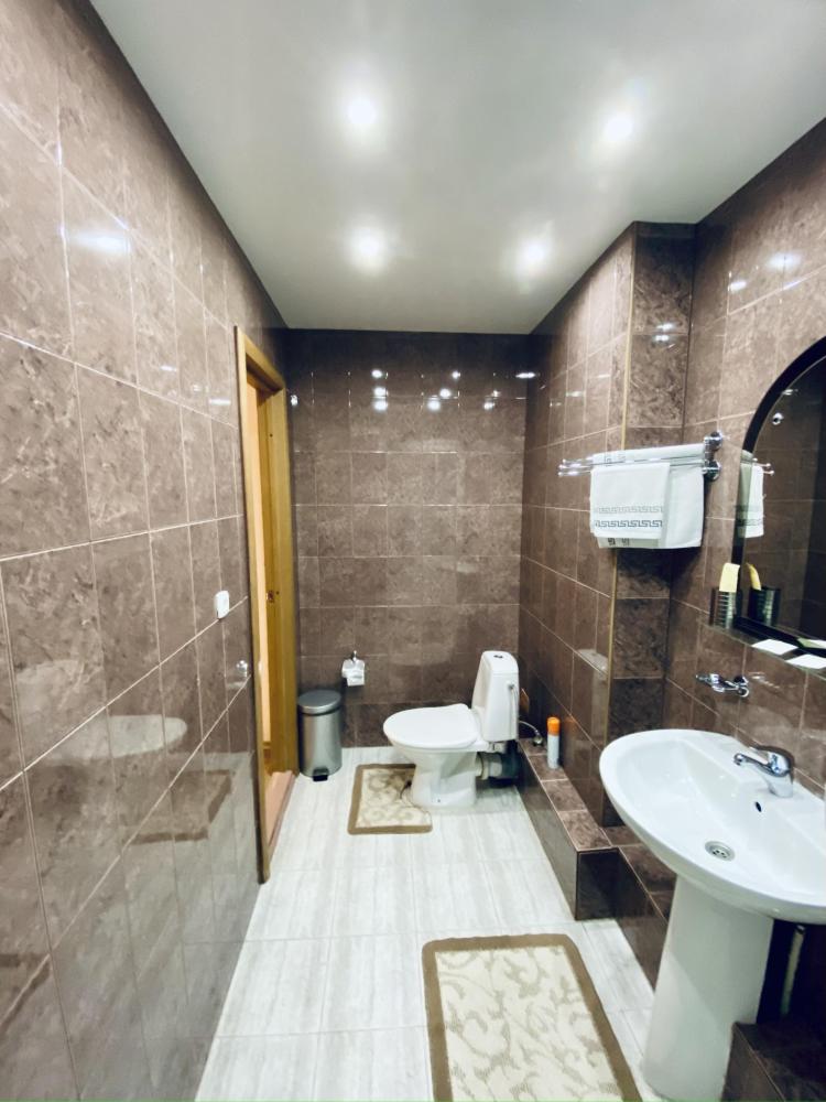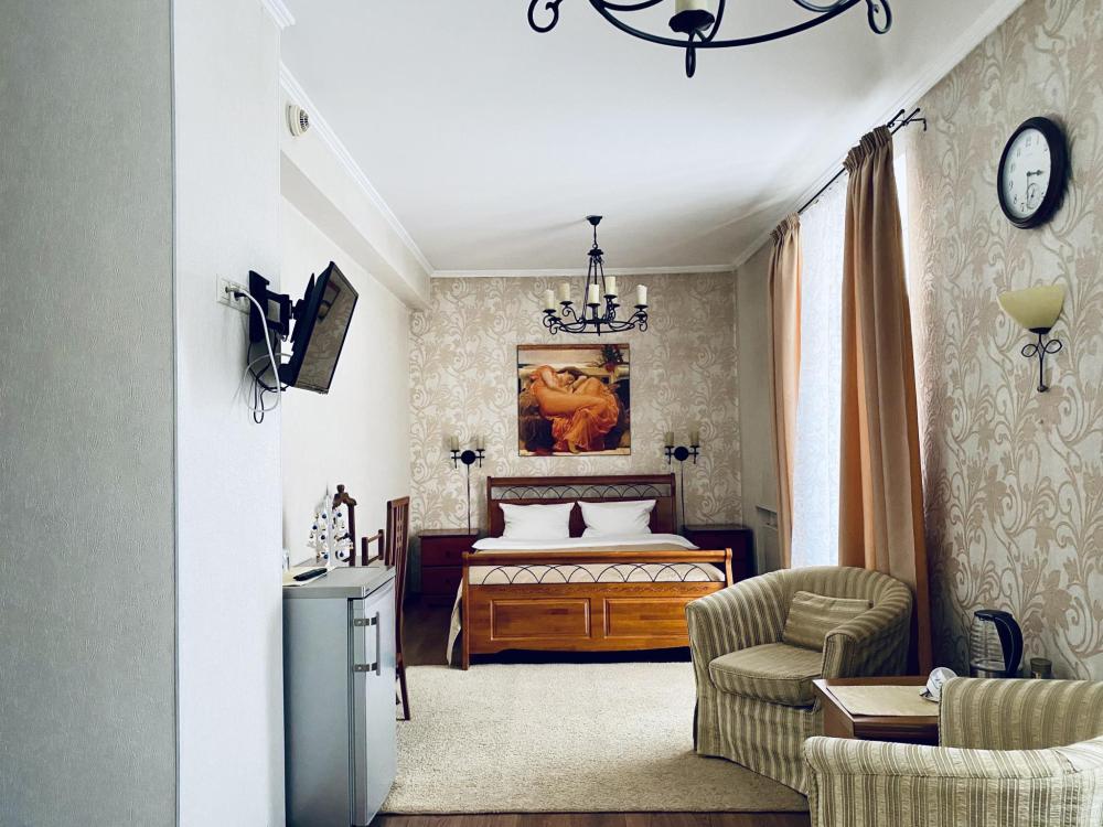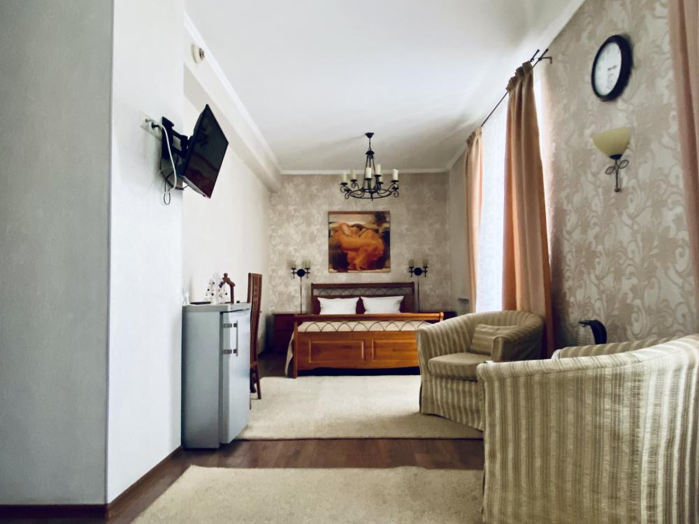 В номере: двуспальная кровать, 2 прикроватных тумбочки, туалетный столик, стул, холодильник, телевизор, 2 кресла, журнальный столик, диван, электро чайник. В прихожей шкаф-купе с зеркалом в полный рост. Душ, туалет внутри номера.
