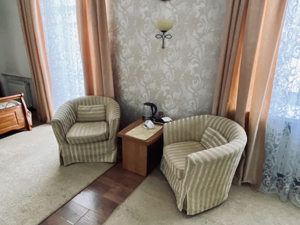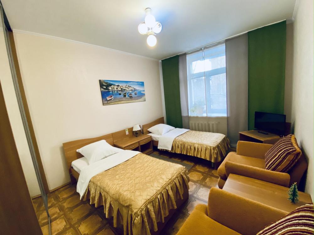 В номере: две односпальные кровати, 2 прикроватные тумбочки, телевизор, столик журнальный, 2 кресла, шкаф-купе. Личный санузел находится вне номера.