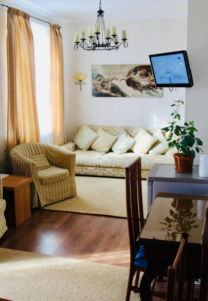 Гостиная: письменный стол,стул,телевизор,раскладной диван,журнальный столик, холодильник,торшер. Спальня: двухспальная кровать,прикроватная тумбочка,вешалка напольная. прихожая: шкаф-купе с зеркалом в полный рост. Душ туалет внутри номера.