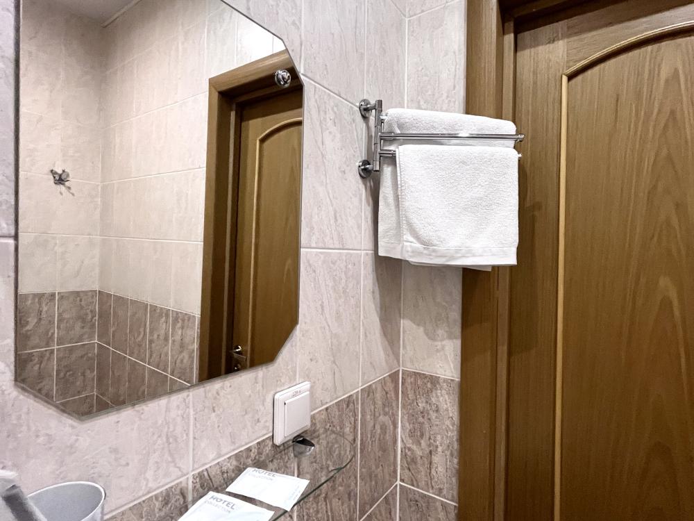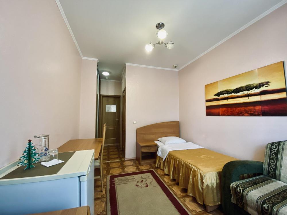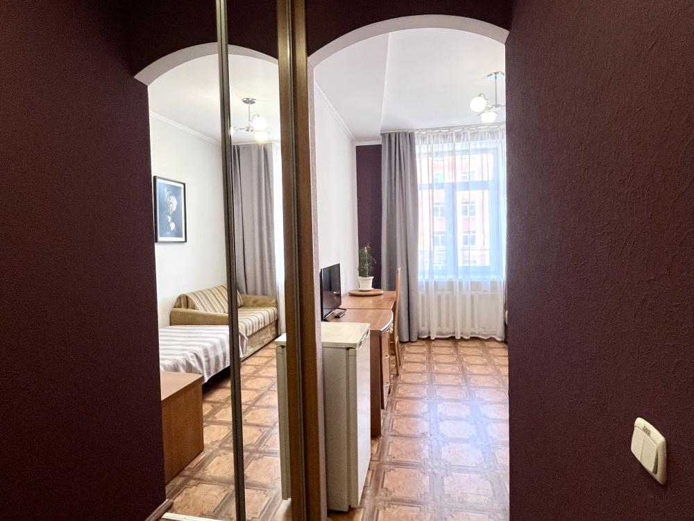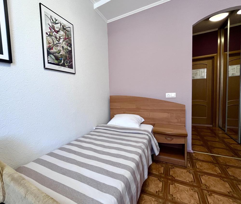 Номер с дополнительным спальным местом. Раскладной диван , находящийся в номере данной категории, служит полноценным местом для сна. В комнате: односпальная кровать, прикроватная тумбочка, письменный стол, стул, комод, телевизор, холодильник. В прихожей: шкаф-купе с зеркалом в полный рост. Душ, туалет внутри номера.