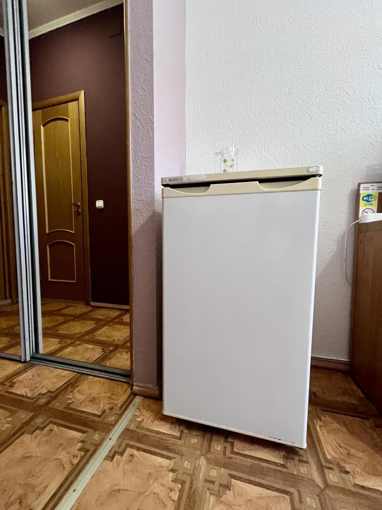 В номере: встроенный шкаф-купе,односпальная кровать,прикроватная тумба,письменный стол,стул,холодильник,комод,телевизор. Раскладной диван.Туалет,душ в номере.