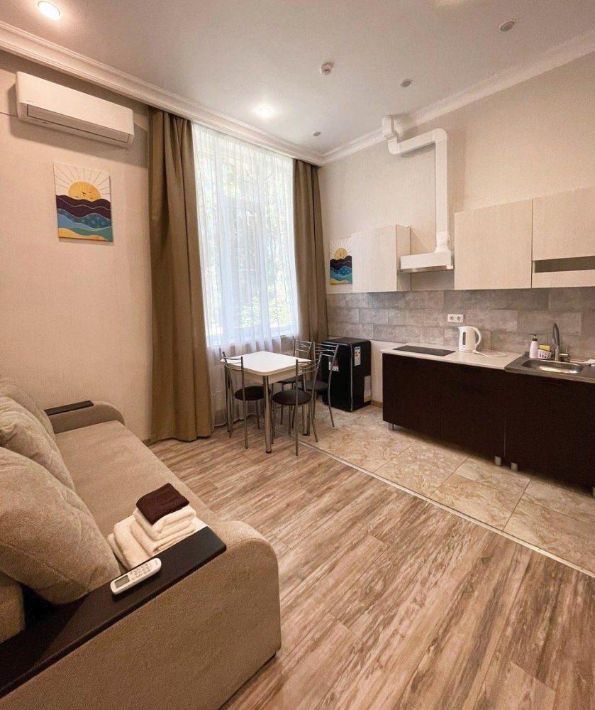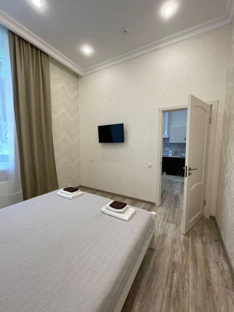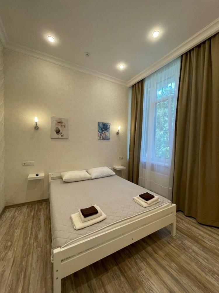 Светлый номер с собственной оборудованной кухней со всем необходимым для самостоятельного приготовления. В номере установлена большая двуспальная кровать, кондиционер, телевизор, холодильник. Ванная комната с душевой кабинкой, набором полотенец, минипарфюмерии, и феном. На территории отеля и в номерах предоставляется бесплатный доступ к WI-Fi. В номере отдельный вход, на крыльце садовая мебель, где Вы можете отдохнуть на свежем воздухе.