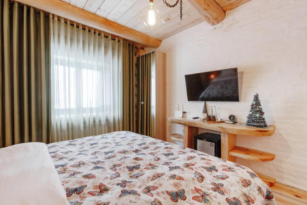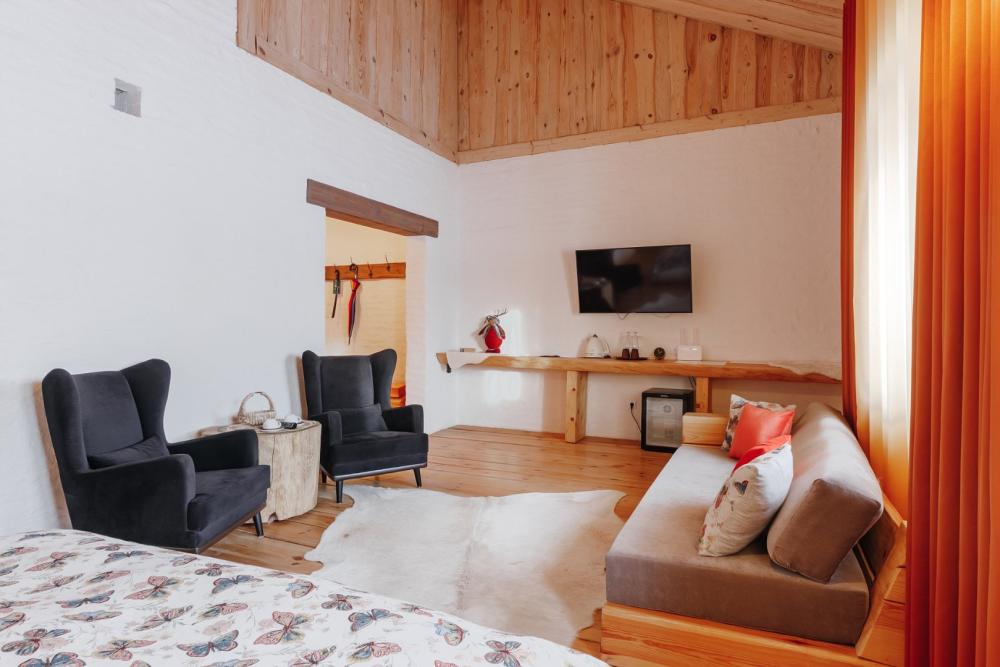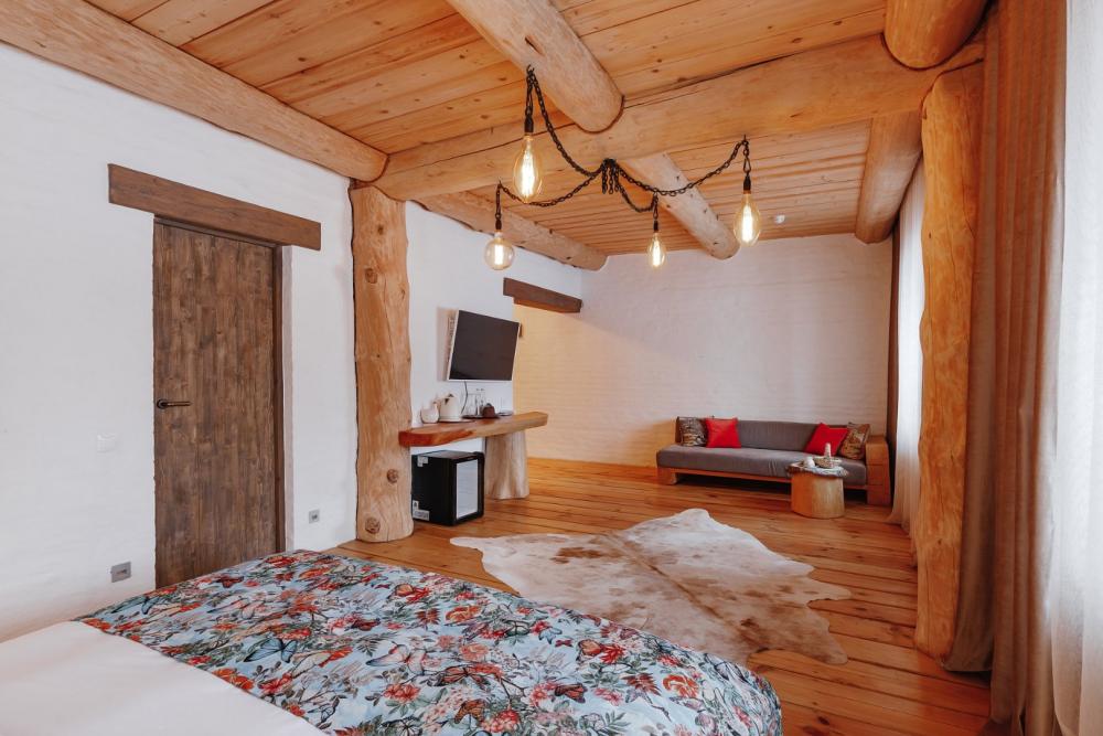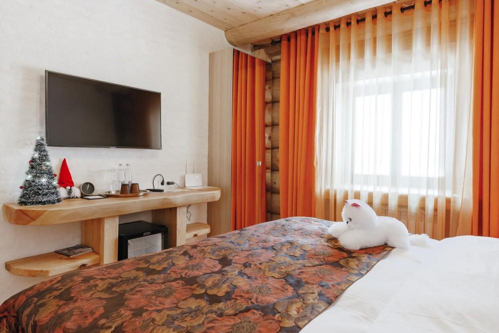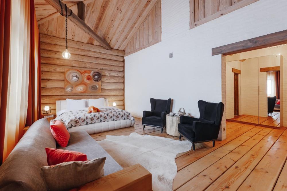 Однокомнатный номер люкс с высоким потолком 5 м, (один номер 2.7 м) с кроватью размера «кинг-сайз» и диваном, для размещения до 3-х гостей (дополнительное место оплачивается отдельно). Номера укомплектованы холодильником, чайником, чайным набором, пушистыми полотенцами togas, тапками и халатами с символикой отеля. В каждом номере имеется свой вай-фай роутер.