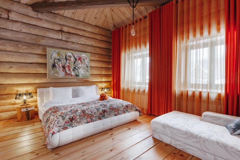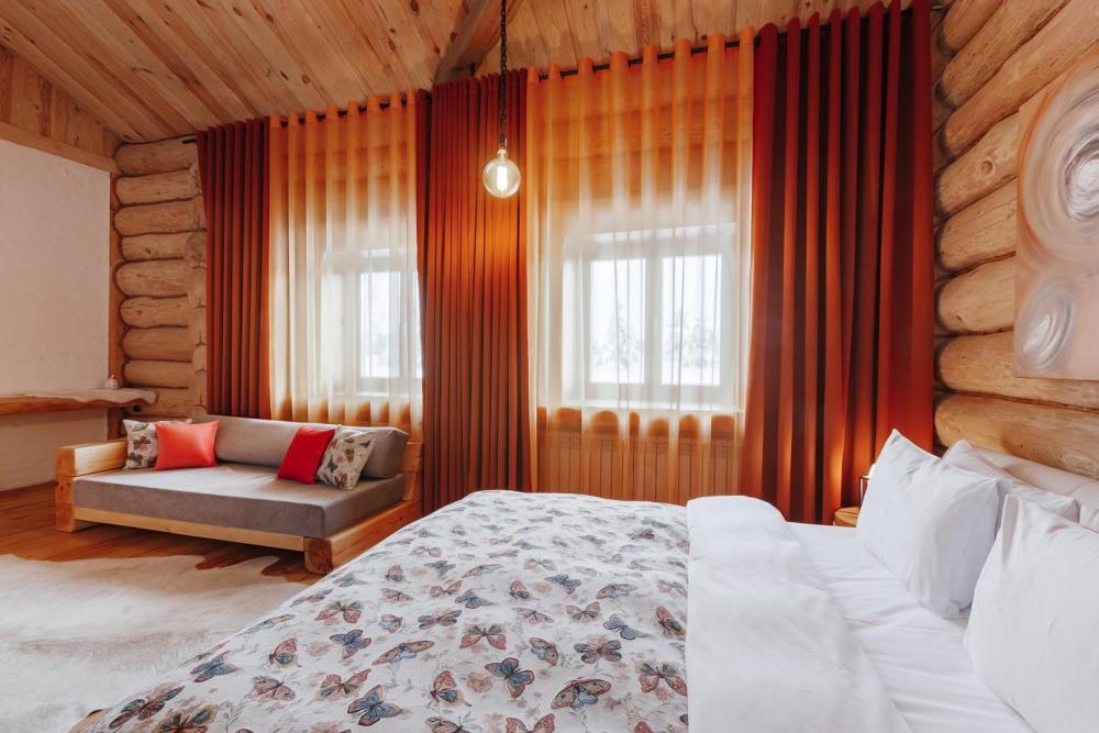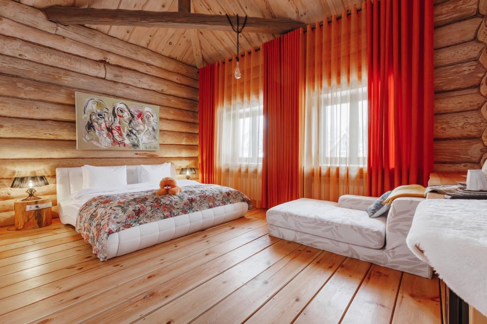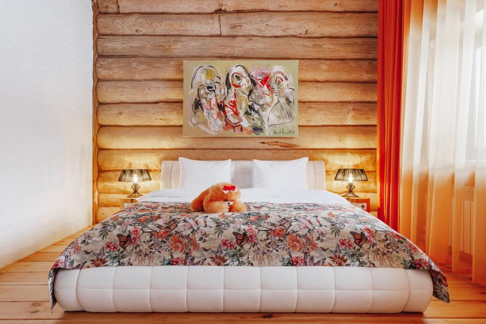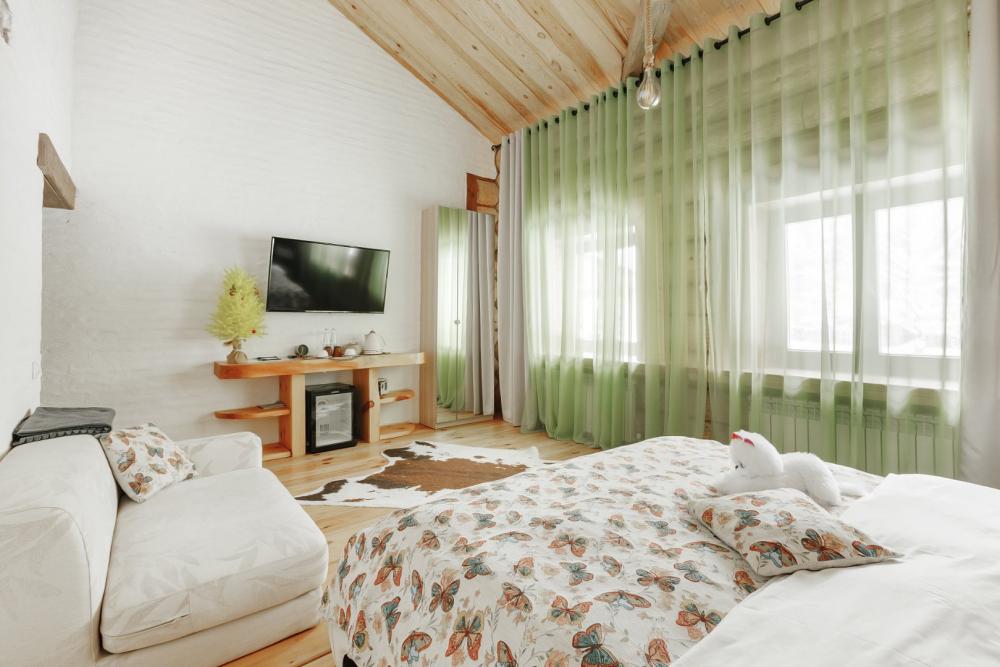 Однокомнатный номер с высоким потолком 5 м, общей площадью 35 кв м, с одной двуспальной кроватью размера «кинг-сайз», для размещения до 2-х гостей. Номер-студия с большой кроватью размера "Кинг-сайз". В нем имеется все для комфортного отдыха: небольшая тахта, шкаф для верхней одежды, холодильник, чайник и чайный набор. Номер укомплектован: полотенцами, тапками, халатами и косметическими наборами. Данные номера имеют разную цветовую гамму. В каждом номере имеется свой вай-фай роутер.