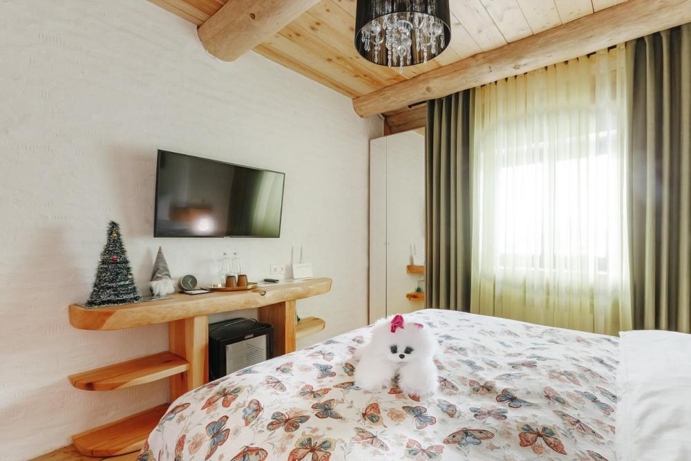Однокомнатный номер стандарт, общей площадью 20 кв. м., с одной кроватью размера «кинг-сайз» для размещения до 2-х гостей. Современный уютный номер с двухспальной кроватью "Кинг-сайз", плазменным телевизором, холодильником и шкафом для верхней одежды. Номер укомплектован полотенцами, халатами, тапками и косметическими наборами. В каждом номере имеется свой вай-фай роутер.