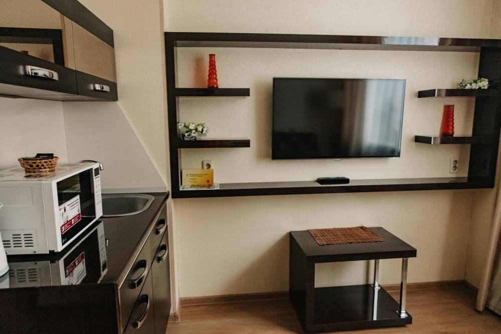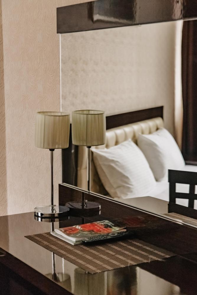 В номере:одна двуспальная кровать, туалетный столик, ЖК телевизор, WI-FI (бесплатный), холодильник, кабельное телевидение, ванная комната с банными принадлежностями, халатом и тапочками, фен.