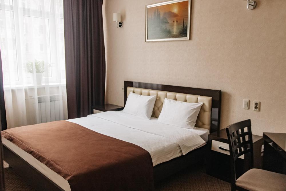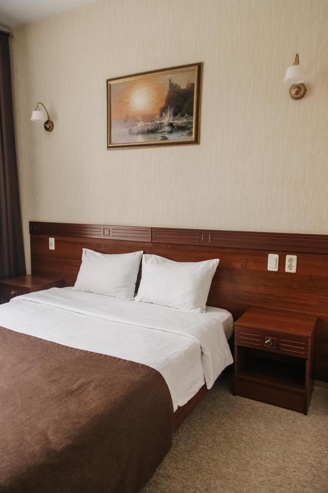 В номере: комфортная комната 17 м², WI-FI (бесплатный), одна большая двуспальная кровать, деловая зона: письменный стол, кресла, ЖК телевизор, холодильник, кабельное телевидение, ванная комната с банными принадлежностями, фен.