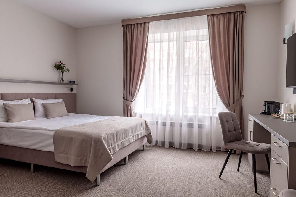 В номере: большая двуспальная кровать, прикроватные тумбочки, удобная новая мебель, холодильник, ЖК-телевизор (32”), телефон, доступ Wi-Fi доступ в интернет, номера мансардного этажа оснащены кондиционерами. В санузле: душевая кабина, фен, полотенца, косметические принадлежности, тапочки.