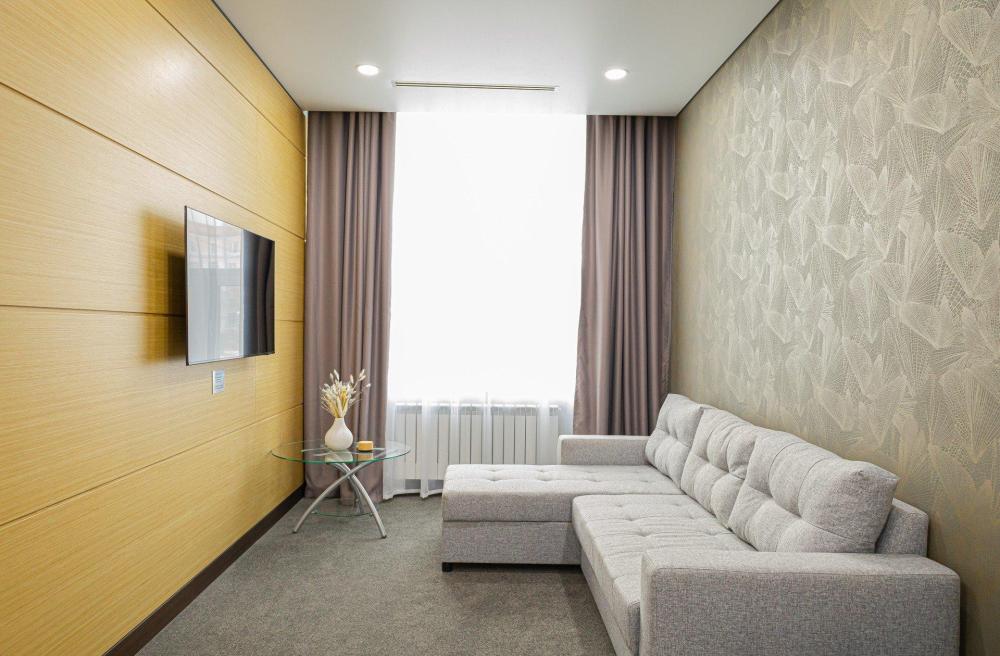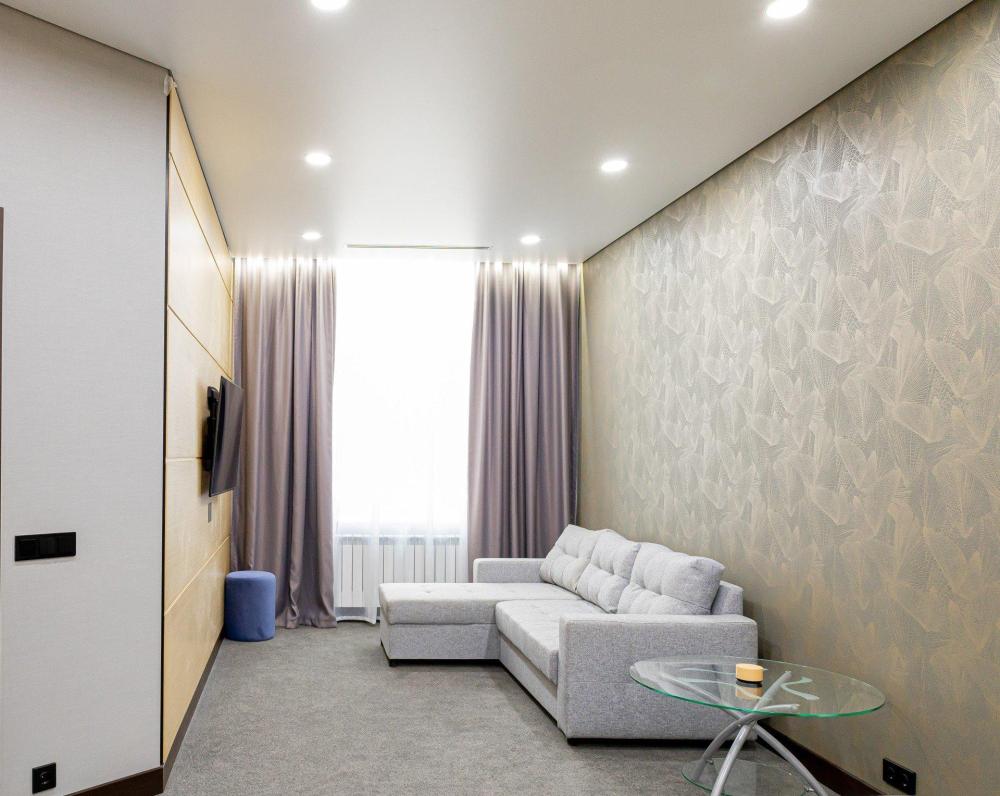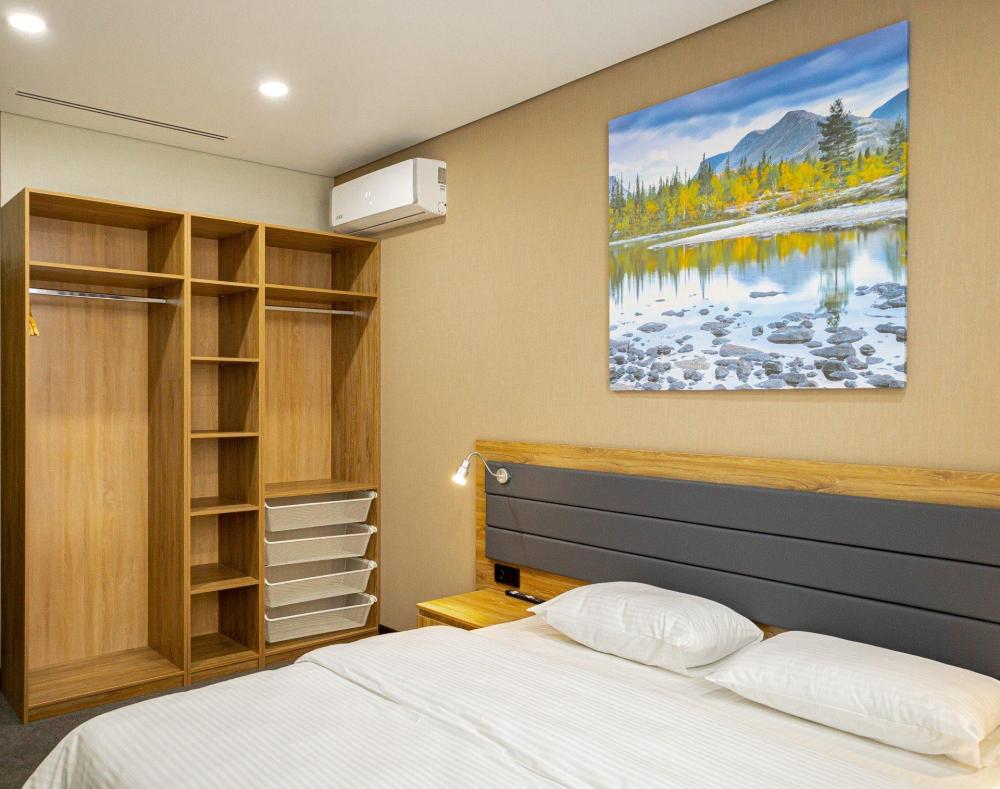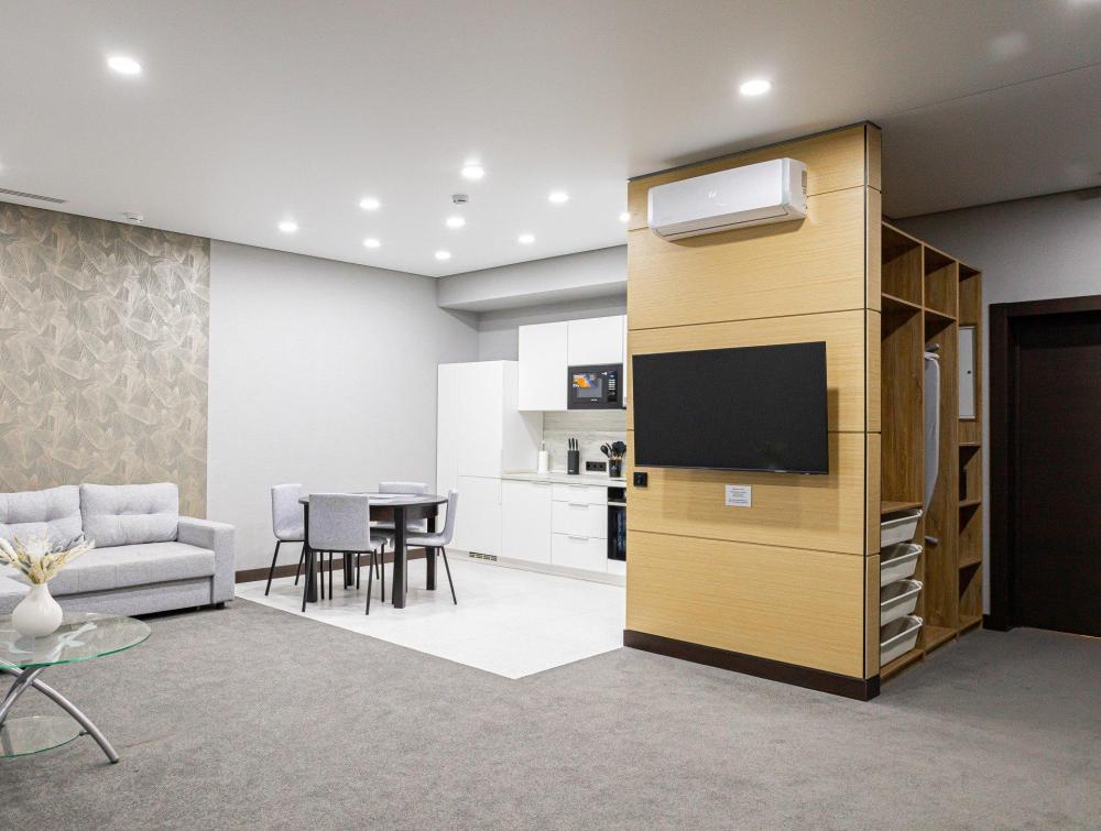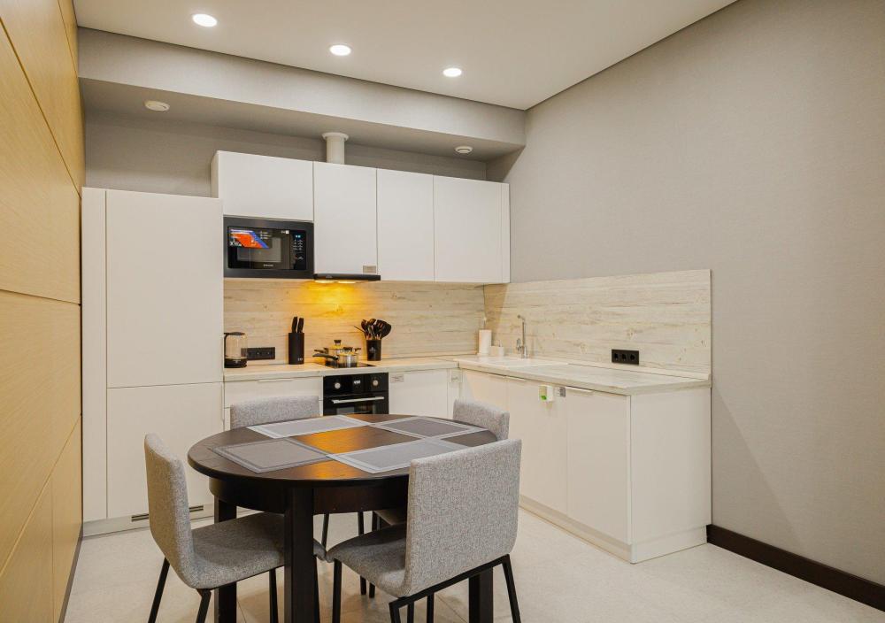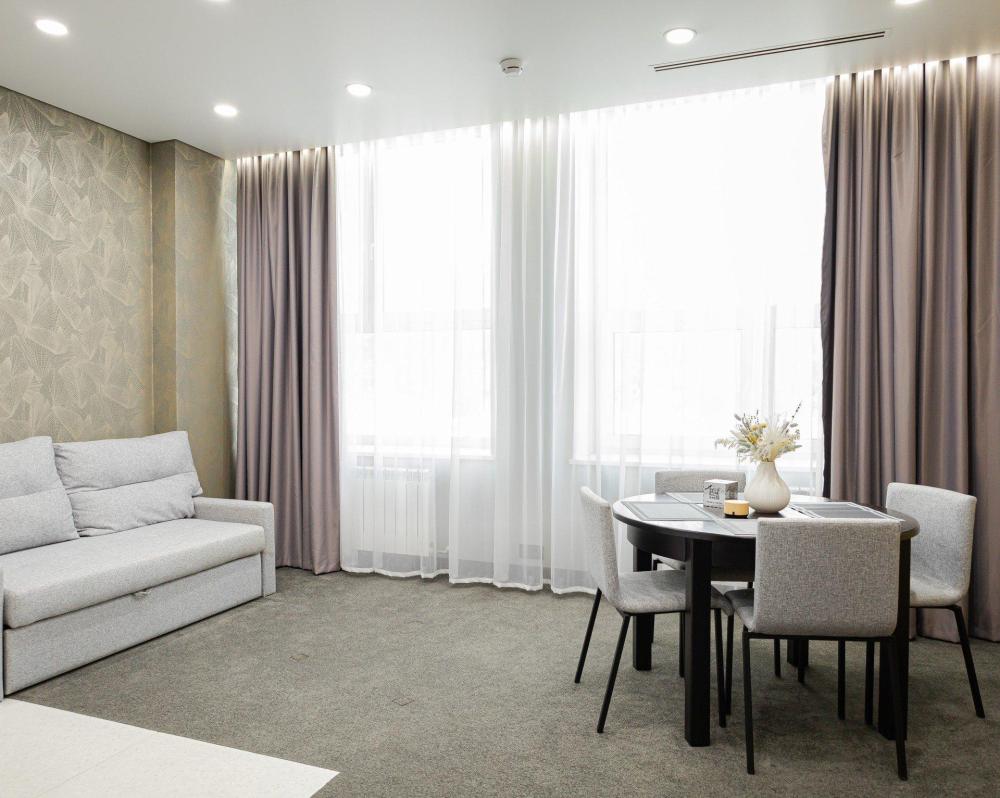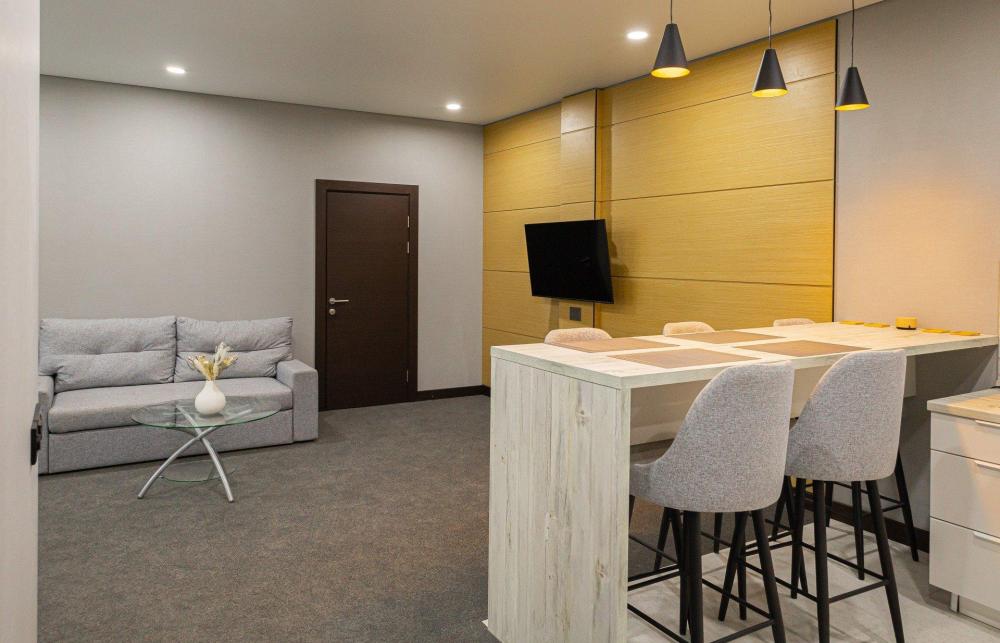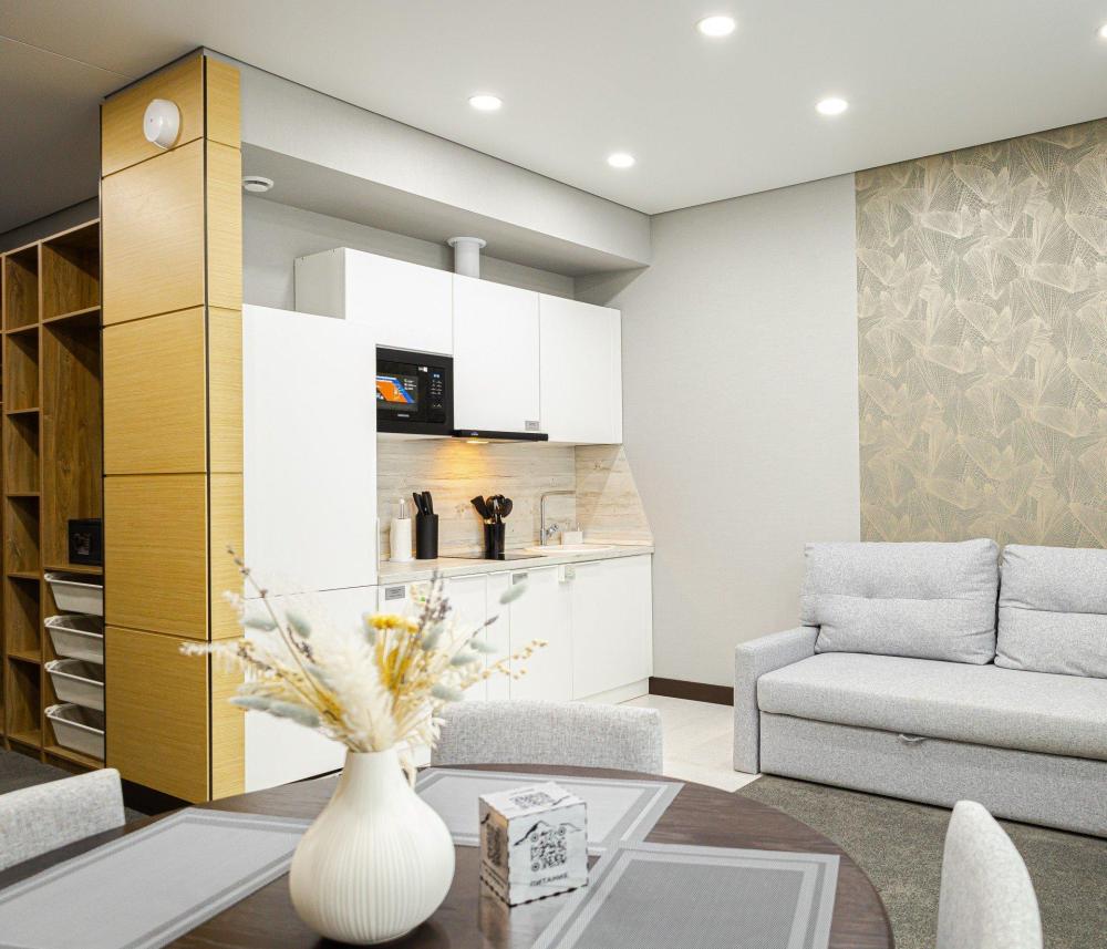 Апартаменты Стандарт. Современные однокомнатные номера, идеальный выбор для пары. Располагает спальней, гостиной, совмещенной с кухней, отдельной ванной комнатой с сауной и гостевым санузлом. Услуги в номере: Умная колонка Яндекс Станция Лайт с Алисой, кабельное ТВ, кухонные принадлежности, варочная панель, посудомоечная машина, стиральная машина, чайная станция, микроволновая печь, кондиционер, сейф, гладильная доска, утюг, халат, тапки, фен, полотенца, сауна, Wi-Fi. Обращаем Ваше внимание на то, что некоторые декоративные элементы не предоставляются в базовой комплектации и размещены в номерах исключительно для фотографий.