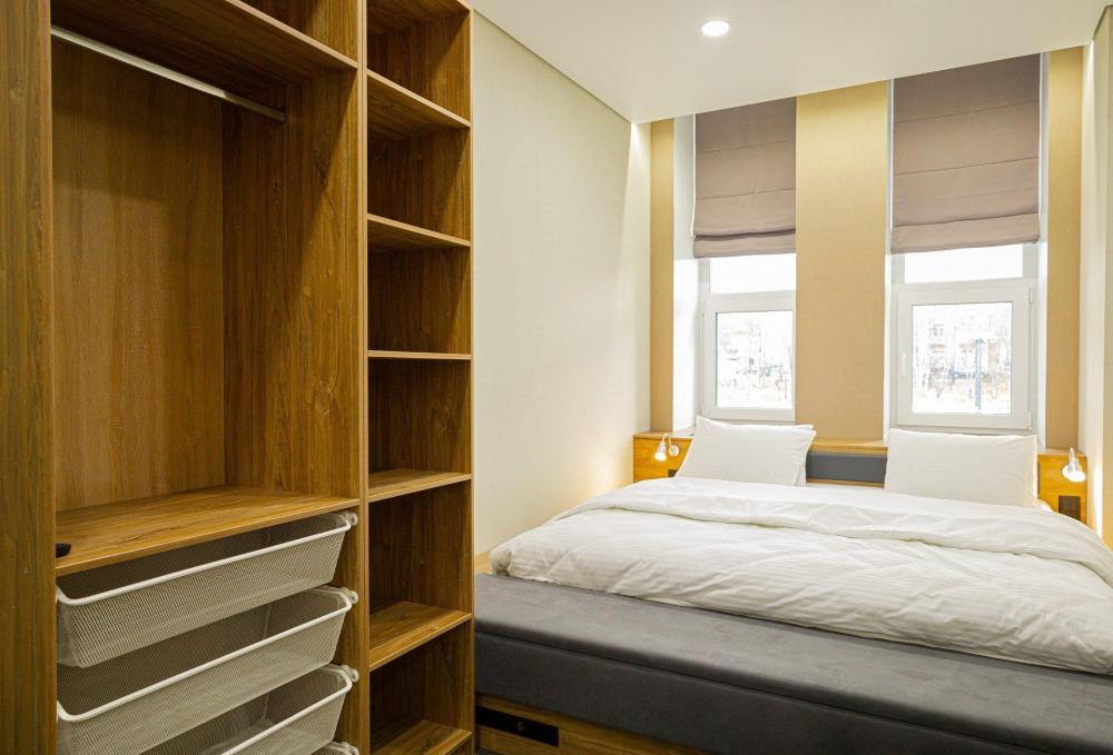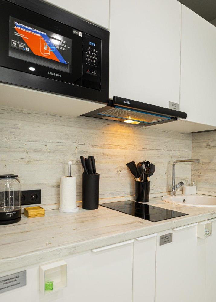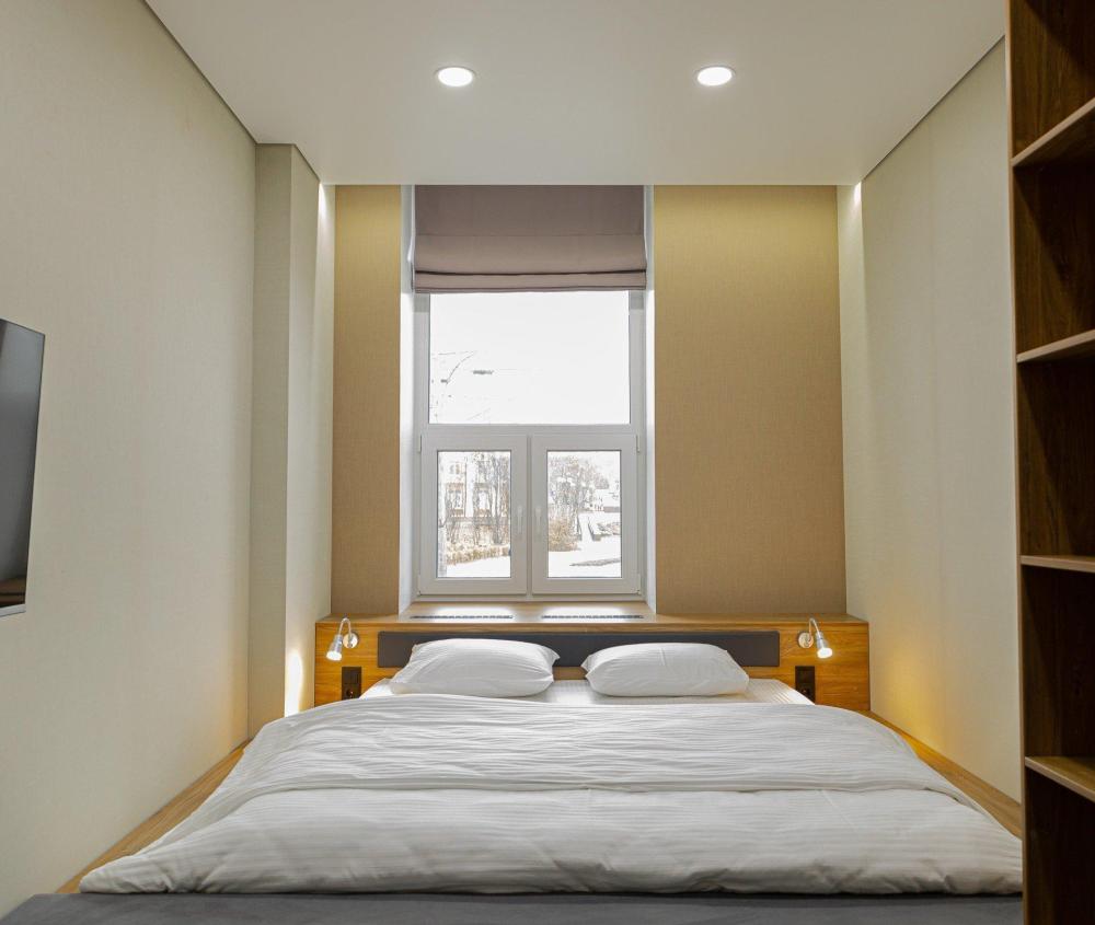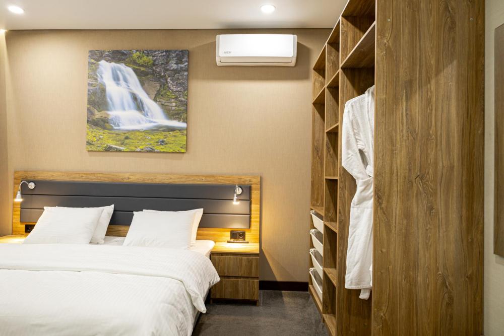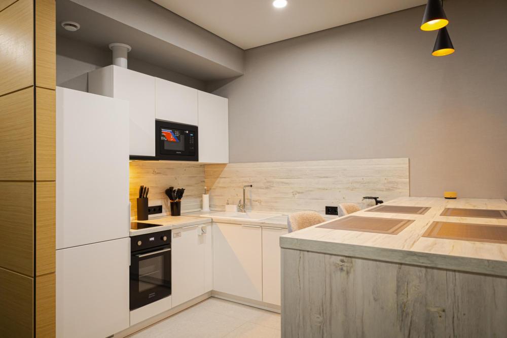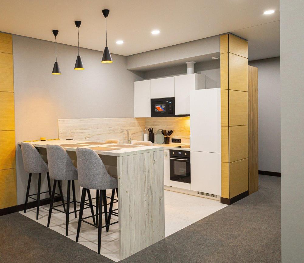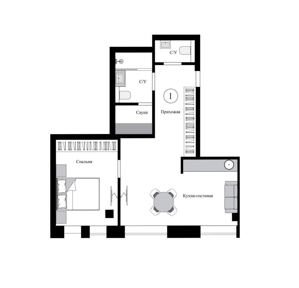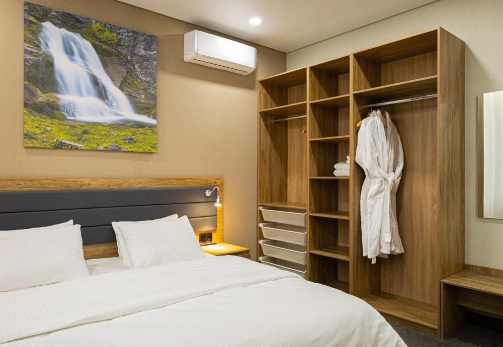 Апартаменты Стандарт. Современные однокомнатные номера, идеальный выбор для пары. Располагает спальней, гостиной, совмещенной с кухней, отдельной ванной комнатой с сауной и гостевым санузлом. Услуги в номере: Умная колонка Яндекс Станция Лайт с Алисой, кабельное ТВ, кухонные принадлежности, варочная панель, посудомоечная машина, стиральная машина, чайная станция, микроволновая печь, кондиционер, сейф, гладильная доска, утюг, халат, тапки, фен, полотенца, сауна, Wi-Fi. Обращаем Ваше внимание на то, что некоторые декоративные элементы не предоставляются в базовой комплектации и размещены в номерах исключительно для фотографий.