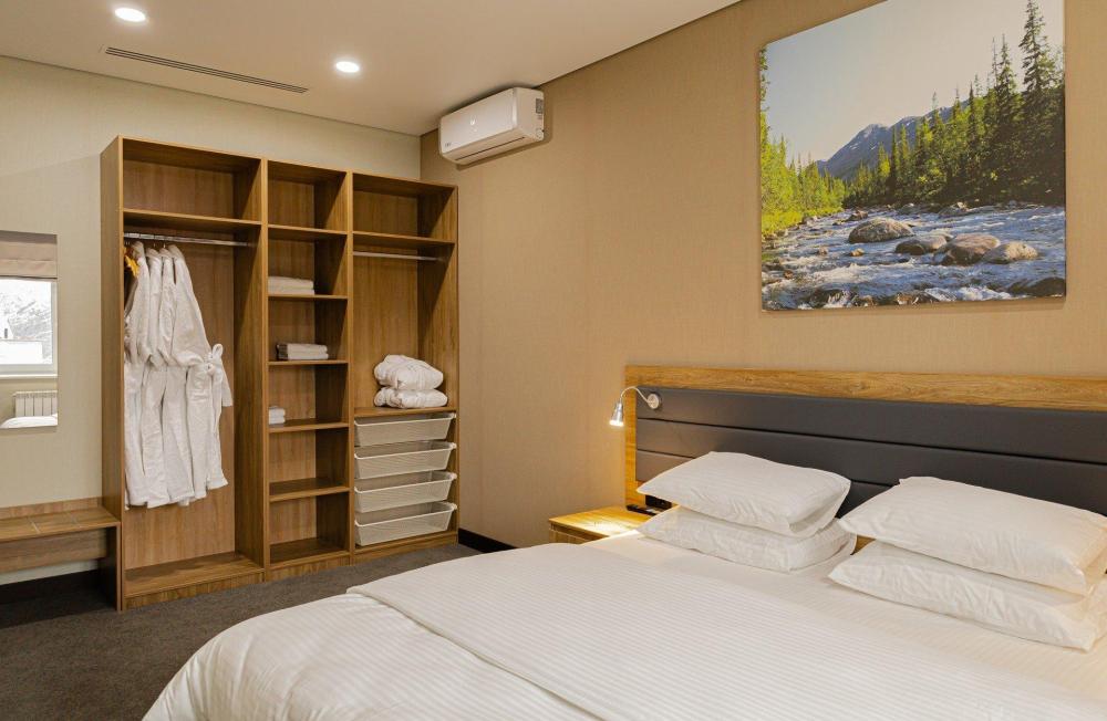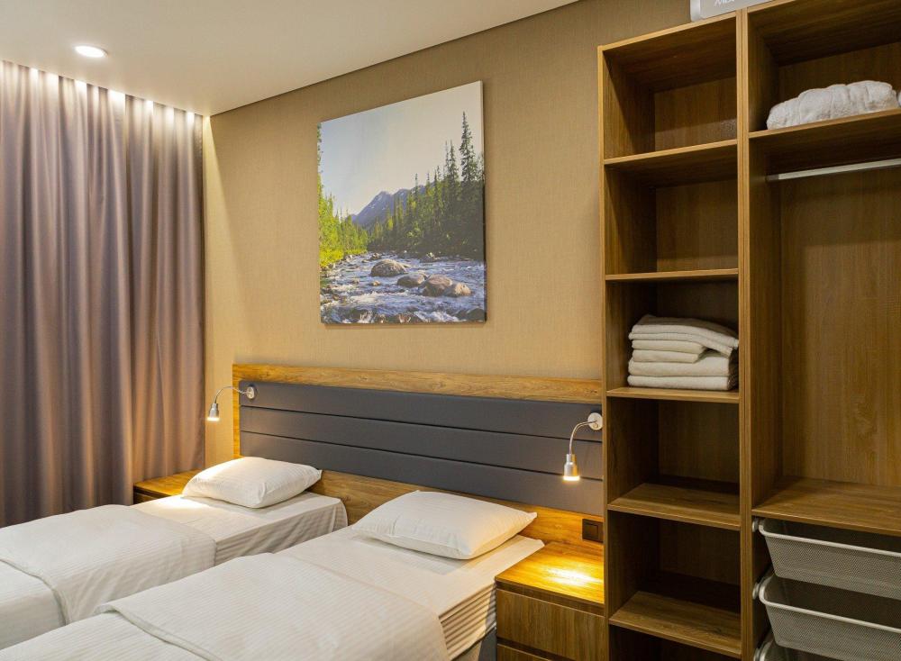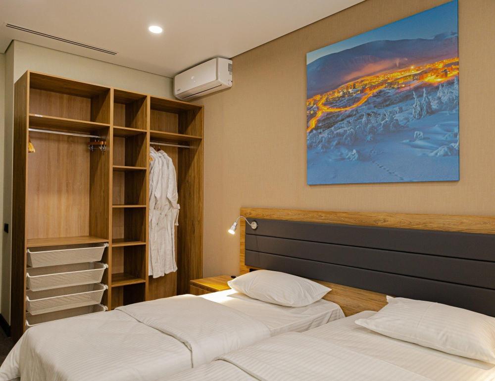Апартаменты Комфорт. Стильные и просторные двухкомнатные номера станут основой полноценного отдыха благодаря удобной планировке номера. Интерьер обеих комнат создан для комфортного размещения семьи или небольшой компании. Номера располагают гостиной, совмещенной с кухней, 2 спальнями, отдельной ванной комнатой с сауной и гостевым санузлом. Услуги в номере: Умная колонка Яндекс Станция Лайт с Алисой, кабельное ТВ, кухонные принадлежности, варочная панель, духовой шкаф, посудомоечная машина, стиральная машина, чайная станция, микроволновая печь, кондиционер, сейф, гладильная доска, утюг, халат, тапки, фен, полотенца, сауна, Wi-Fi. Обращаем Ваше внимание на то, что некоторые декоративные элементы не предоставляются в базовой комплектации и размещены в номерах исключительно для фотографий.