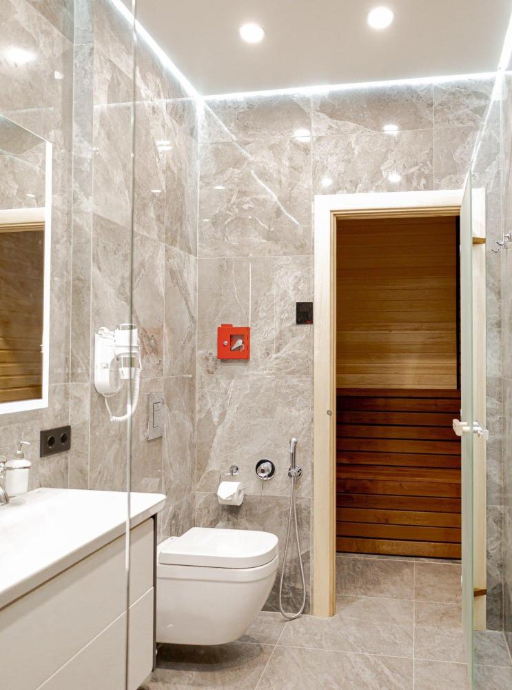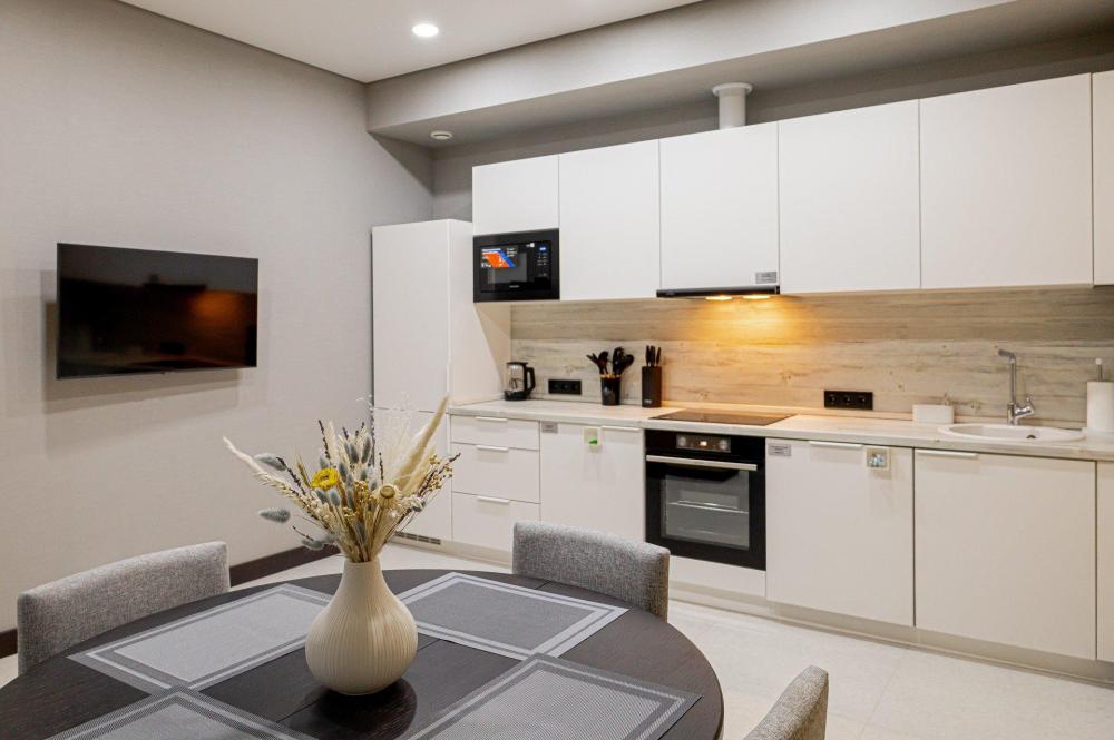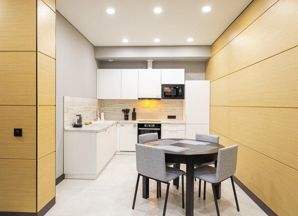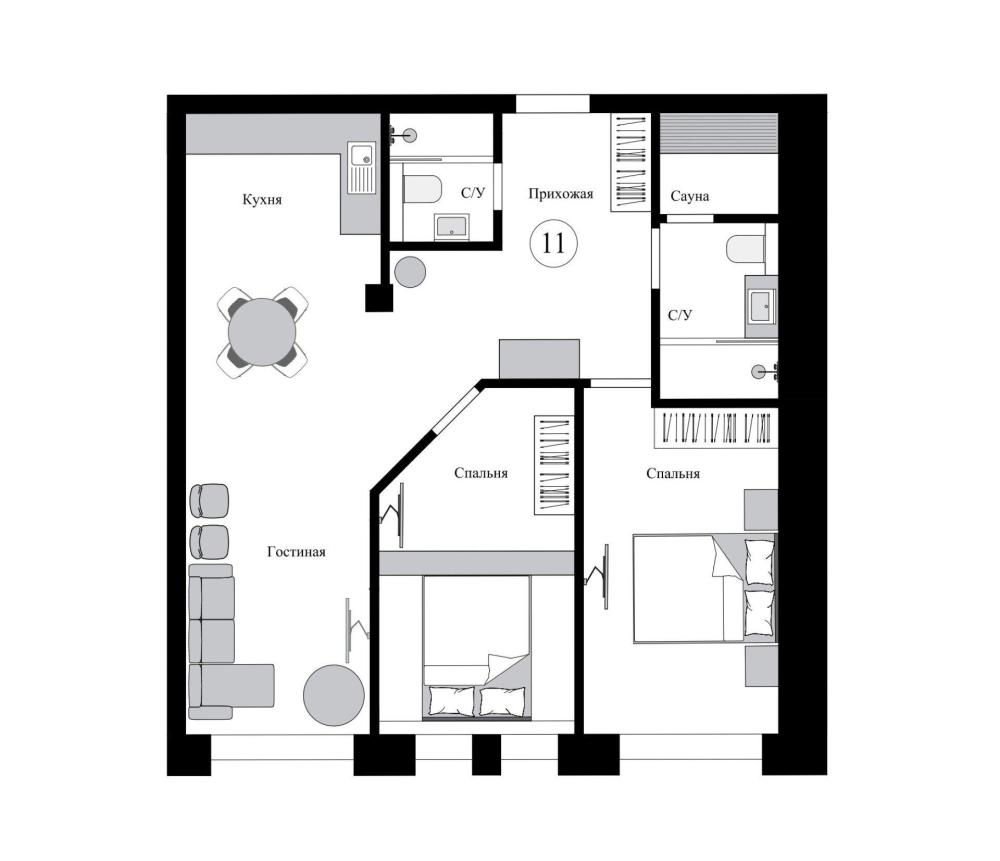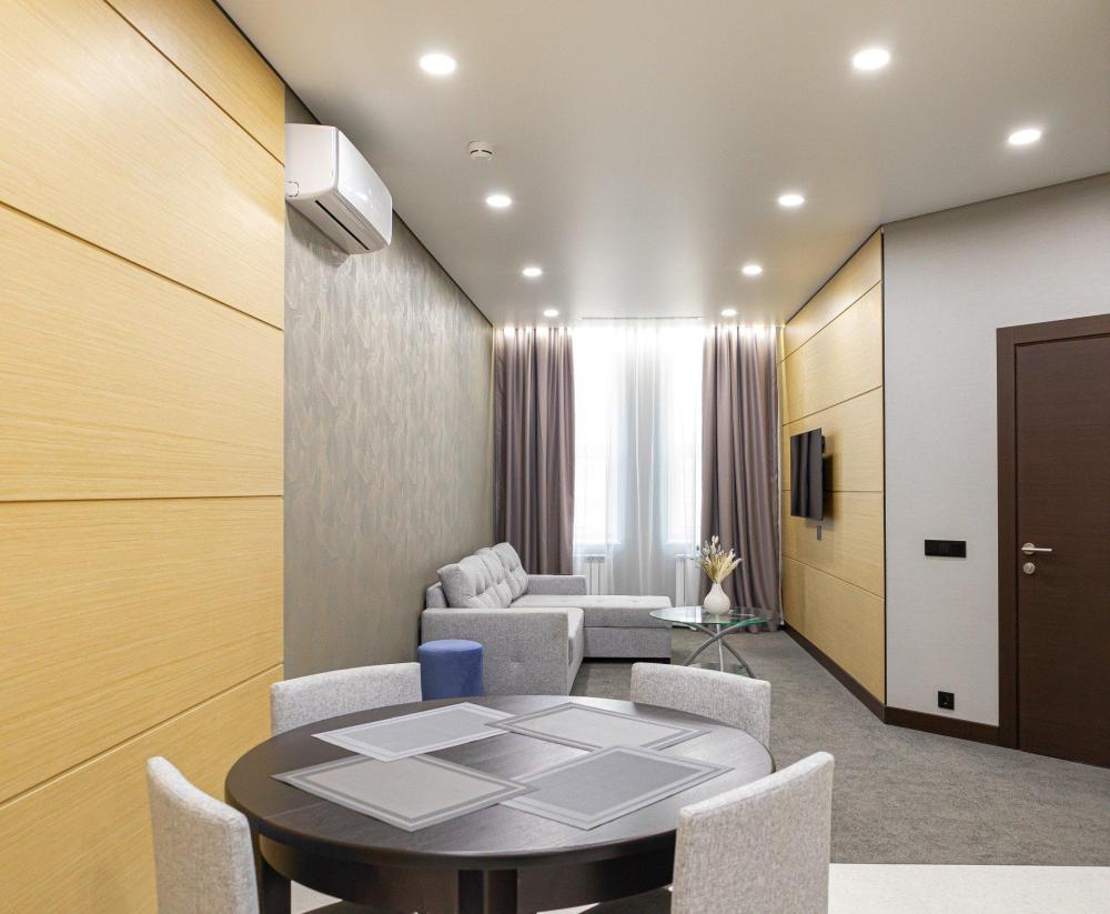 Апартаменты Комфорт + 011. Современный номер повышенной комфортности, светлый и просторный, имеет все необходимое для комфортного длительного проживания. Располагает просторной гостиной, совмещенной с кухней, 2 спальнями, отдельной ванной комнатой с сауной и дополнительной гостевой ванной комнатой. Услуги в номере: Умная колонка Яндекс Станция Лайт с Алисой, кабельное ТВ, кухонные принадлежности, варочная панель, духовой шкаф, посудомоечная машина, стиральная машина, чайная станция, микроволновая печь, кондиционер, сейф, гладильная доска, утюг, халат, тапки, фен, полотенца, сауна, Wi-Fi. Обращаем Ваше внимание на то, что некоторые декоративные элементы не предоставляются в базовой комплектации и размещены в номерах исключительно для фотографий.