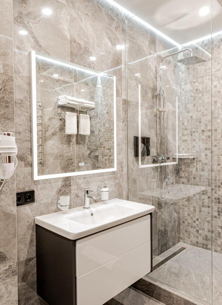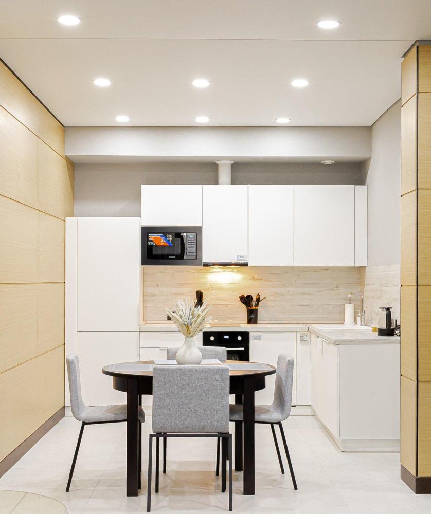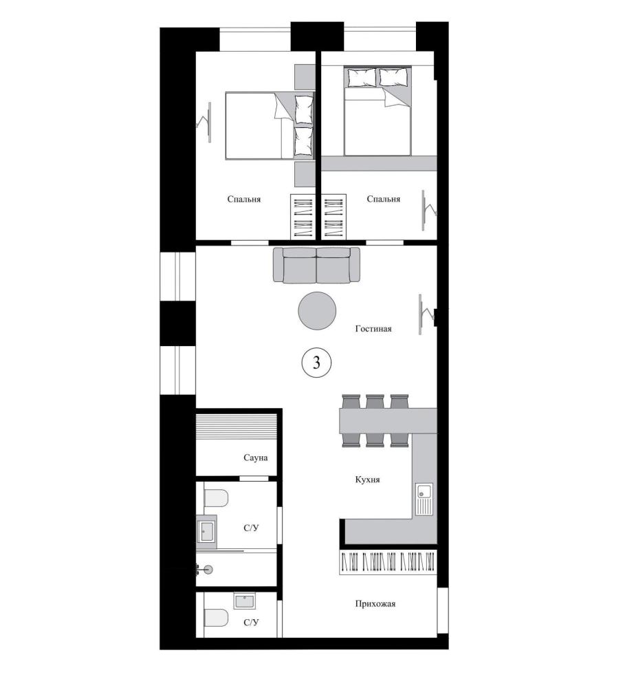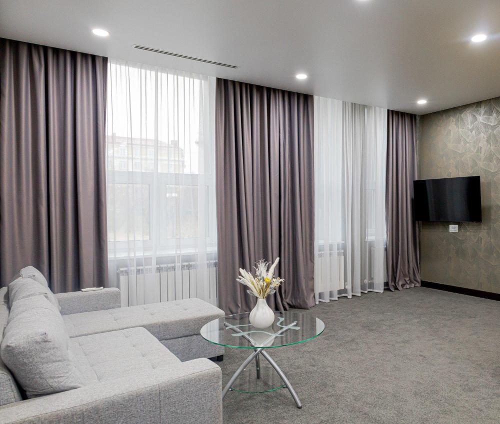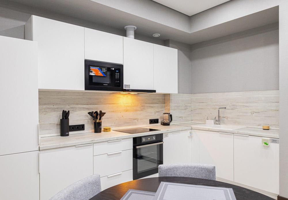 Апартаменты Комфорт + 011. Современный номер повышенной комфортности, светлый и просторный, имеет все необходимое для комфортного длительного проживания. Располагает просторной гостиной, совмещенной с кухней, 2 спальнями, отдельной ванной комнатой с сауной и дополнительной гостевой ванной комнатой. Услуги в номере: Умная колонка Яндекс Станция Лайт с Алисой, кабельное ТВ, кухонные принадлежности, варочная панель, духовой шкаф, посудомоечная машина, стиральная машина, чайная станция, микроволновая печь, кондиционер, сейф, гладильная доска, утюг, халат, тапки, фен, полотенца, сауна, Wi-Fi. Обращаем Ваше внимание на то, что некоторые декоративные элементы не предоставляются в базовой комплектации и размещены в номерах исключительно для фотографий.
