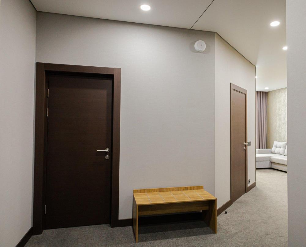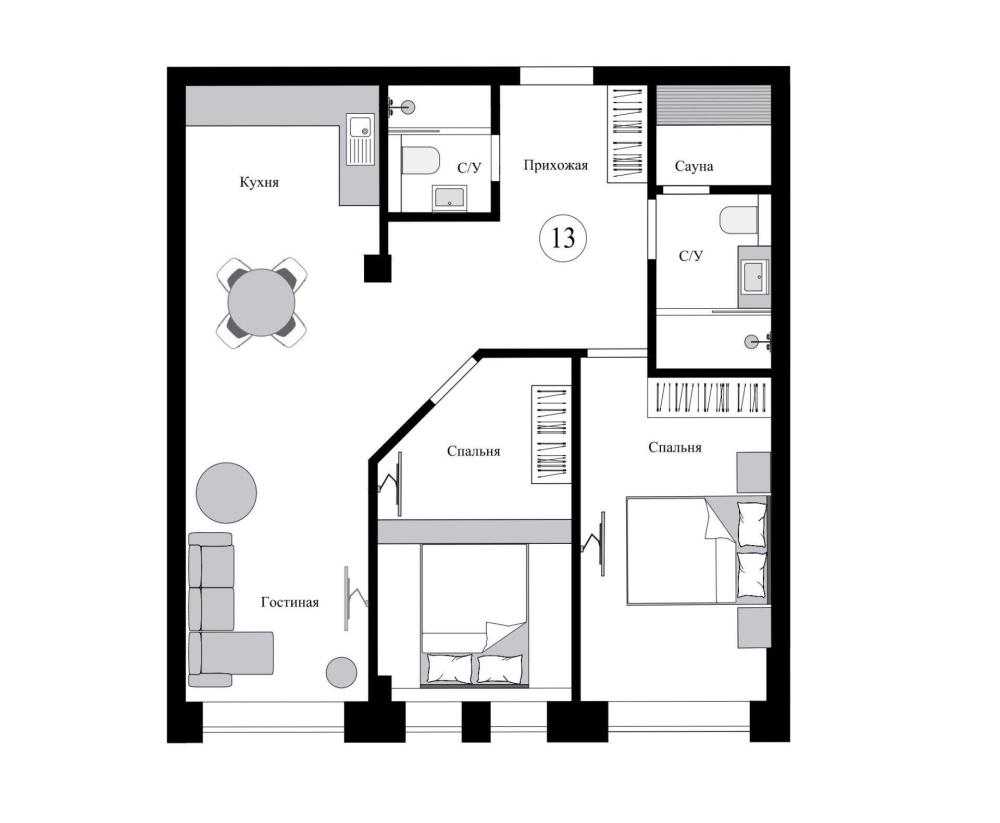 Апартаменты Комфорт + 013. Современный номер повышенной комфортности, светлый и просторный, имеет все необходимое для комфортного длительного проживания. Располагает просторной гостиной, совмещенной с кухней, 2 спальнями, отдельной ванной комнатой с сауной и дополнительной гостевой ванной комнатой. Услуги в номере: Умная колонка Яндекс Станция Лайт с Алисой, кабельное ТВ, кухонные принадлежности, варочная панель, духовой шкаф, посудомоечная машина, стиральная машина, чайная станция, микроволновая печь, кондиционер, сейф, гладильная доска, утюг, халат, тапки, фен, полотенца, сауна, Wi-Fi. Обращаем Ваше внимание на то, что некоторые декоративные элементы не предоставляются в базовой комплектации и размещены в номерах исключительно для фотографий.