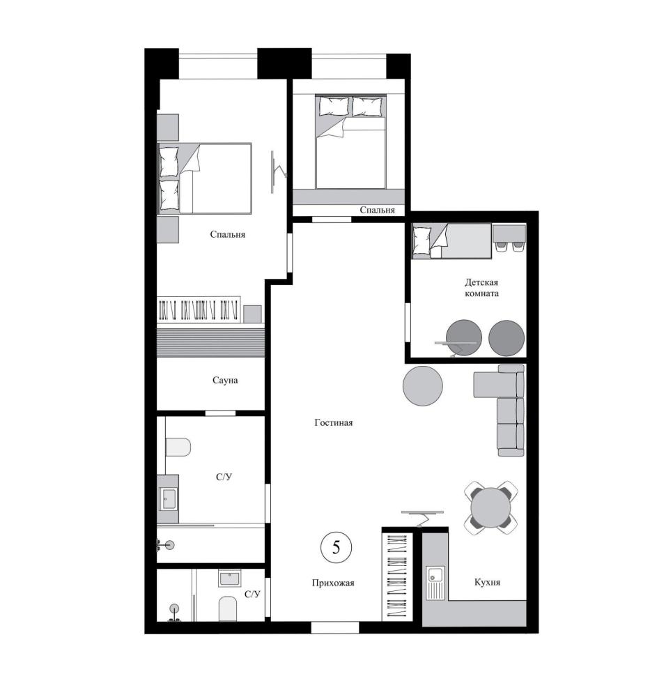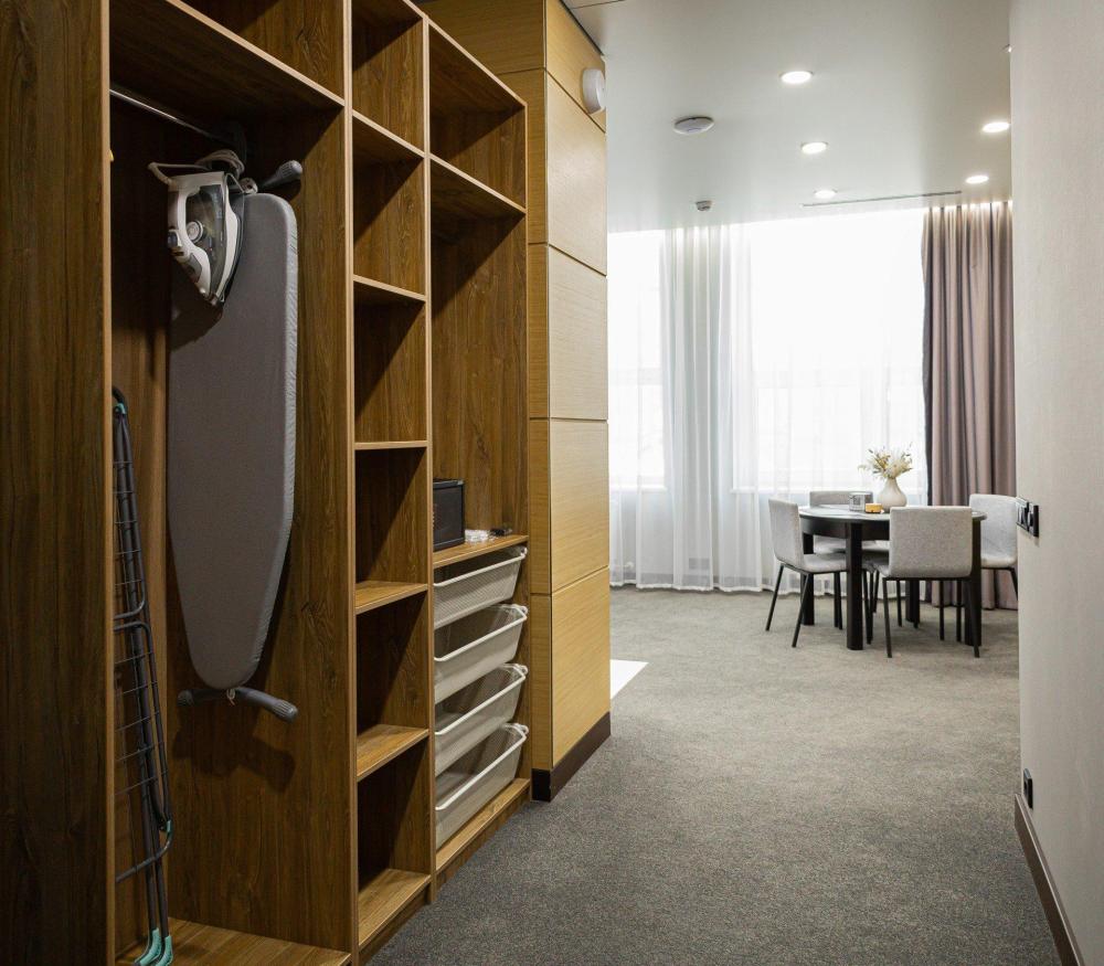 Апартаменты Премьер + 005. Номер отличается элегантным стилем. Гостиная, совмещенная с кухней соседствует со светлыми спальнями, что представляет собой идеальное решение для долговременного проживания. А возможность размещения в детской комнате с двухъярусной детской кроватью делает номер замечательным местом для семейного отдыха. Просторный номер с отдельной ванной комнатой с сауной и дополнительной гостевой ванной комнатой. Услуги в номере: Умная колонка Яндекс Станция Лайт с Алисой, кабельное ТВ, кухонные принадлежности, варочная панель, духовой шкаф, посудомоечная машина, стиральная машина, чайная станция, микроволновая печь, кондиционер, сейф, гладильная доска, утюг, халат, тапки, фен, полотенца, сауна, Wi-Fi. Обращаем Ваше внимание на то, что некоторые декоративные элементы не предоставляются в базовой комплектации и размещены в номерах исключительно для фотографий.
